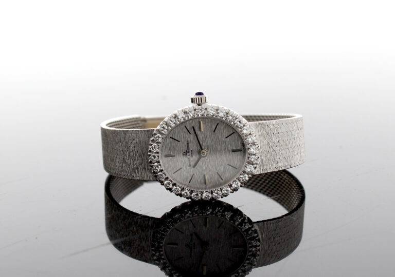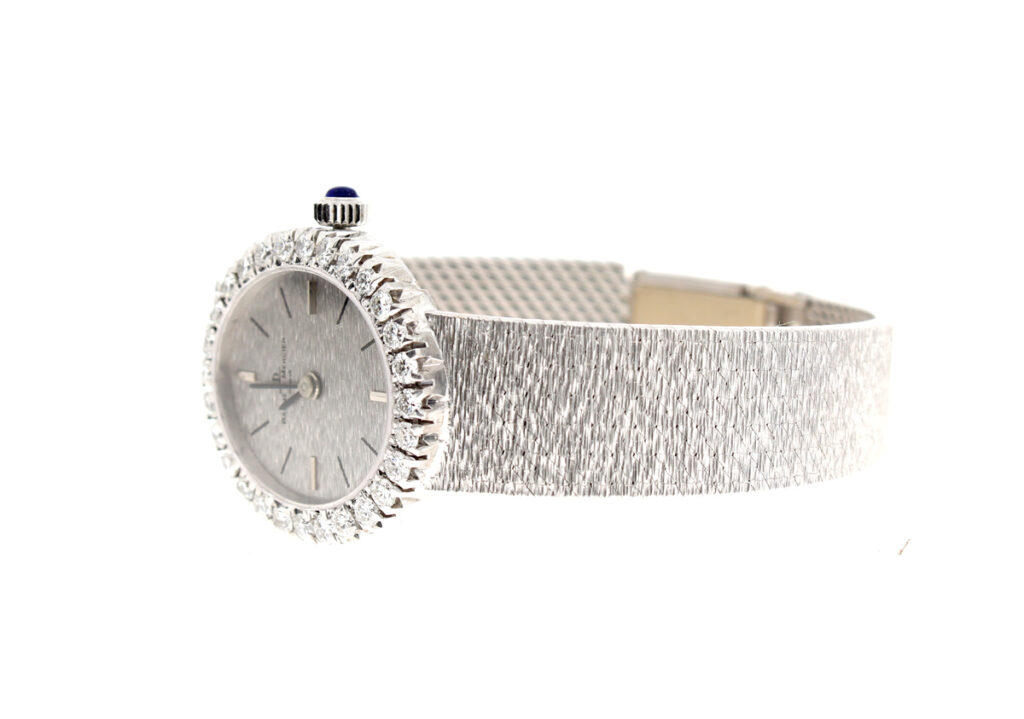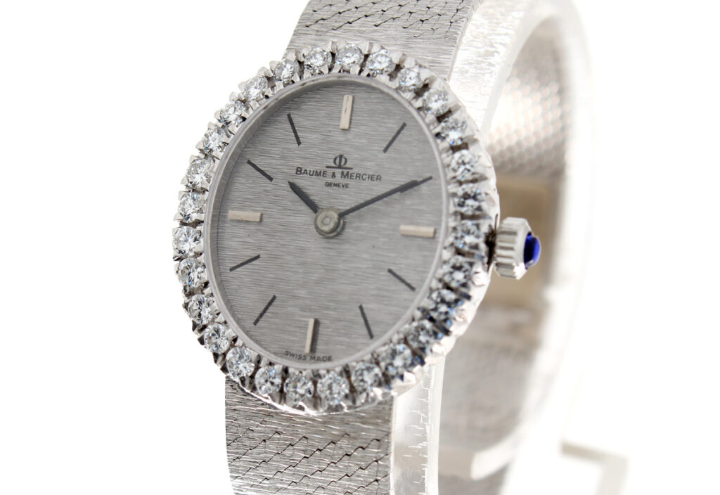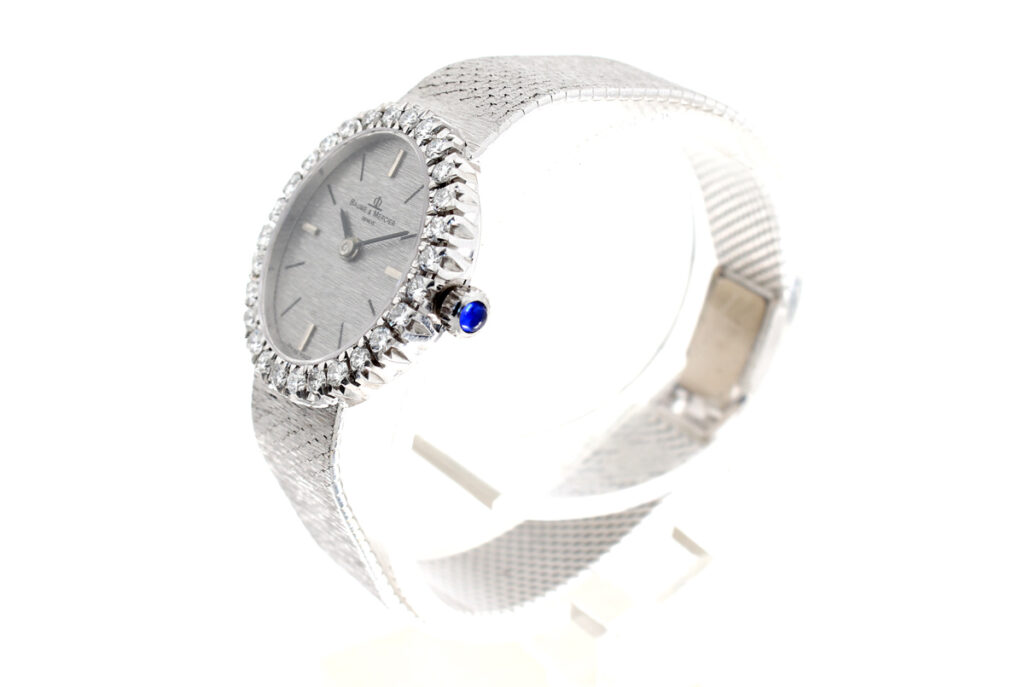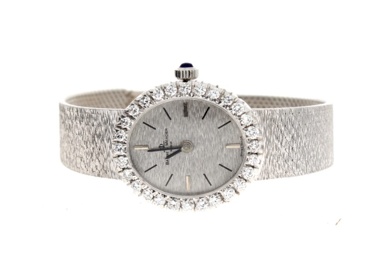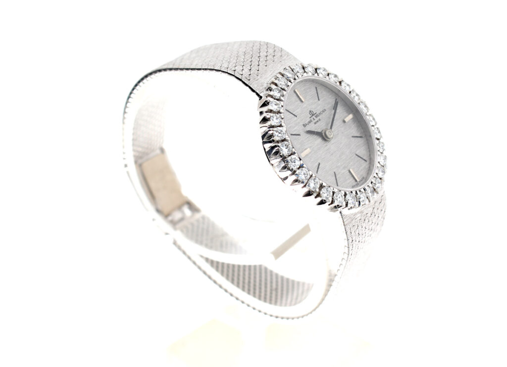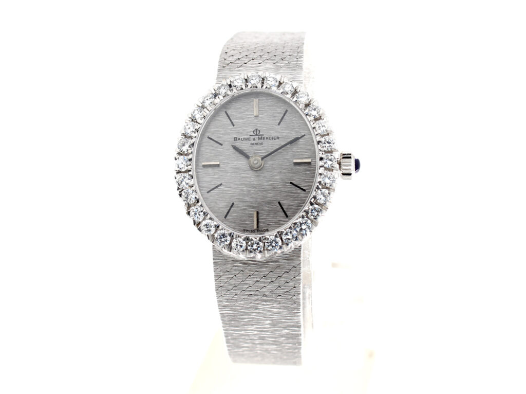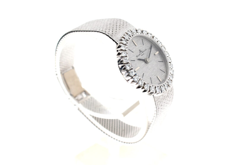 BAUME MERCIER Damenuhr mit 18-Karat Weißgoldband- und Gehäuse, Handaufzugswerk und Brillant-Kranz.