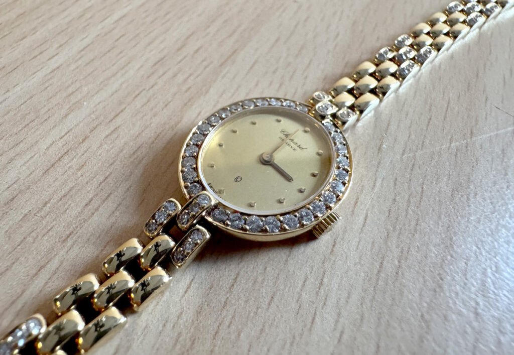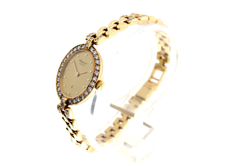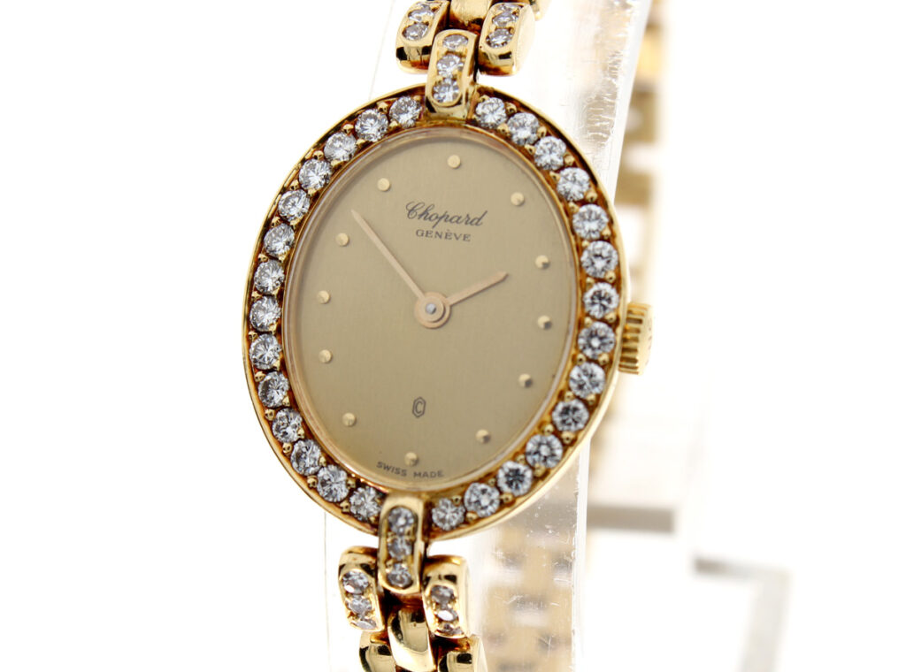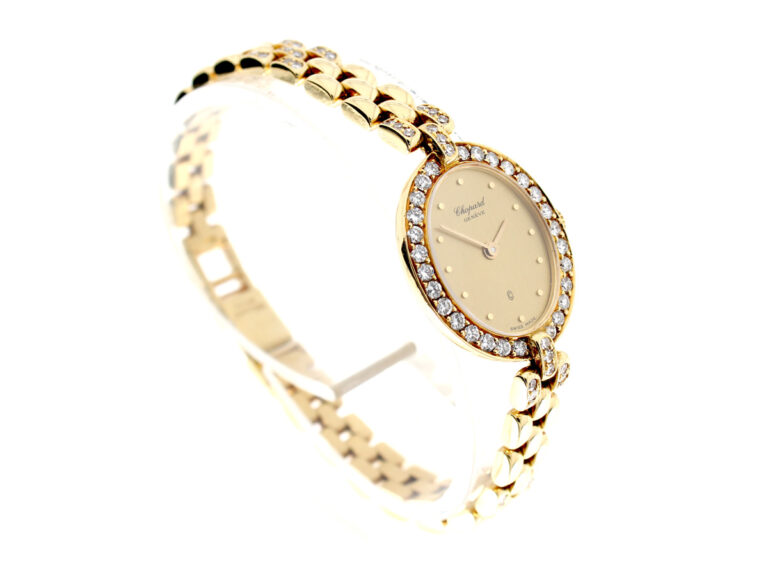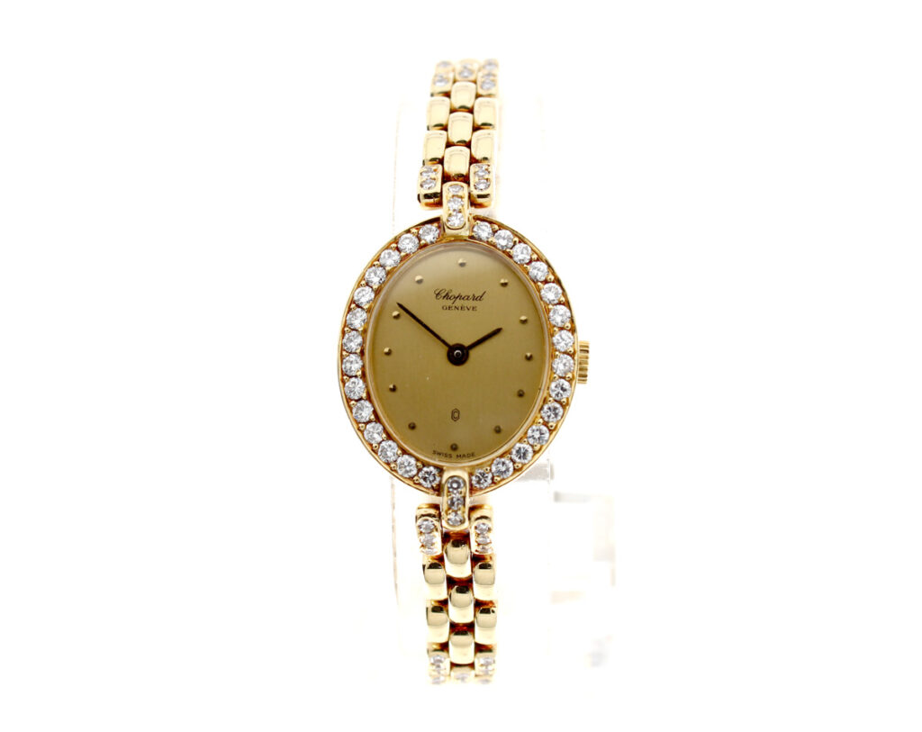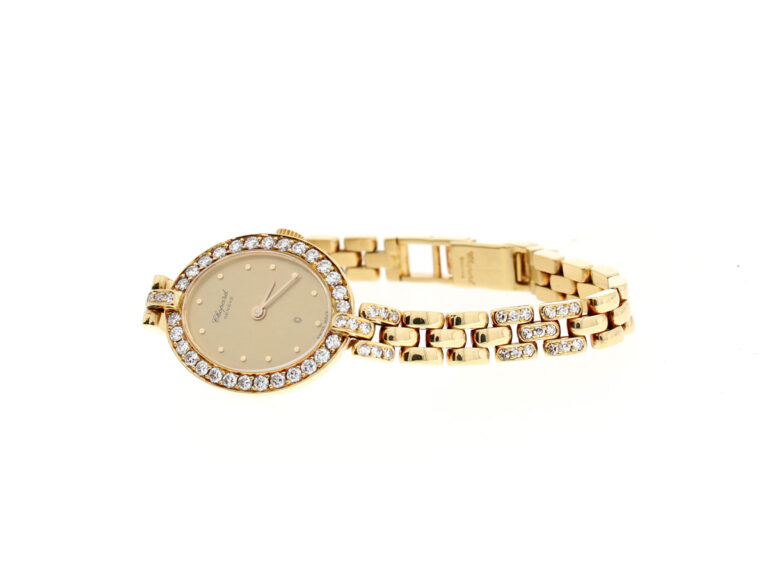 CHOPARD Damenuhr mit 18-Karat-Goldgehäuse und Diamant-Lünette, ETA-Quartzwerk und Diamantbesatz auf Armband.