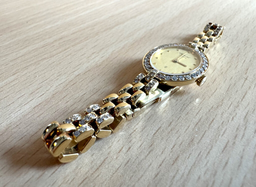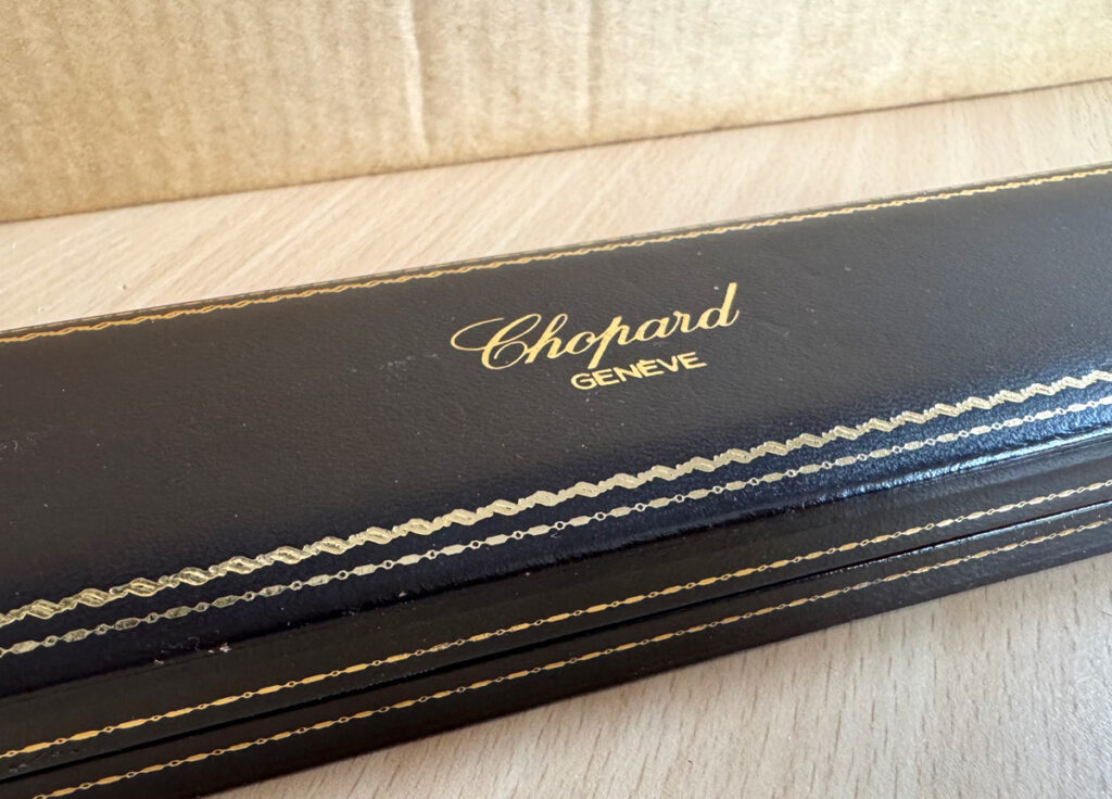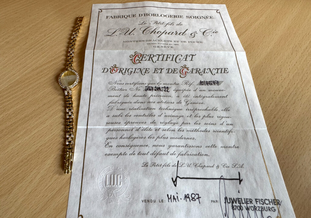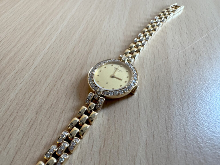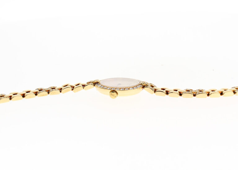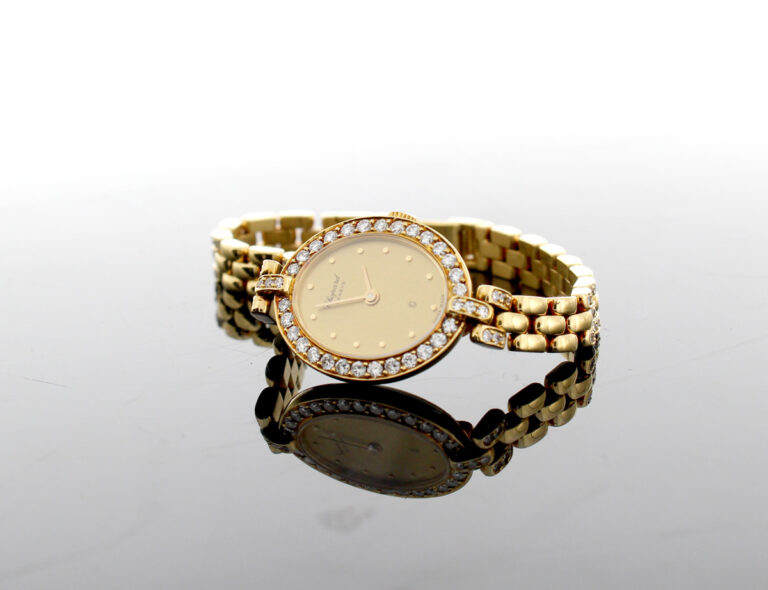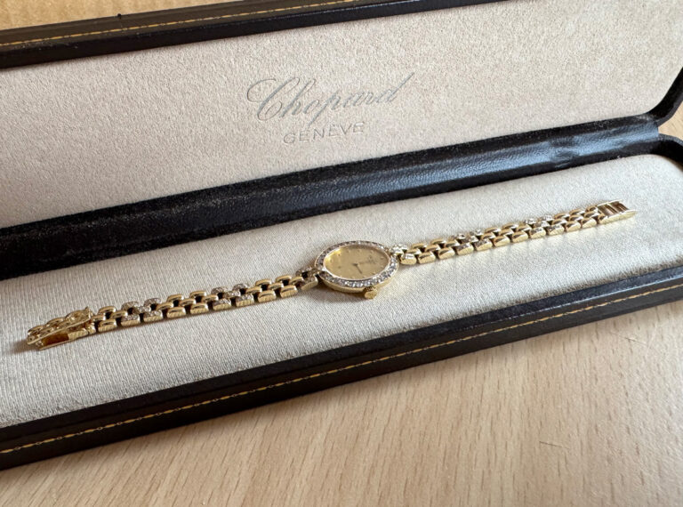 CHOPARD Damenuhr mit 18-Karat-Goldgehäuse und Diamant-Lünette, ETA-Quartzwerk und Diamantbesatz auf Armband.