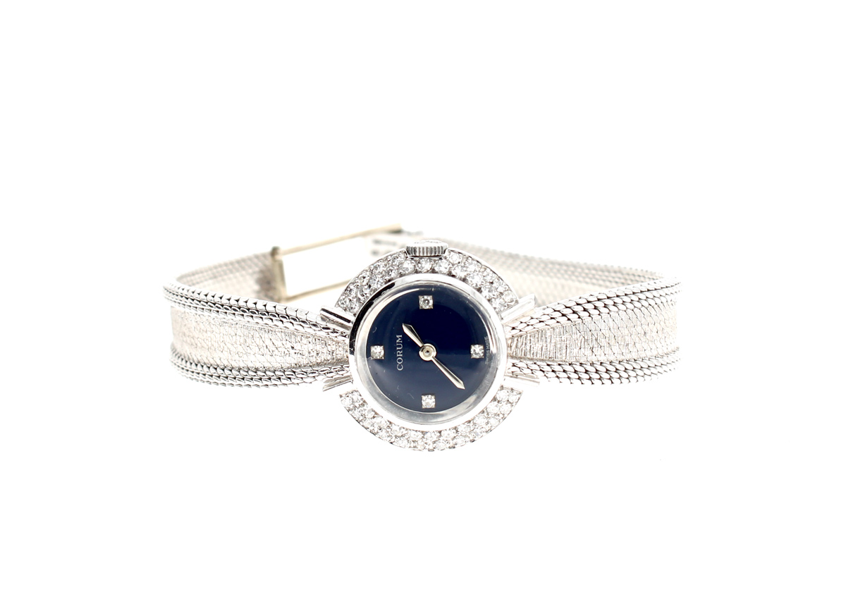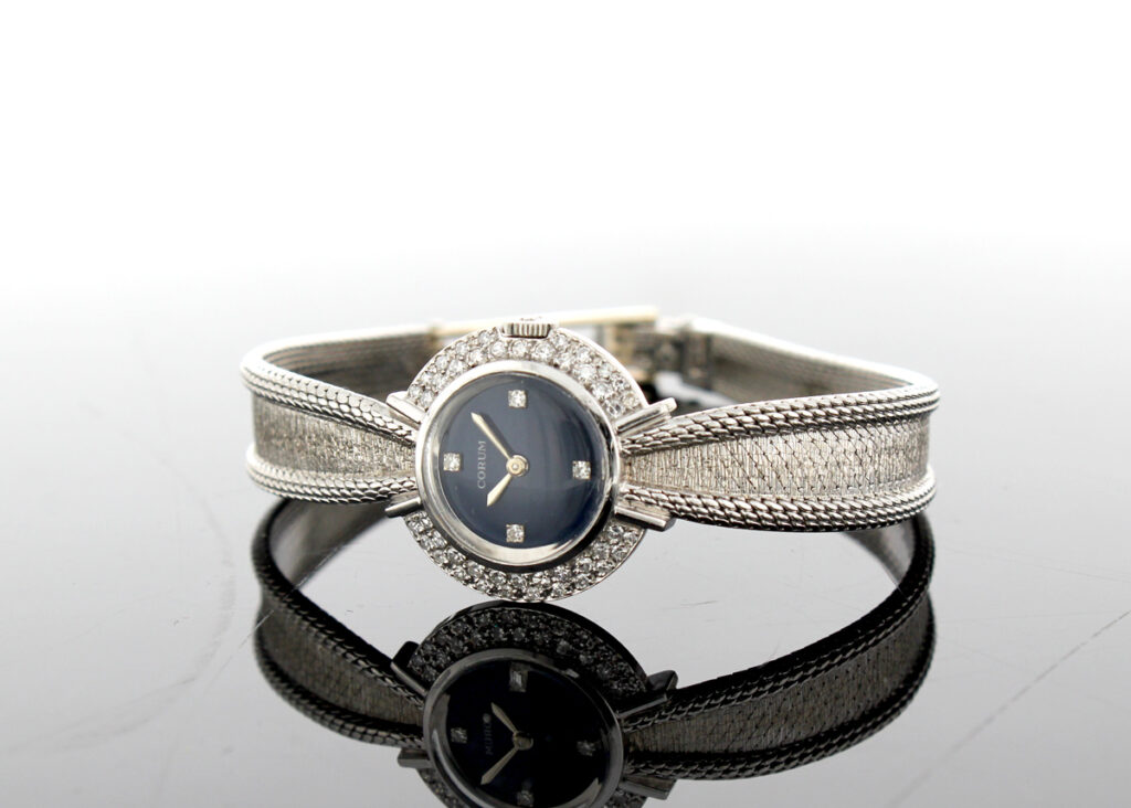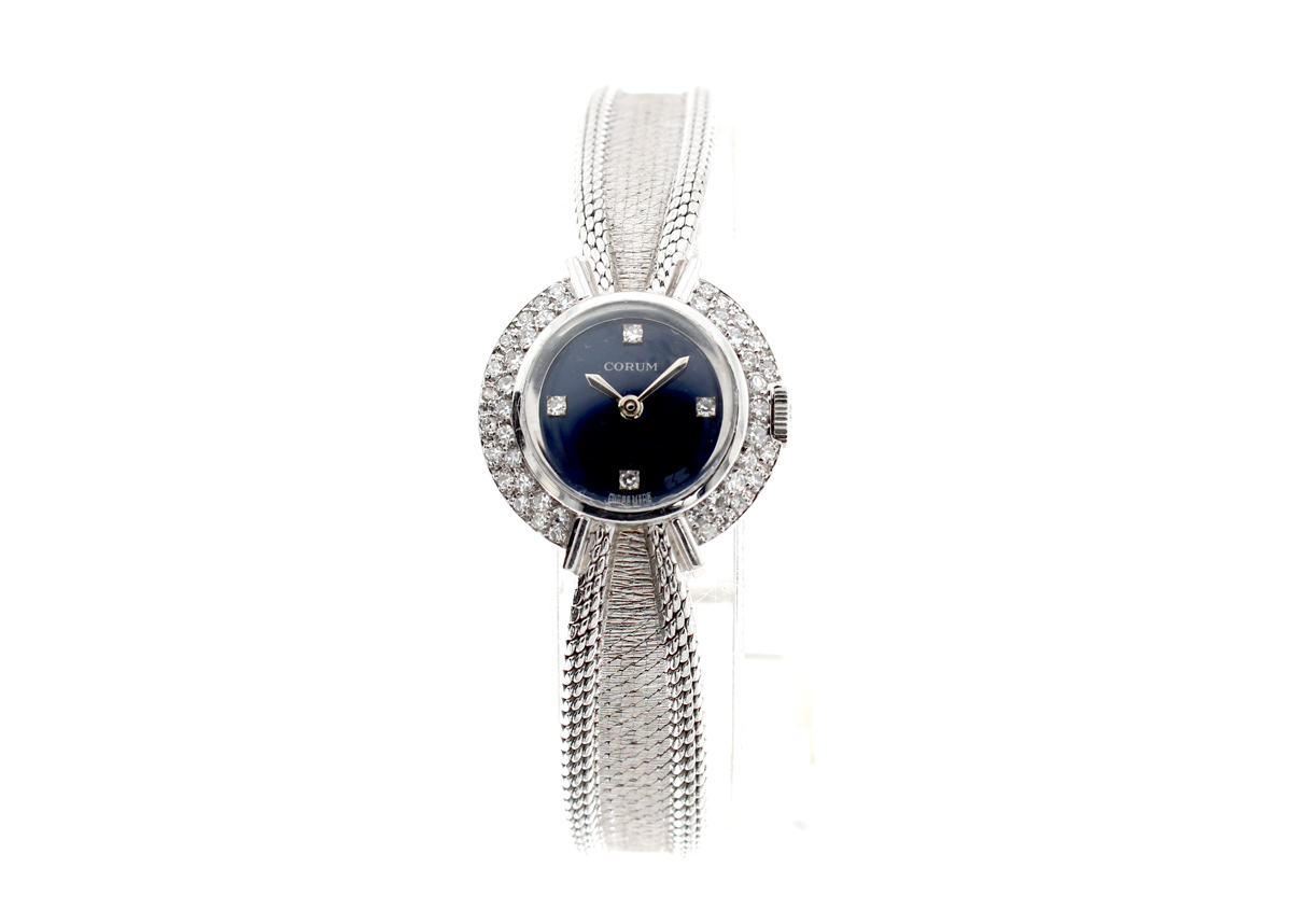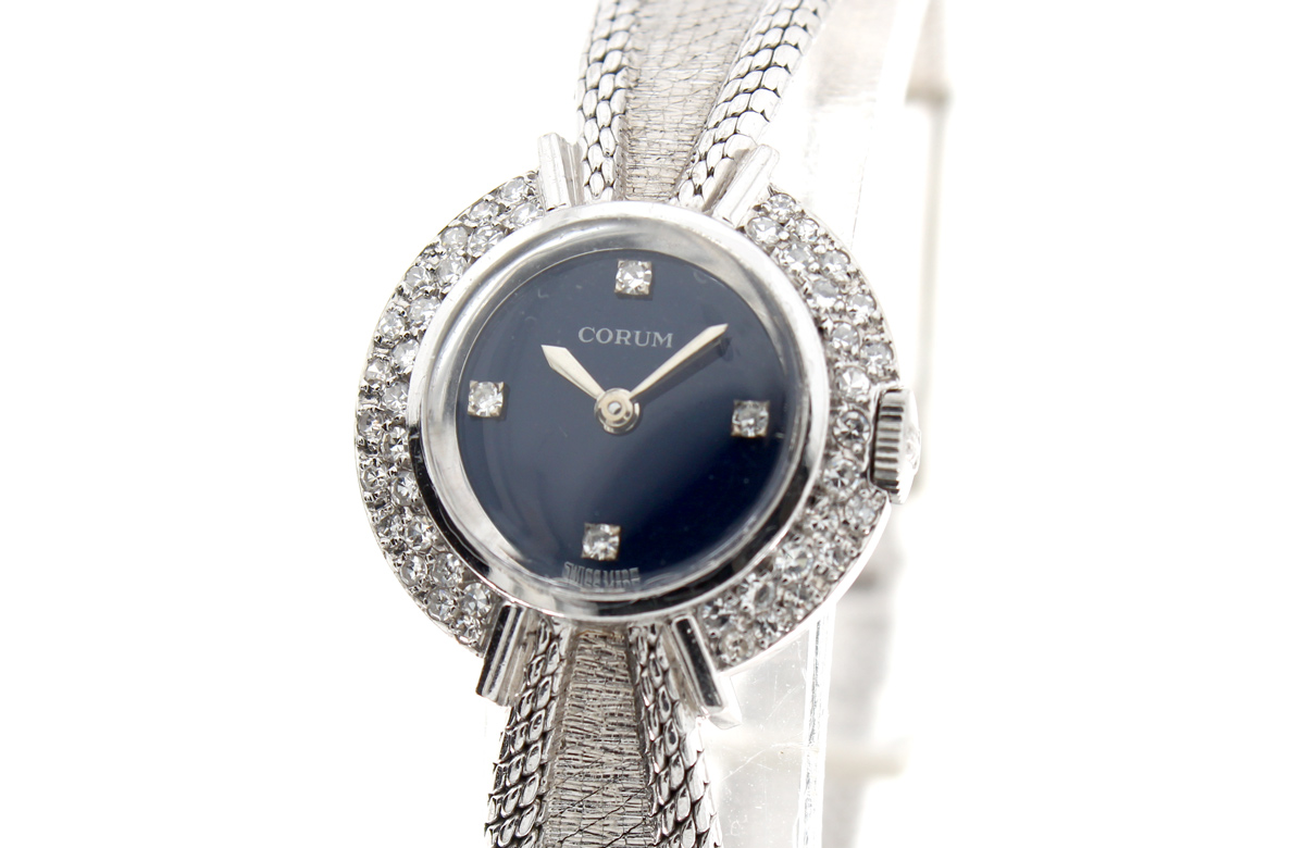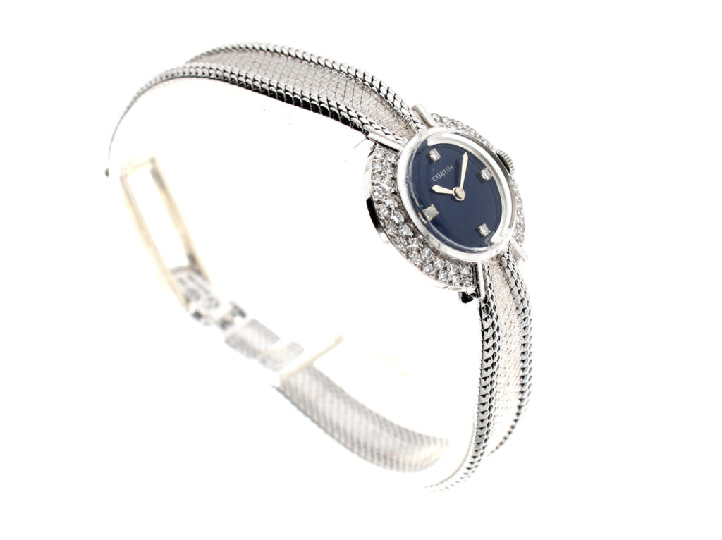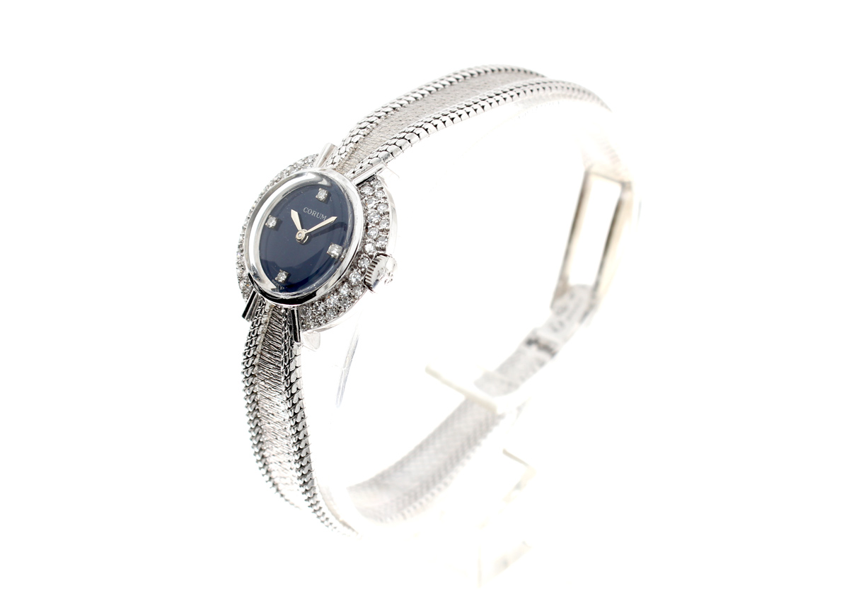 CORUM Schmuckbanduhr Damenuhr mit 18-Karat-Weißgoldgehäuse, Handaufzugswerk, 4 Diamanten im Ziffernblatt und mit Diamanten besetzte Lünette.