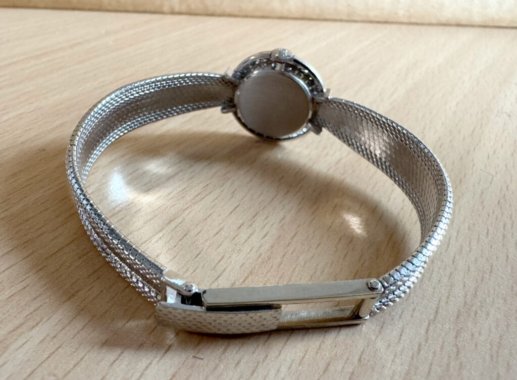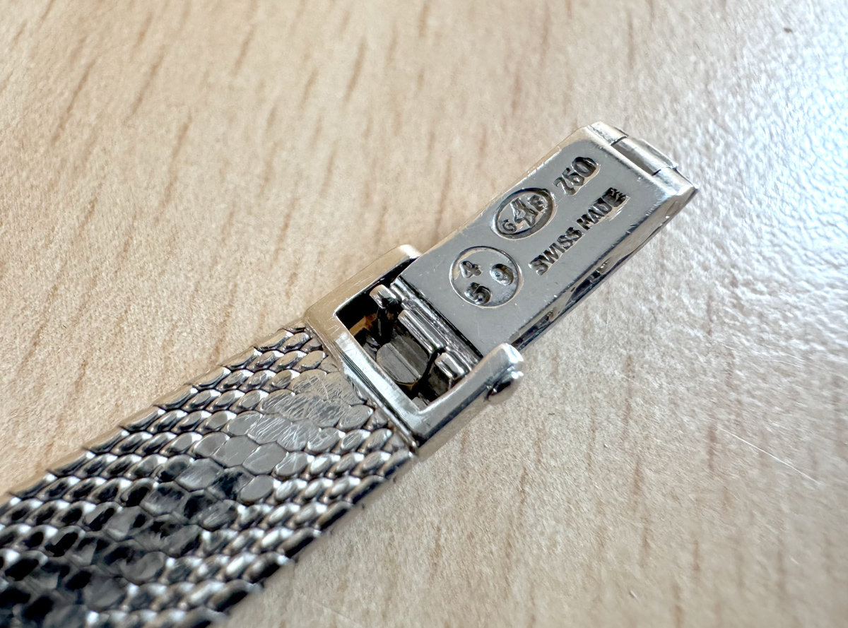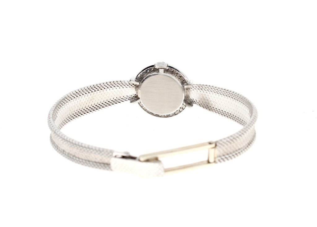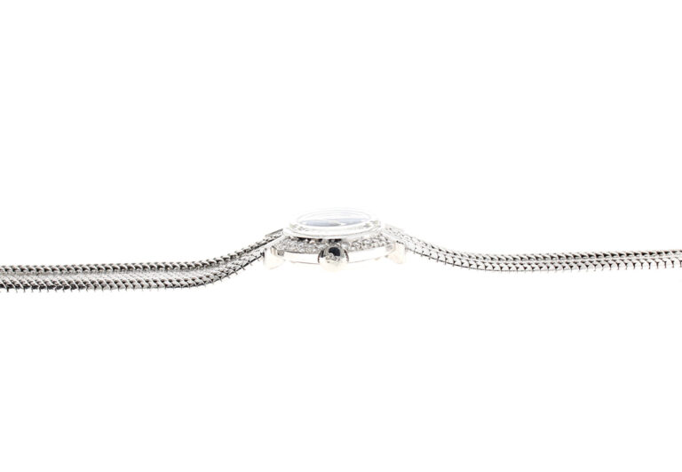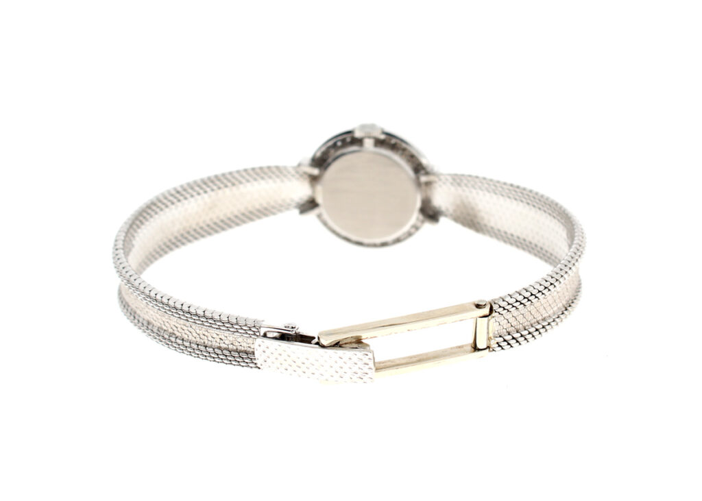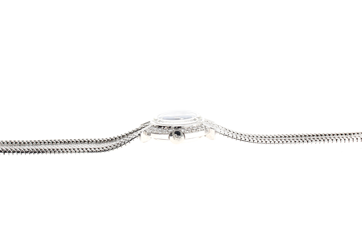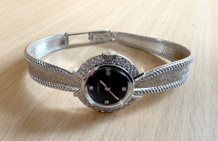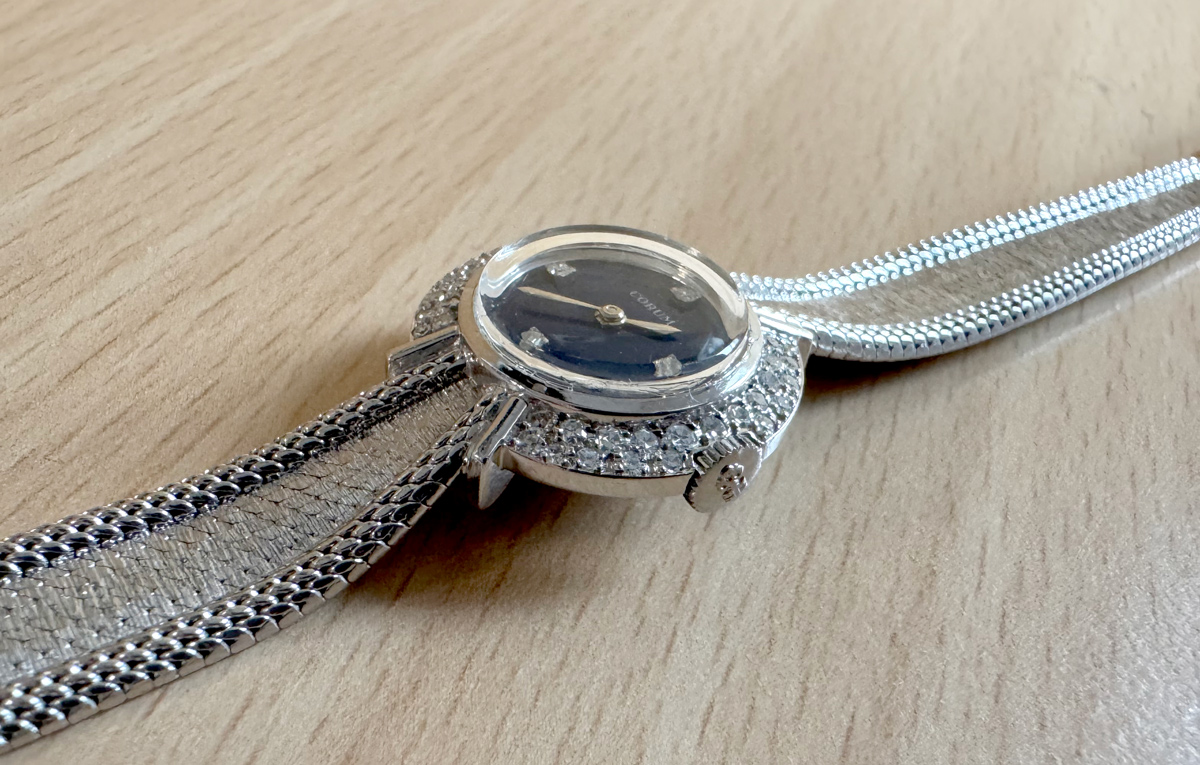 CORUM Schmuckbanduhr Damenuhr mit 18-Karat-Weißgoldgehäuse, Handaufzugswerk, 4 Diamanten im Ziffernblatt und mit Diamanten besetzte Lünette.