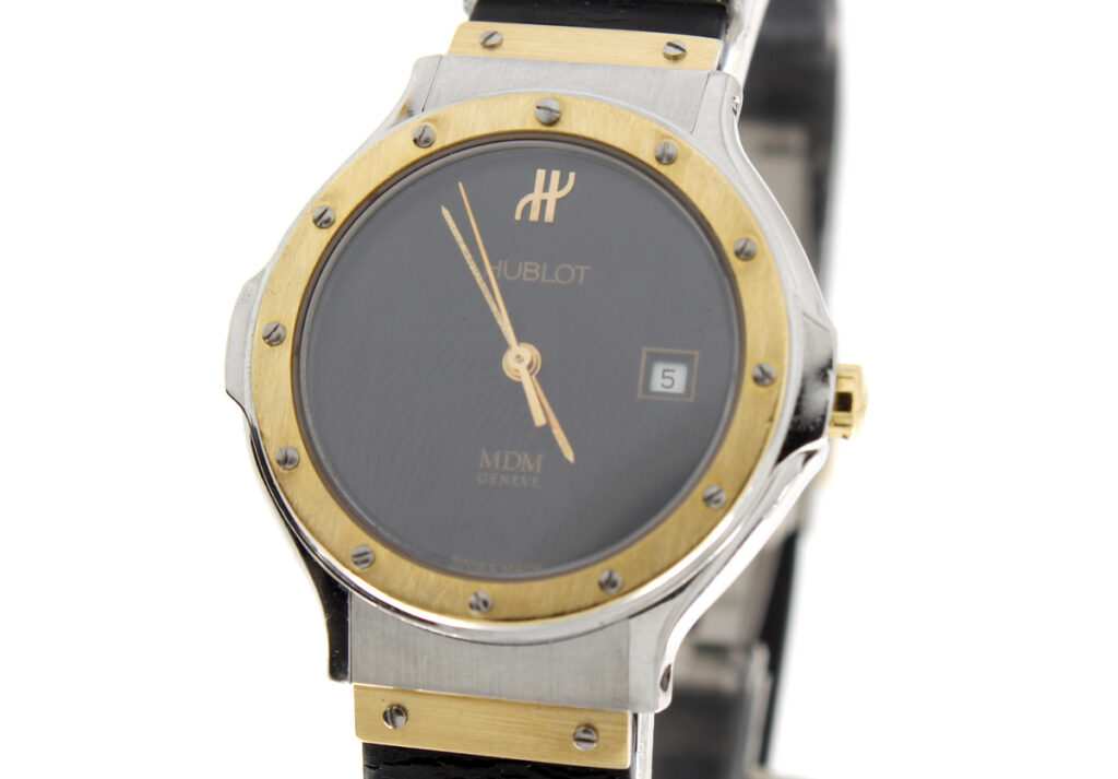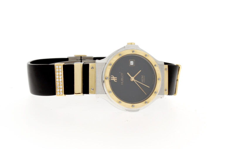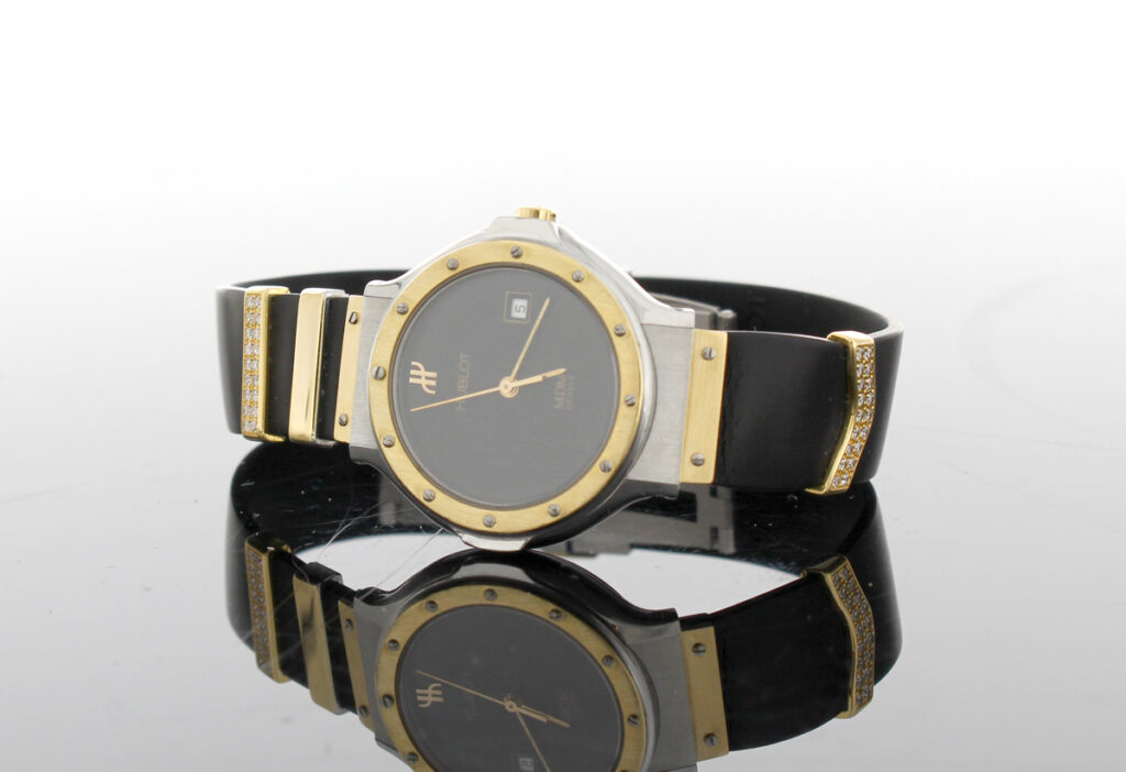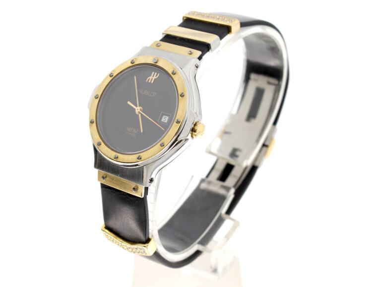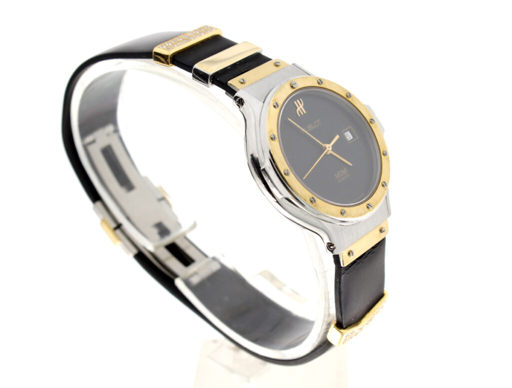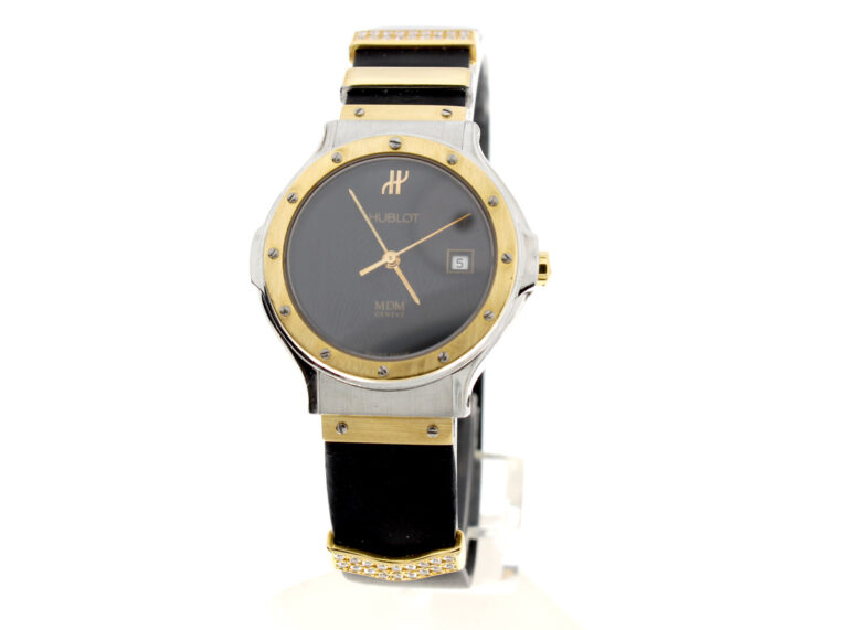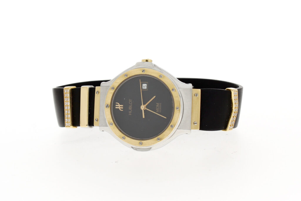 HUBLOT MDM Geneve Damenuhr mit Stahl-/Goldgehäuse, ETA-Quartzwerk, Diamanten-Besatz und Faltschließe.