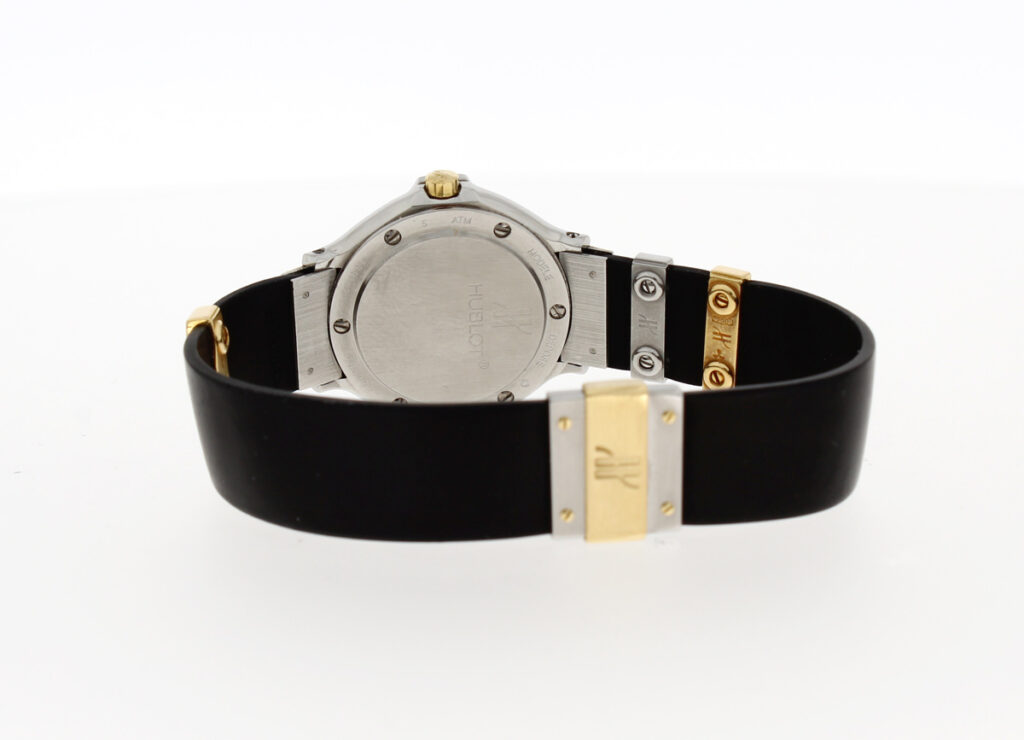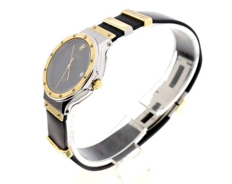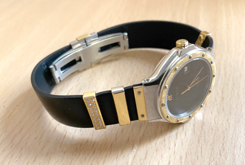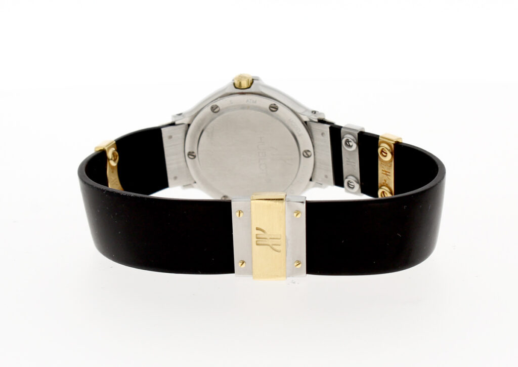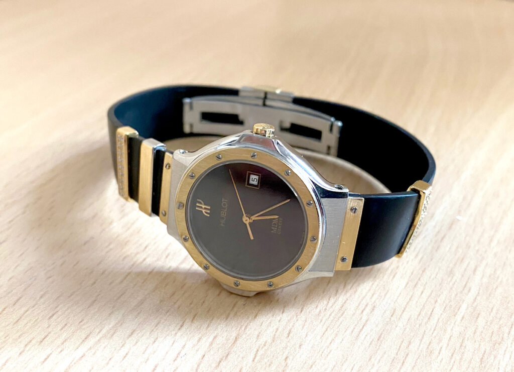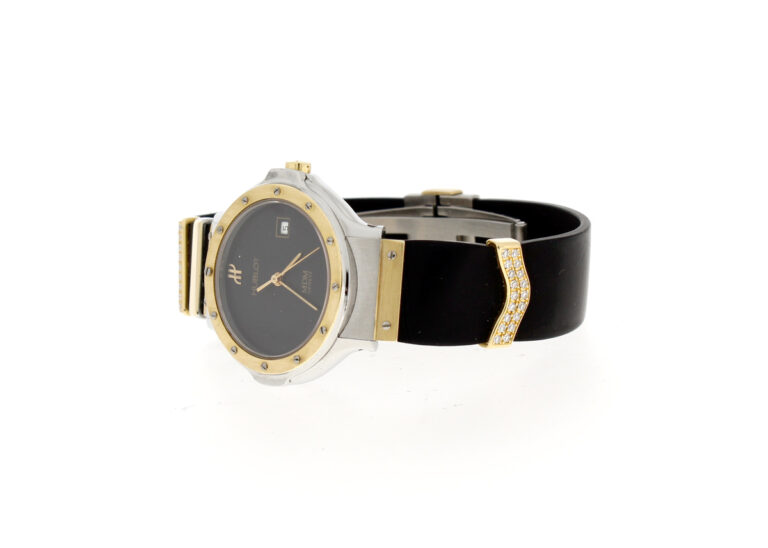 HUBLOT MDM Geneve Damenuhr mit Stahl-/Goldgehäuse, ETA-Quartzwerk, Diamanten-Besatz und Faltschließe.