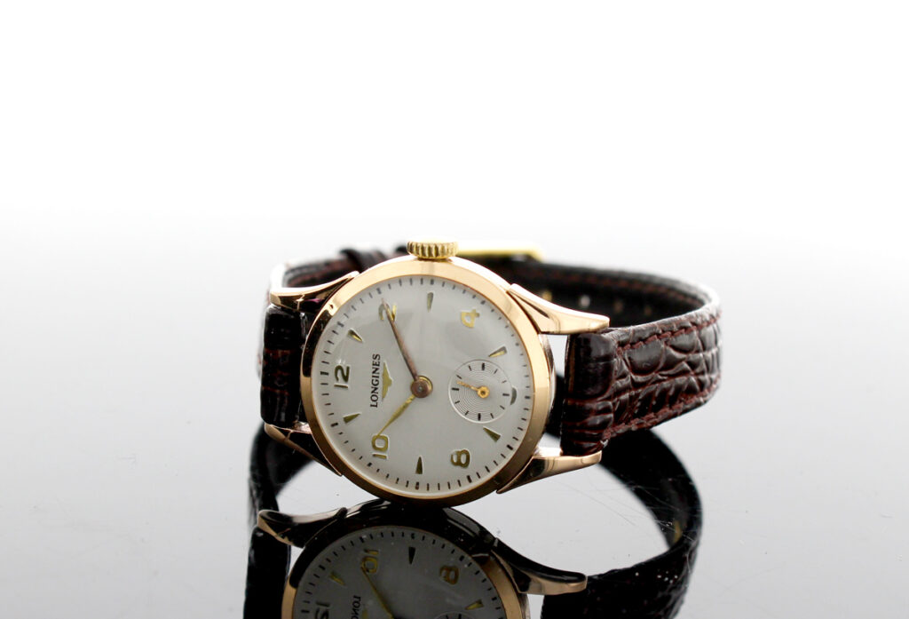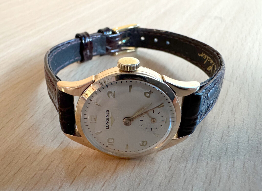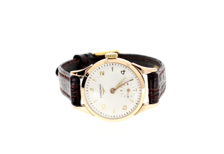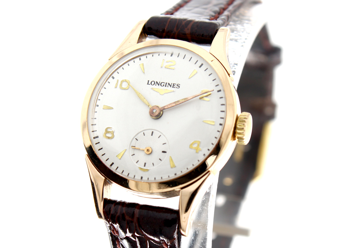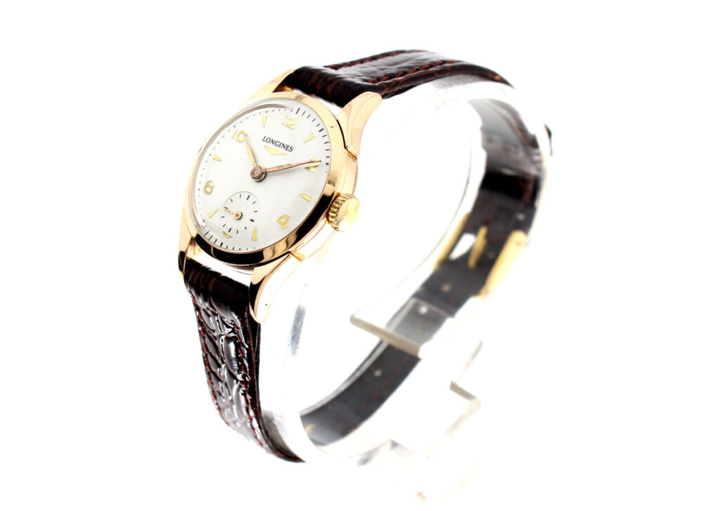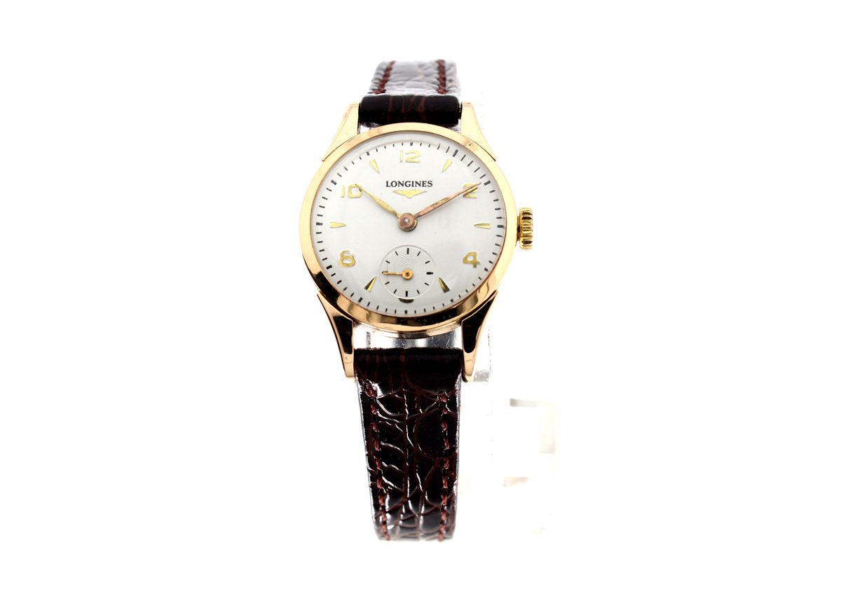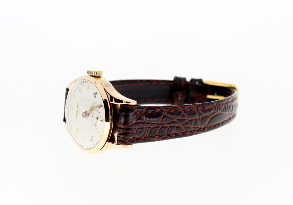 LONGINES Damenuhr mit 18-Karat-Goldgehäuse, Handaufzugswerk, Lederband und kleiner Sekunde.