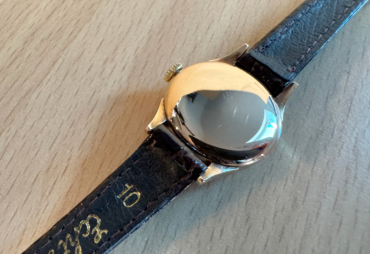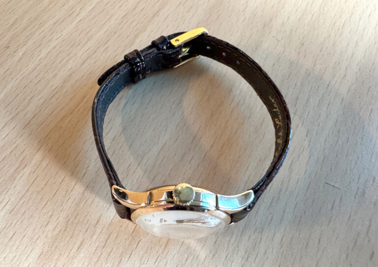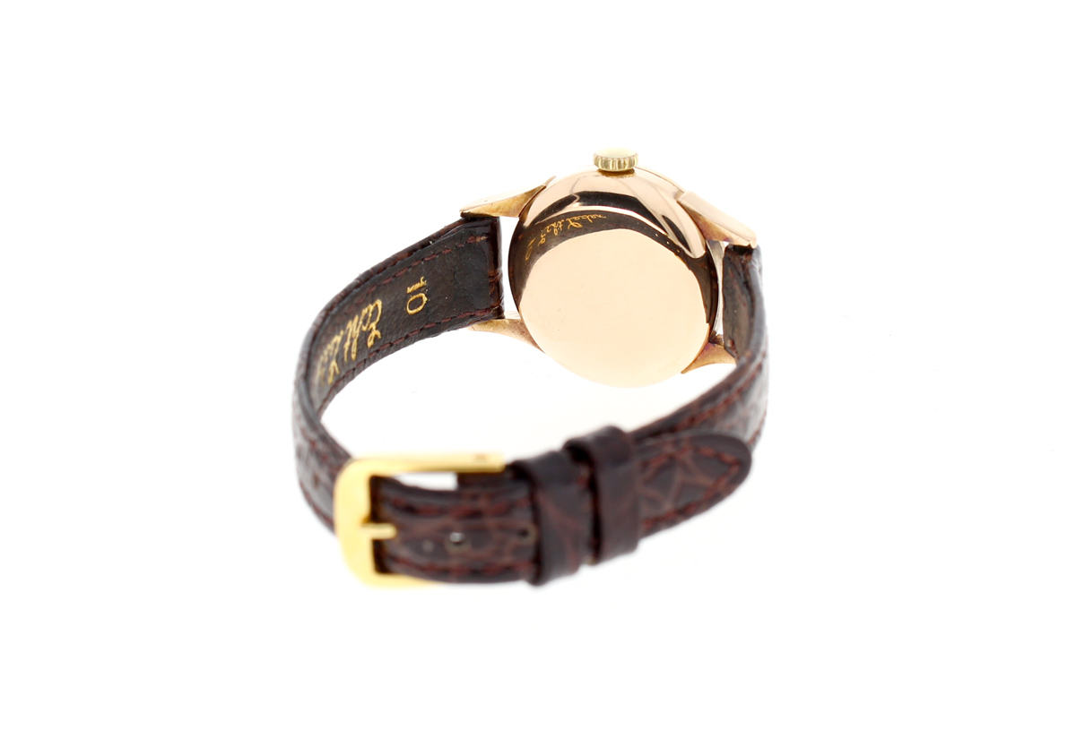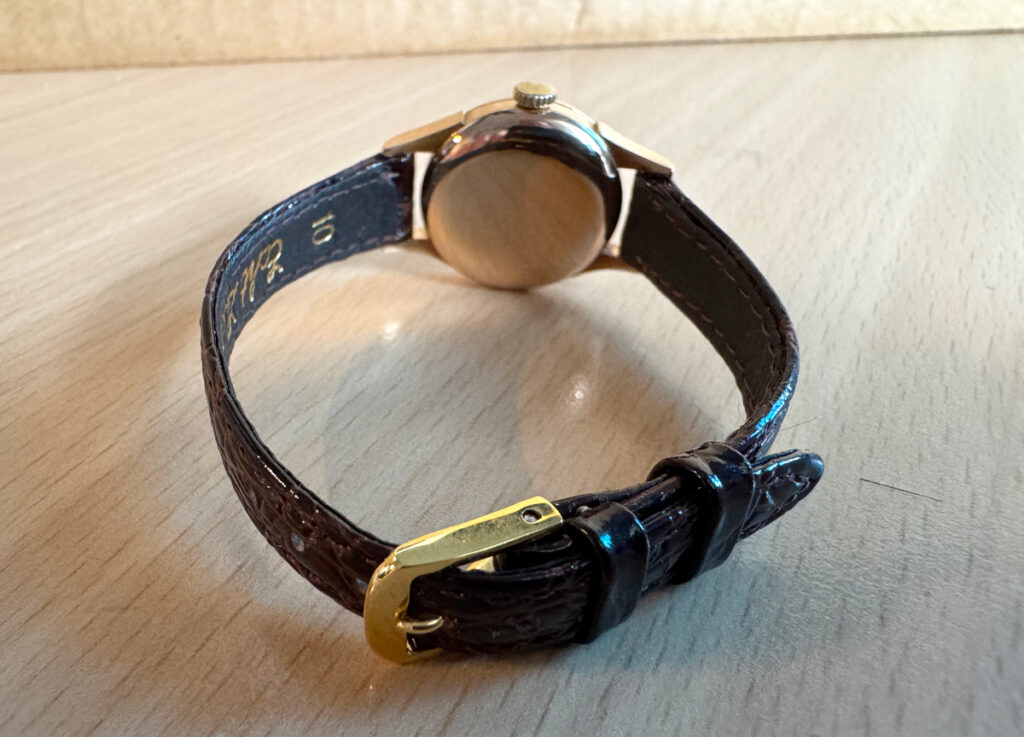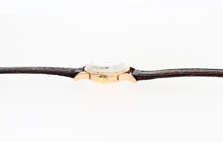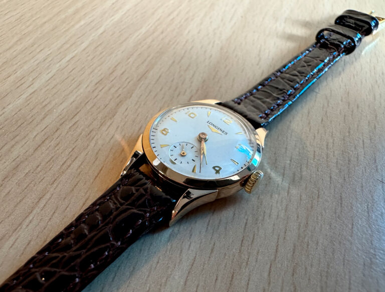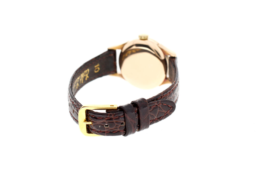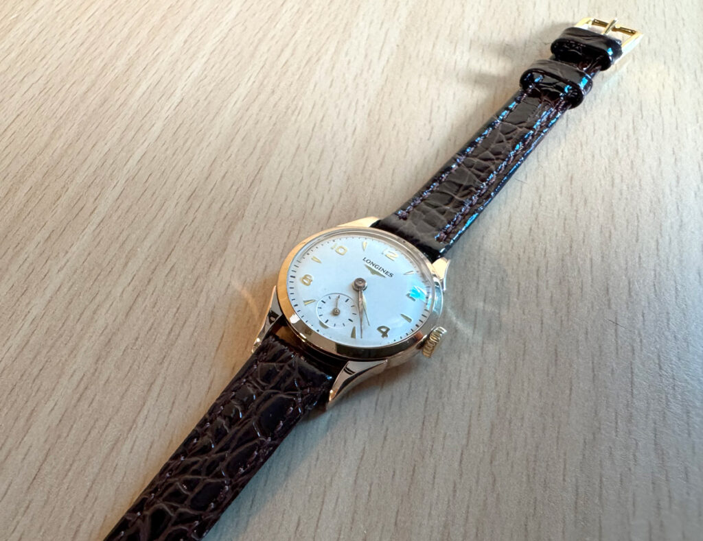 LONGINES Damenuhr mit 18-Karat-Goldgehäuse, Handaufzugswerk, Lederband und kleiner Sekunde.