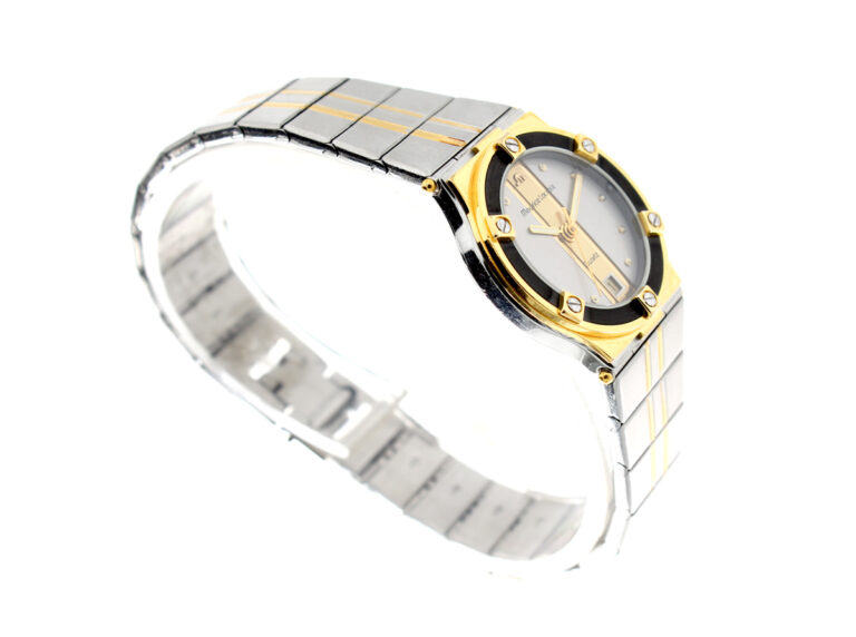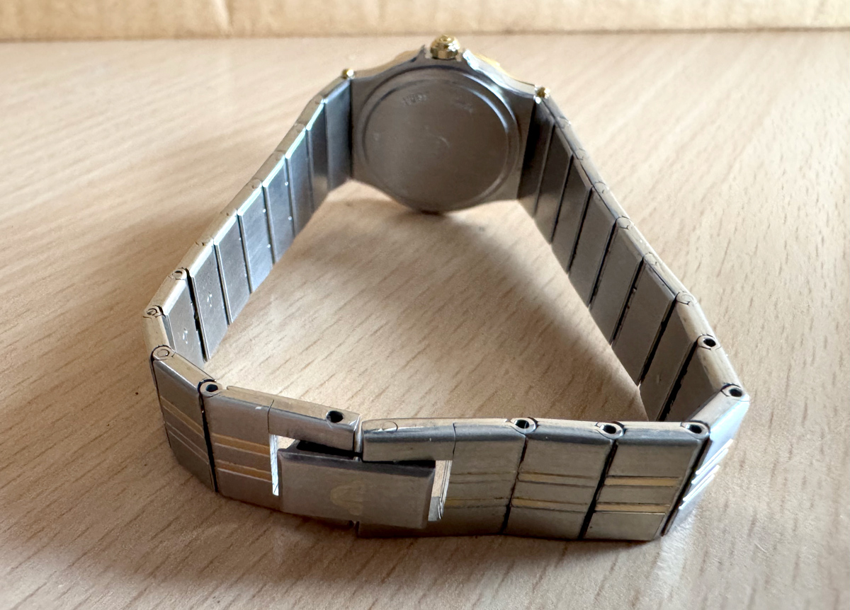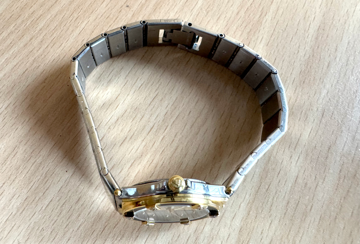 silber/goldfarbig, analoge Anzeige, keine Ziffern