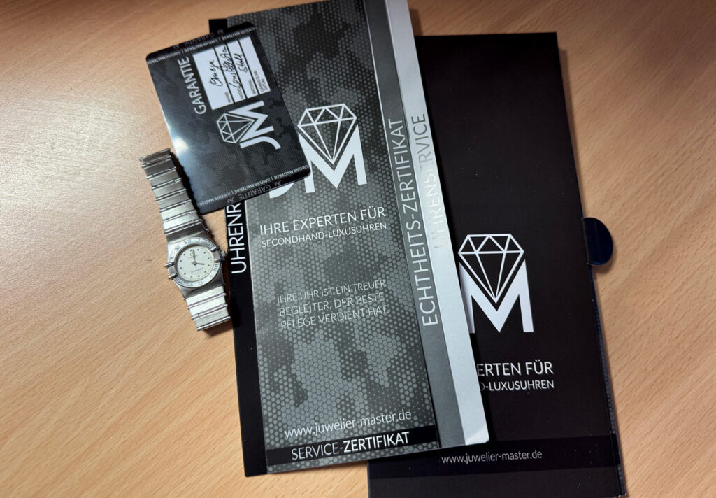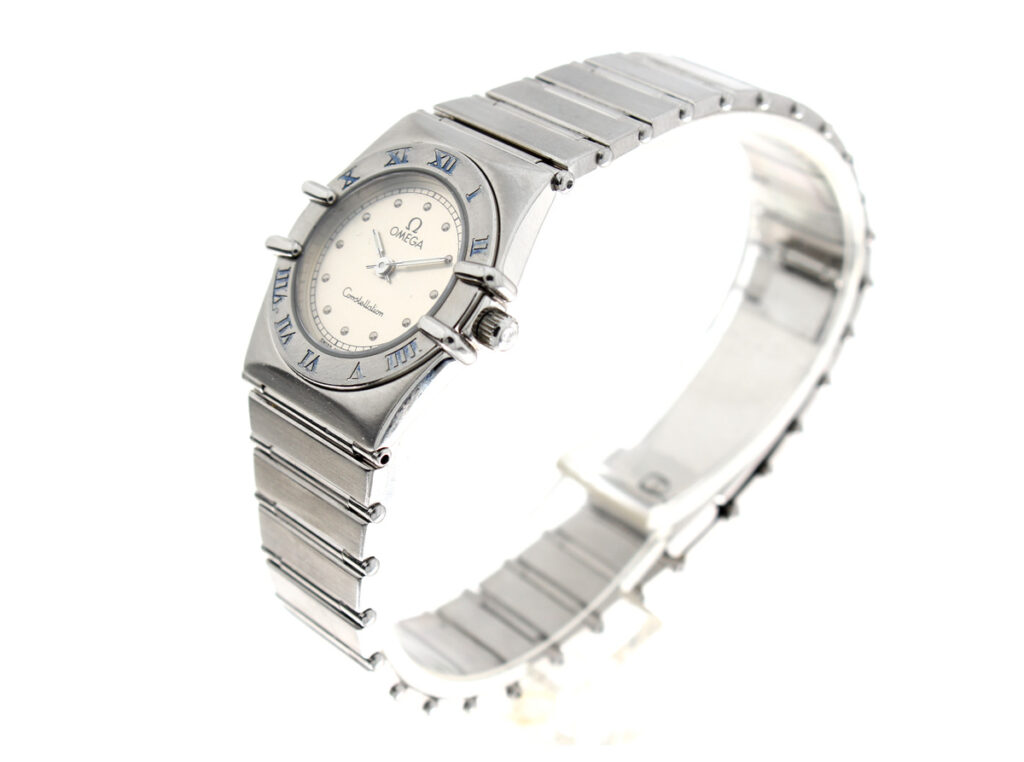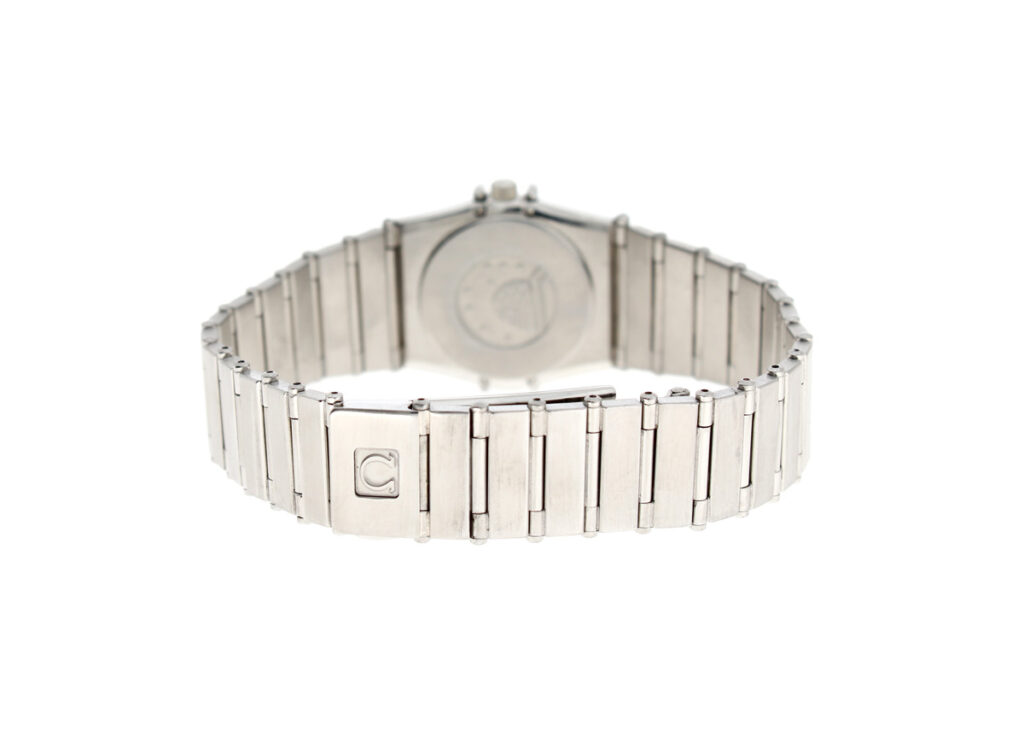 OMEGA Constellation Damenuhr mit Edelstahlgehäuse, ETA-Quartzwerk, Saphirglas und Faltschließe.