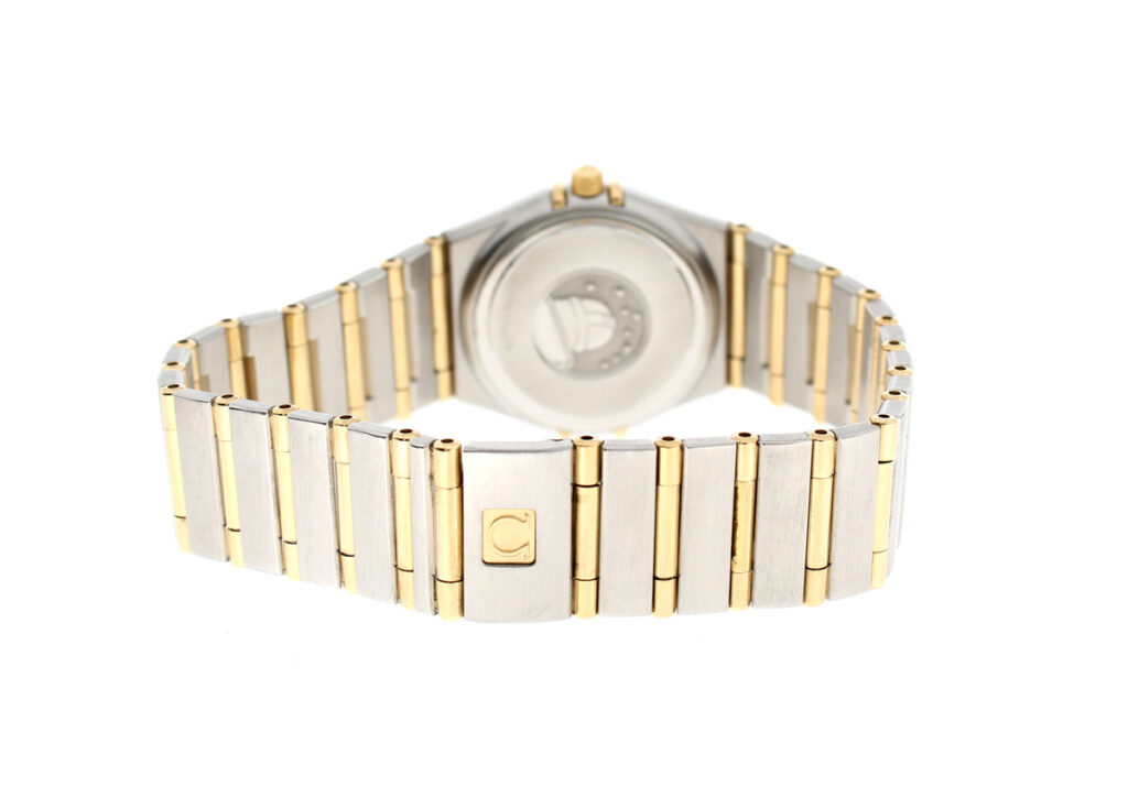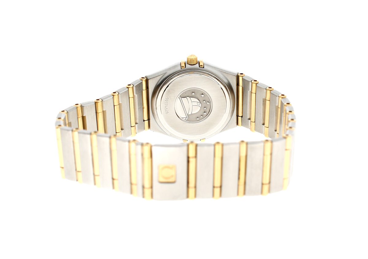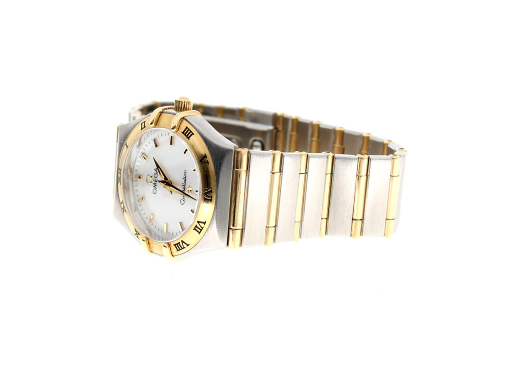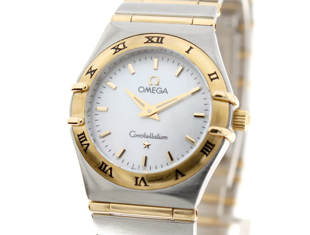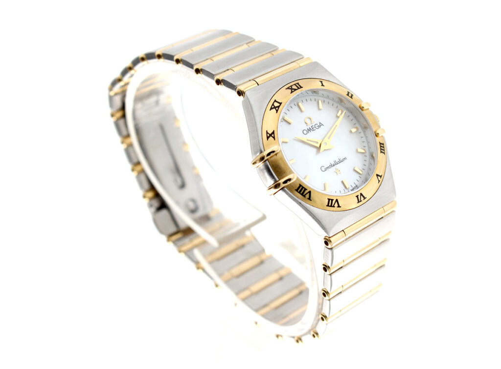 OMEGA Constellation Damenuhr, Stahl-Goldgehäuse (Bicolor), ETA-Quartzwerk und Perlmutt-Ziffernblatt.