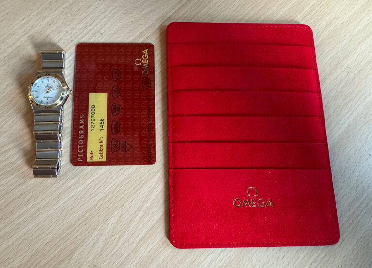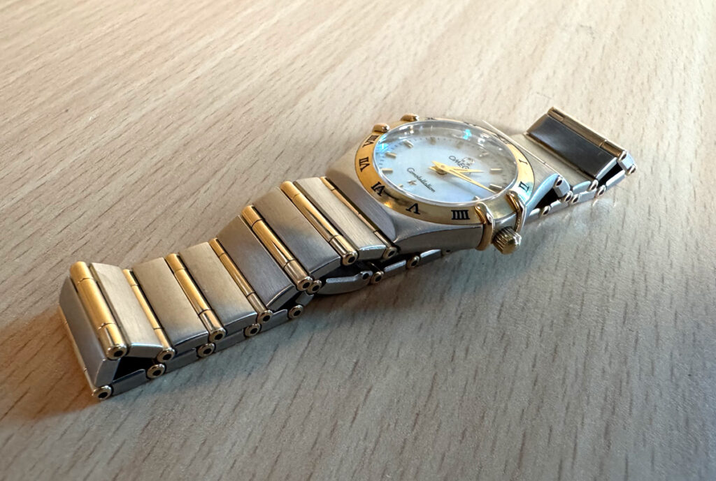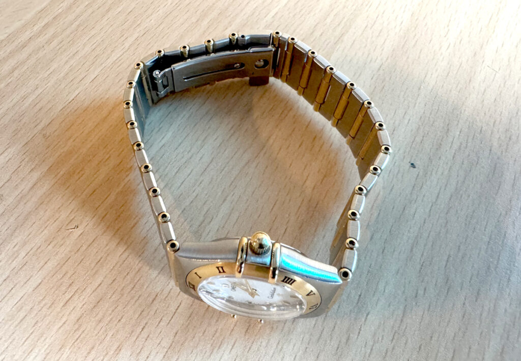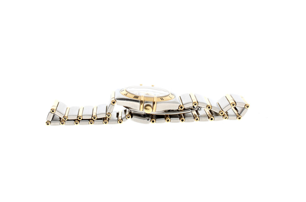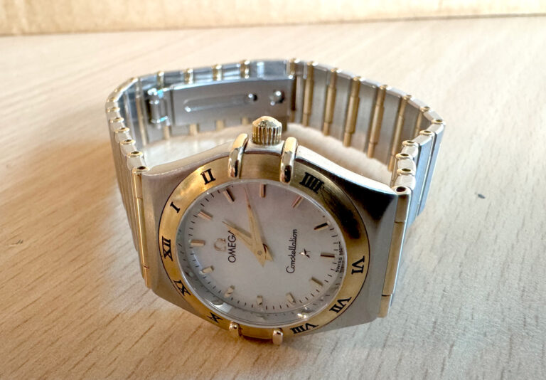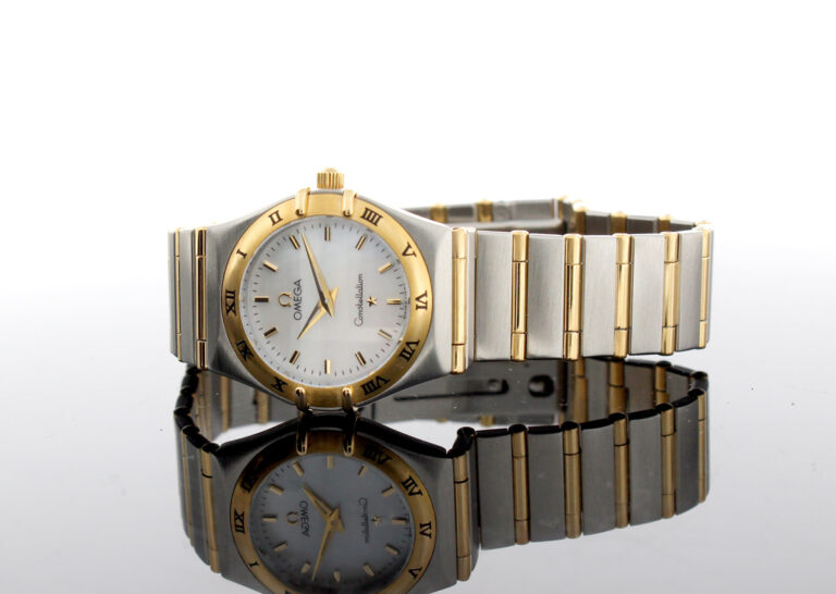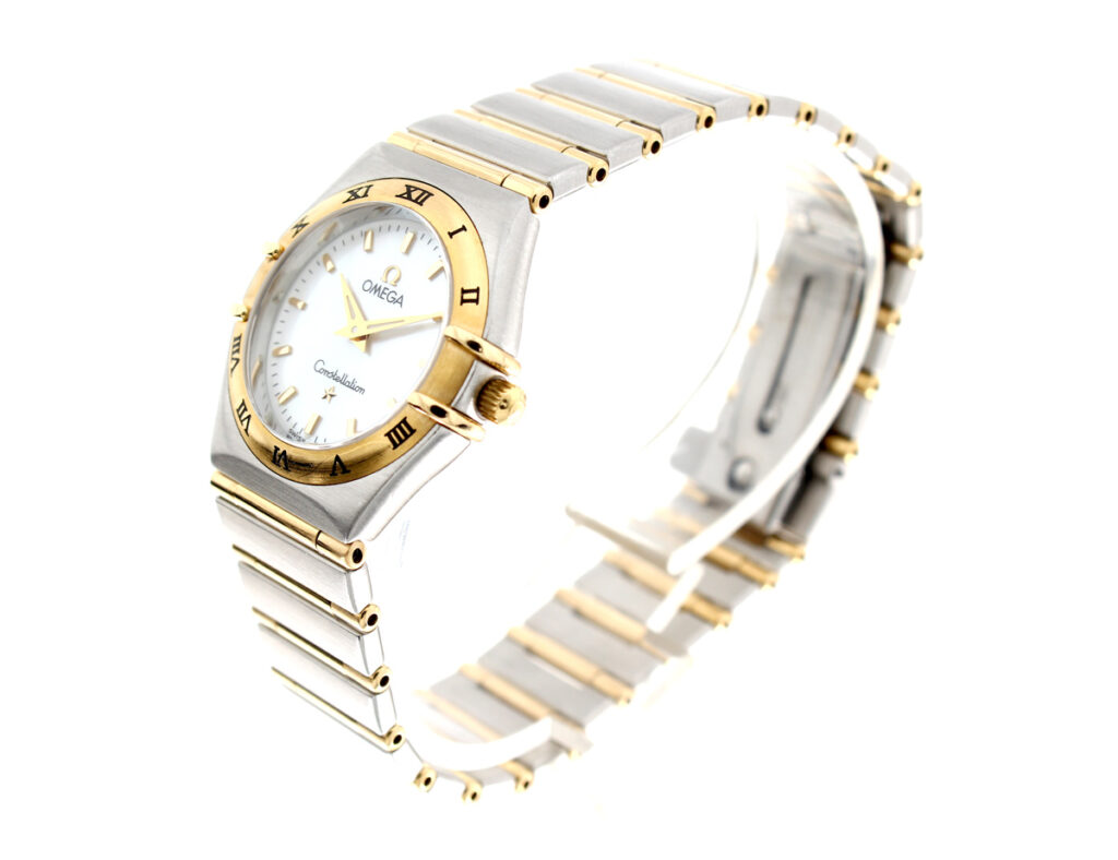 OMEGA Constellation Damenuhr, Stahl-Goldgehäuse (Bicolor), ETA-Quartzwerk und Perlmutt-Ziffernblatt.