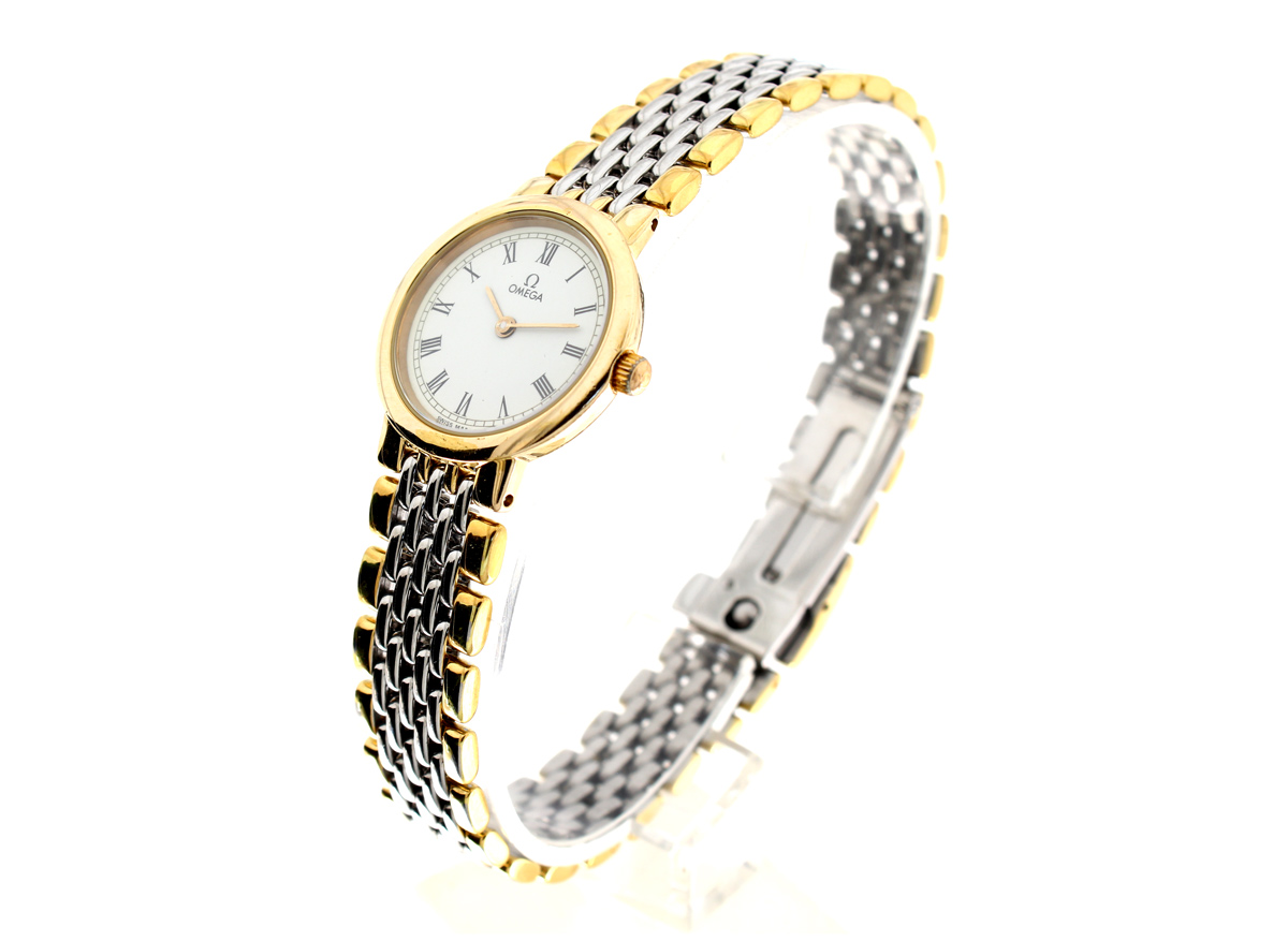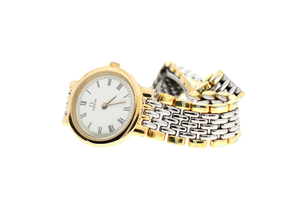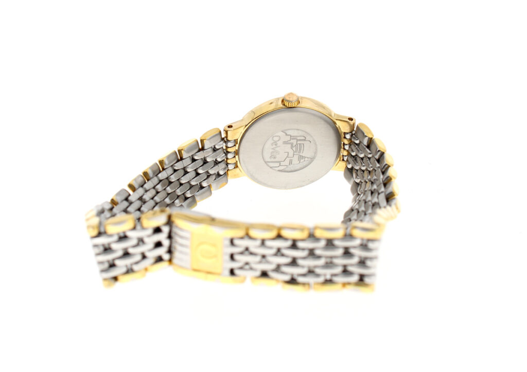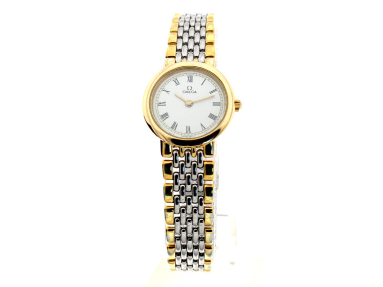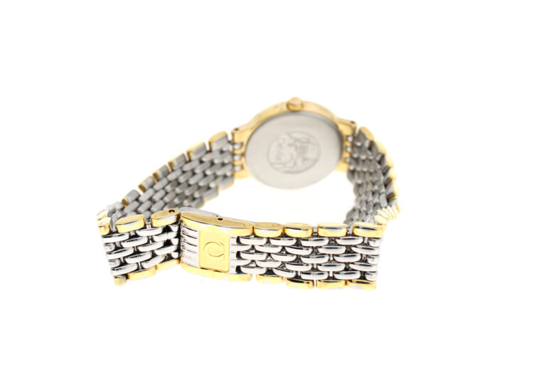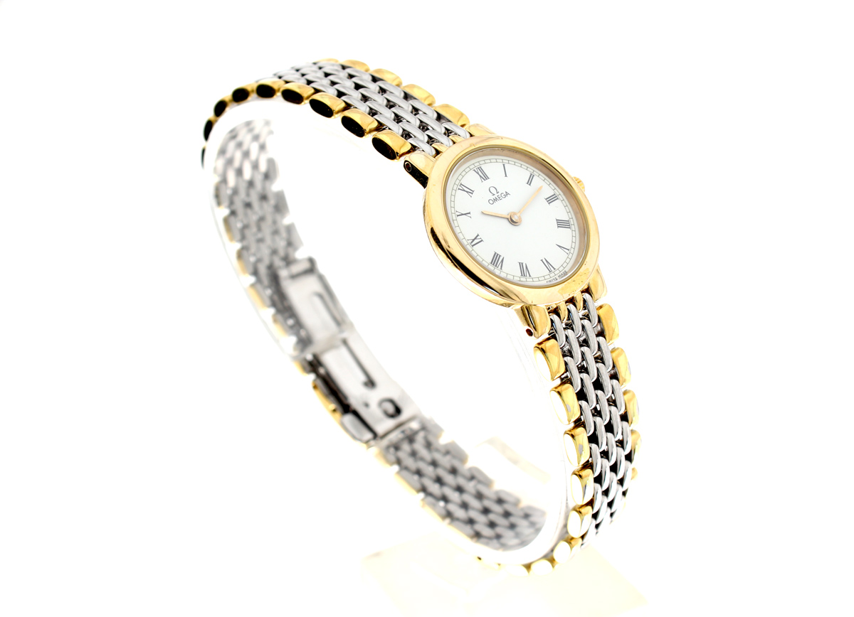 OMEGA DeVille Damenuhr mit Stahl-/Goldgehäuse (Bicolor), ETA-Quartzwerk und Faltschließe.