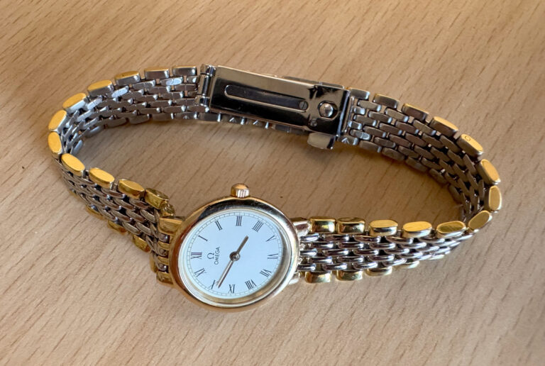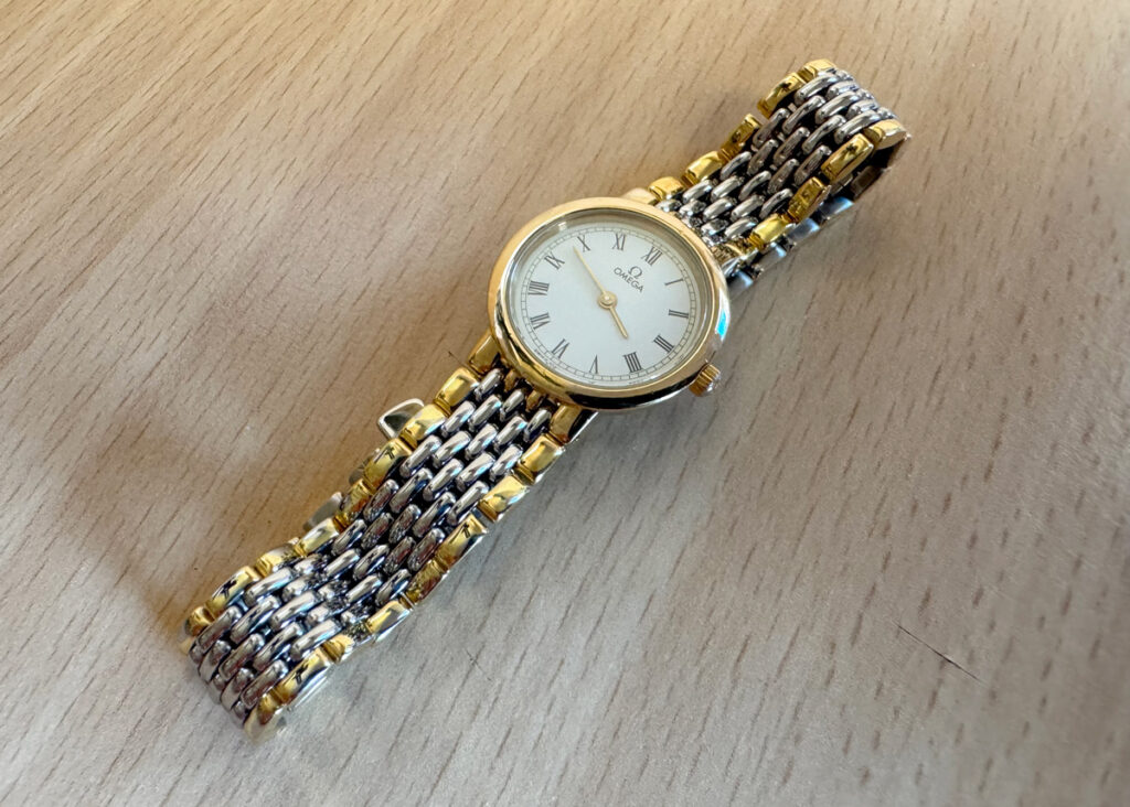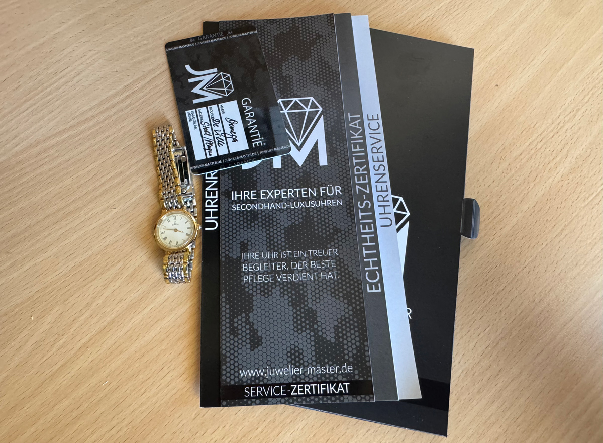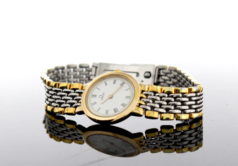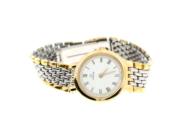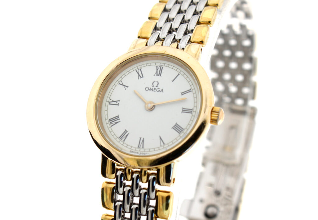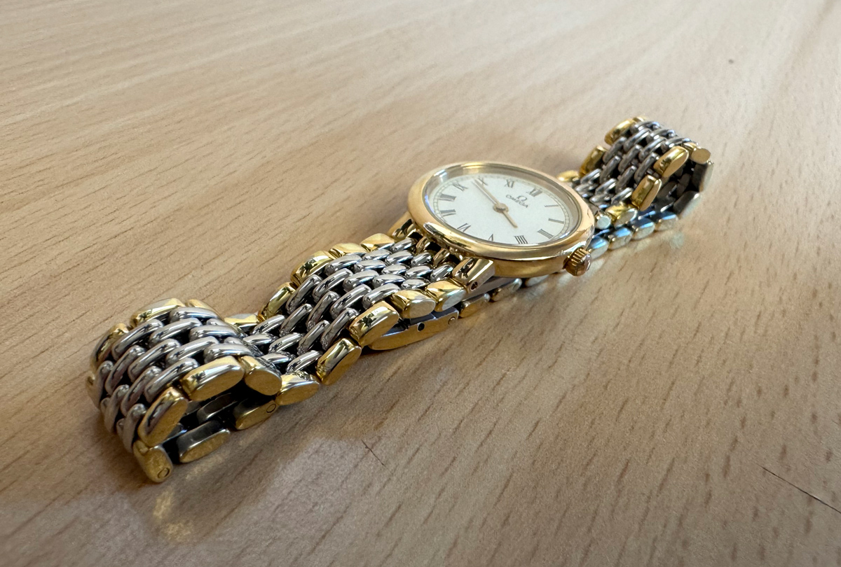 OMEGA DeVille Damenuhr mit Stahl-/Goldgehäuse (Bicolor), ETA-Quartzwerk und Faltschließe.