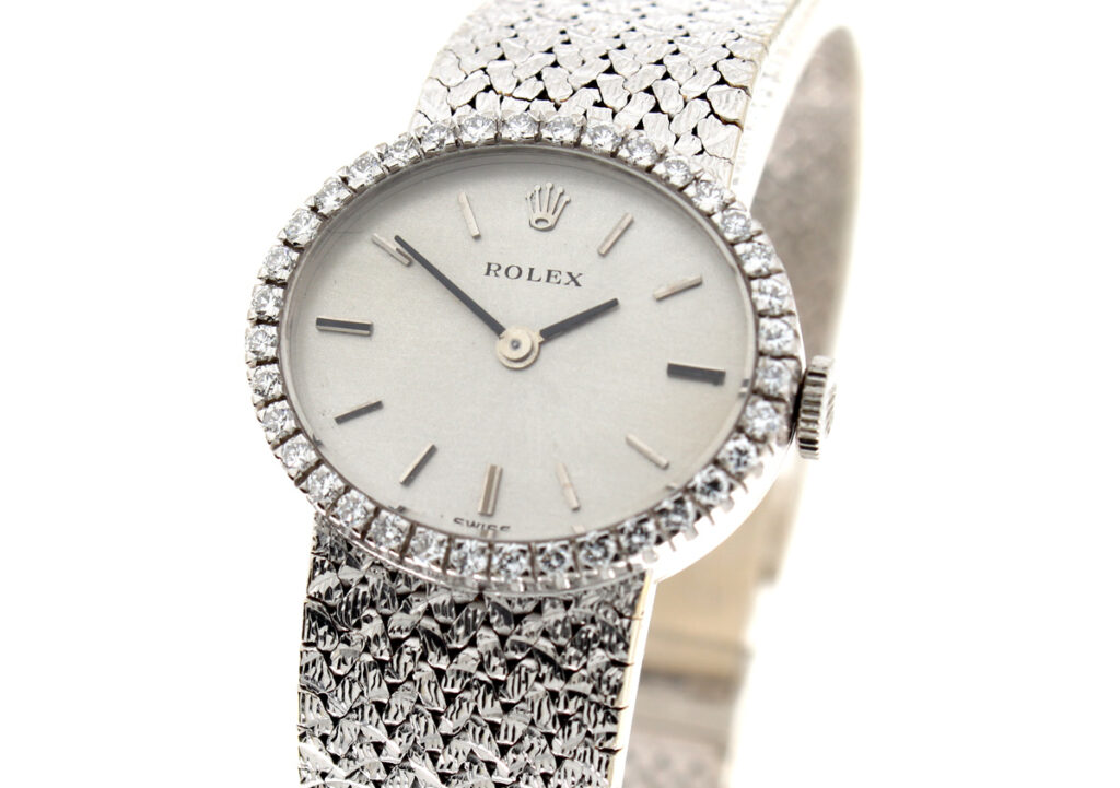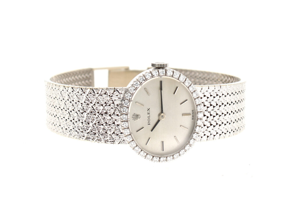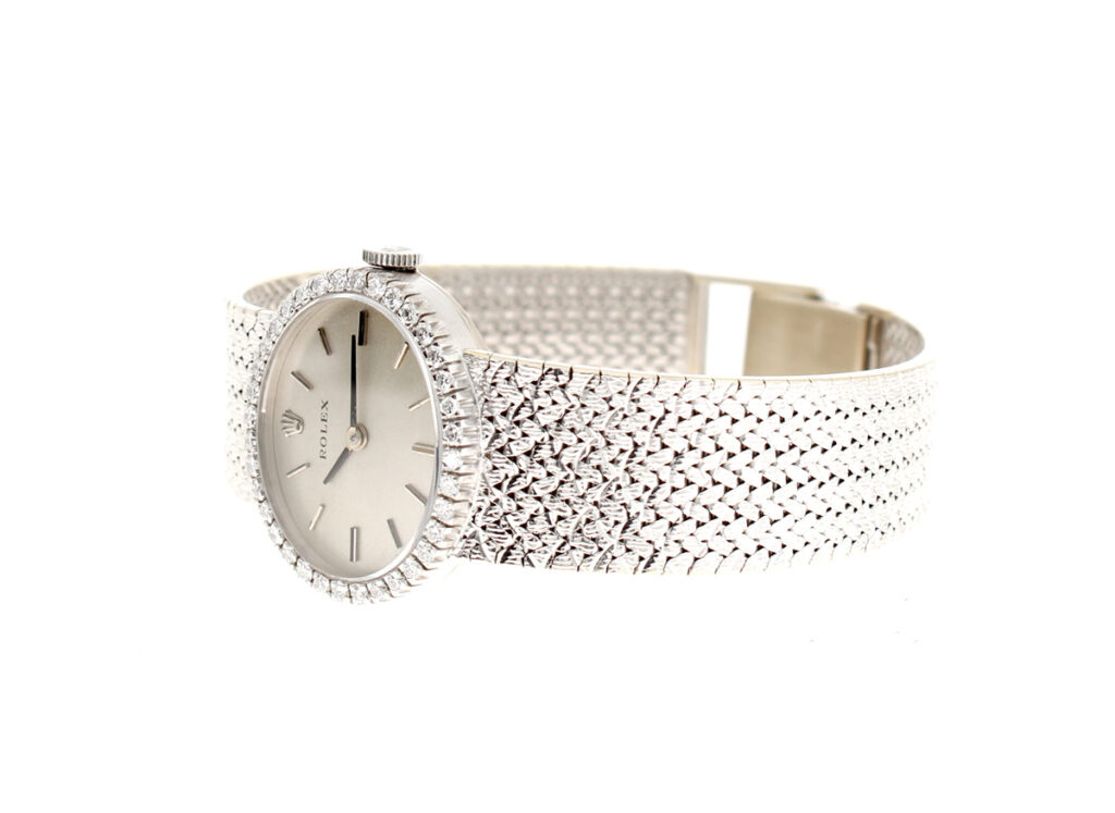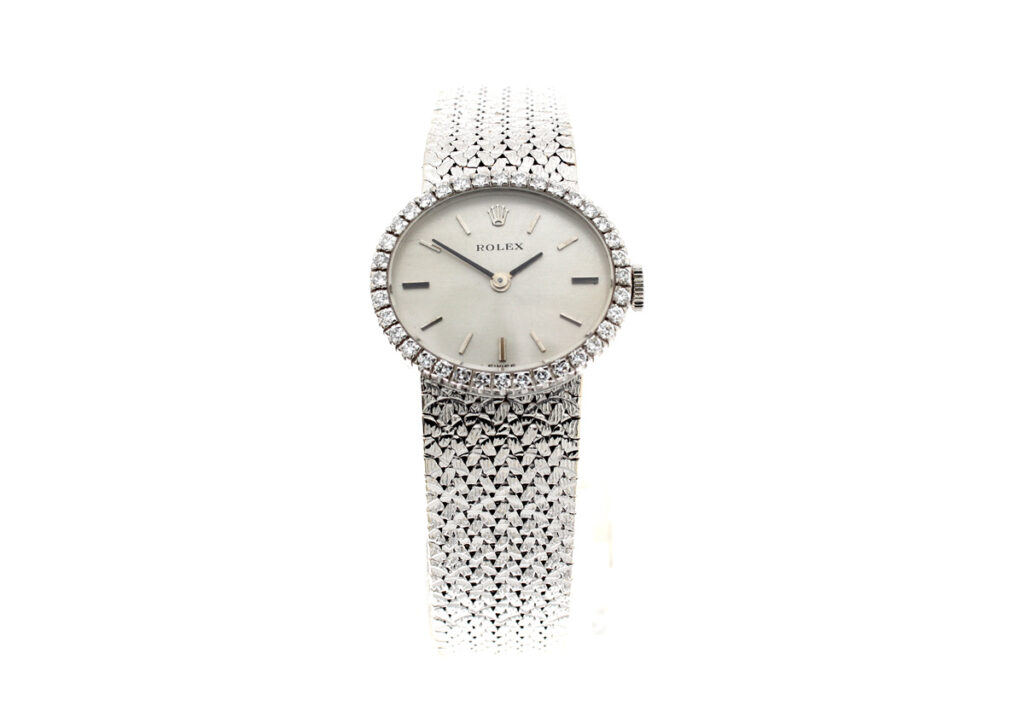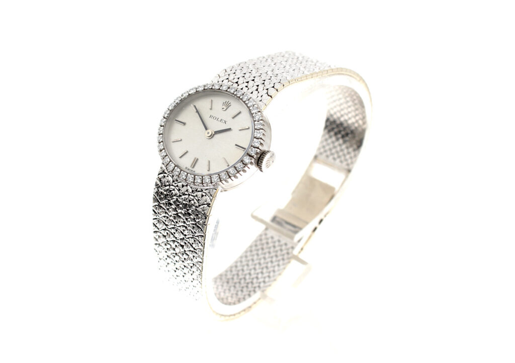 ROLEX Orchid Damenuhr mit 18-Karat-Weißgoldgehäuse, Handaufzugswerk und Diamantenkranz.