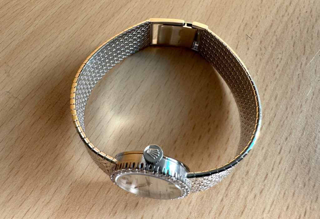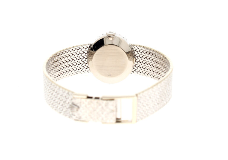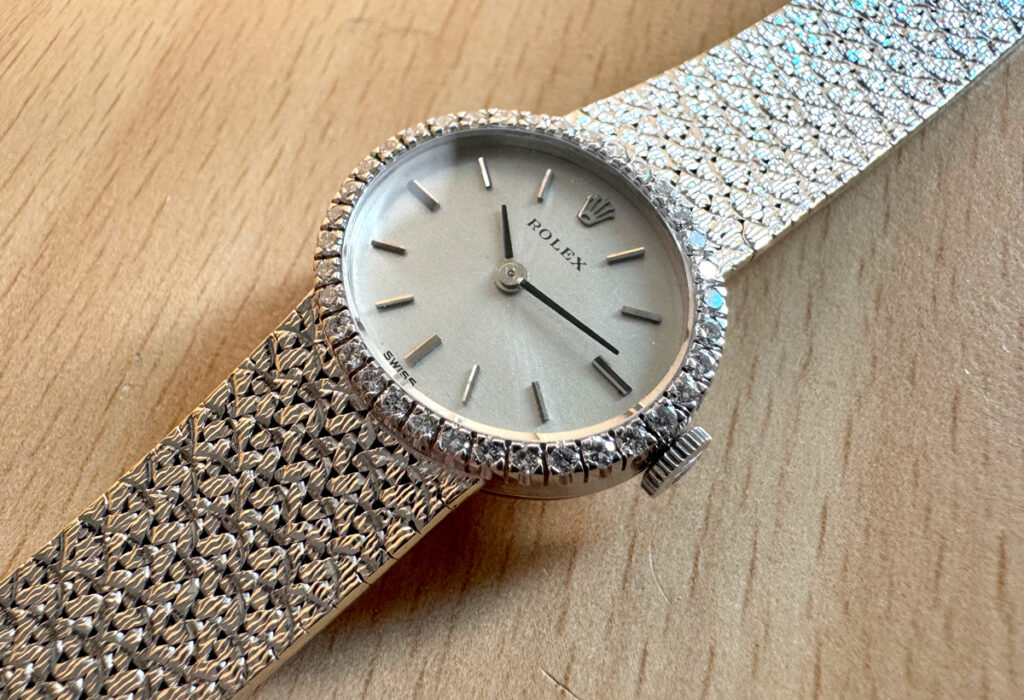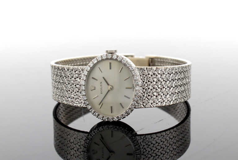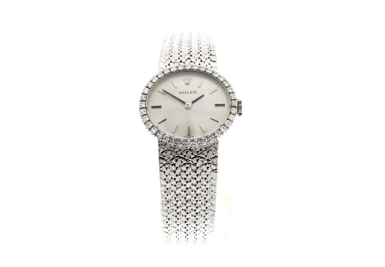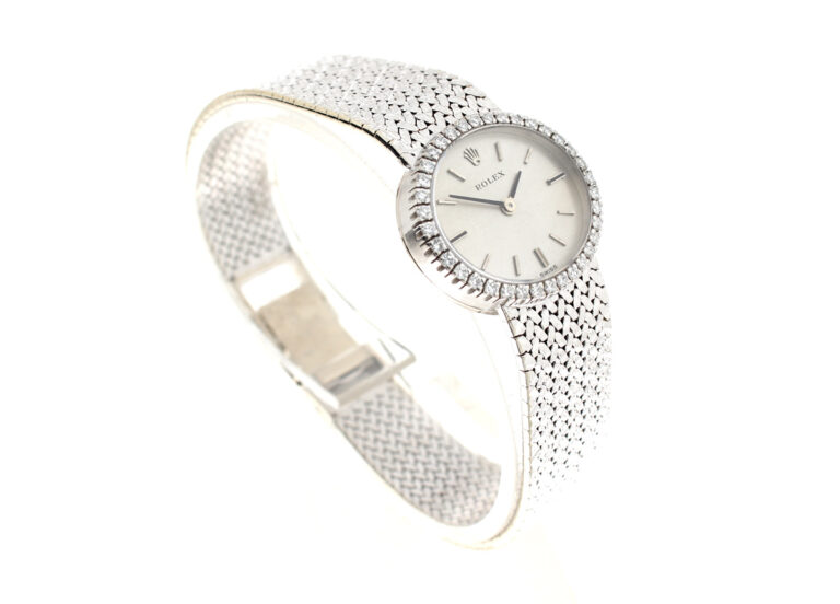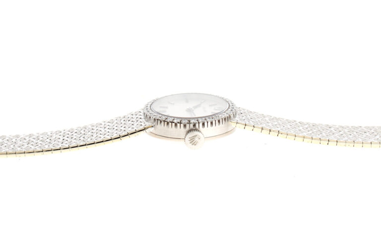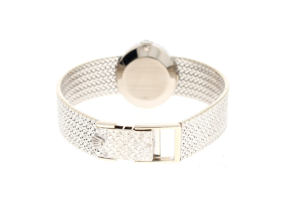 ROLEX Orchid Damenuhr mit 18-Karat-Weißgoldgehäuse, Handaufzugswerk und Diamantenkranz.