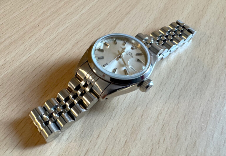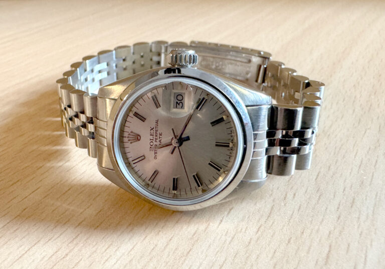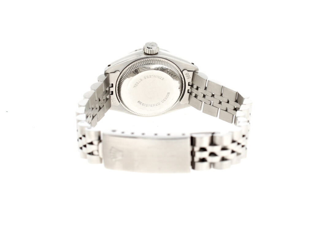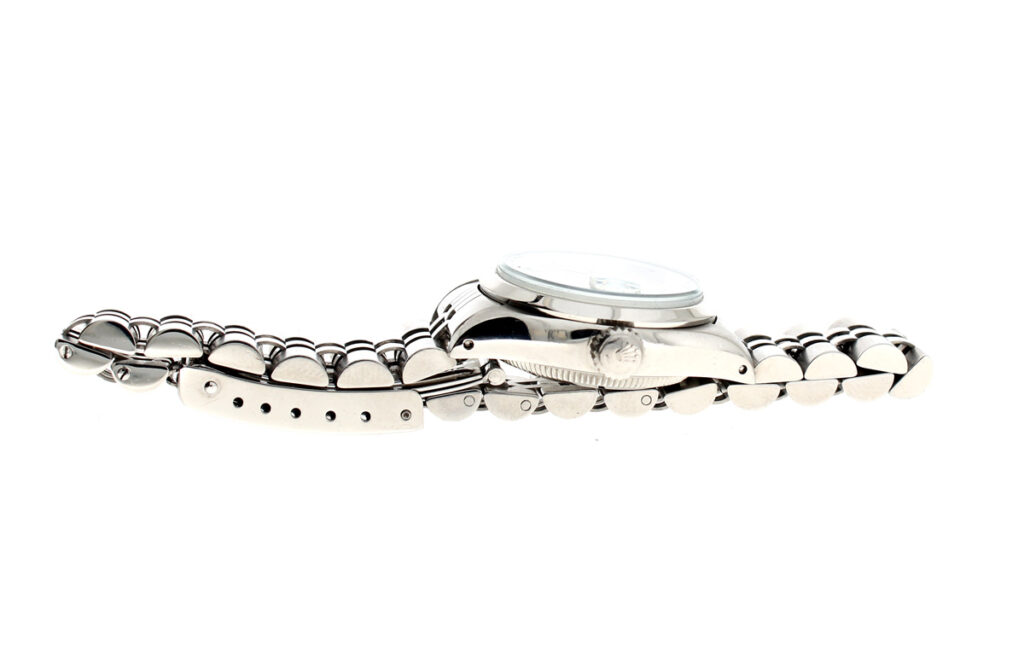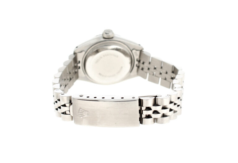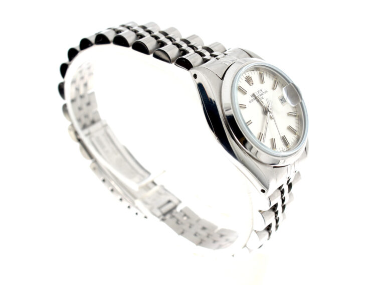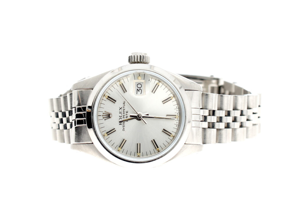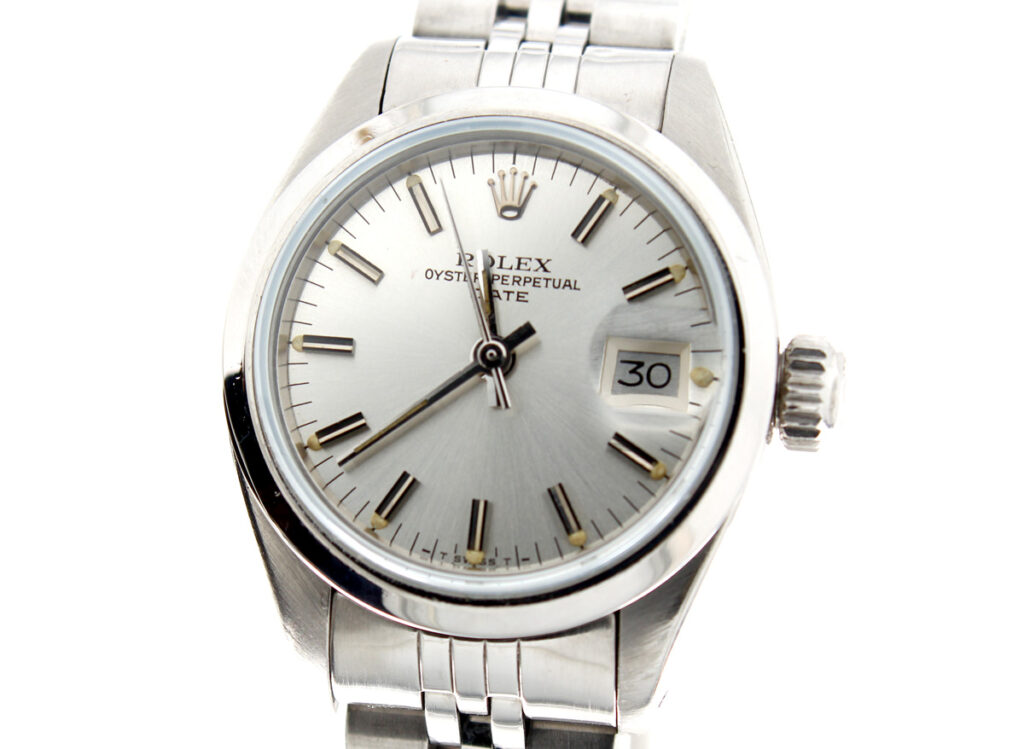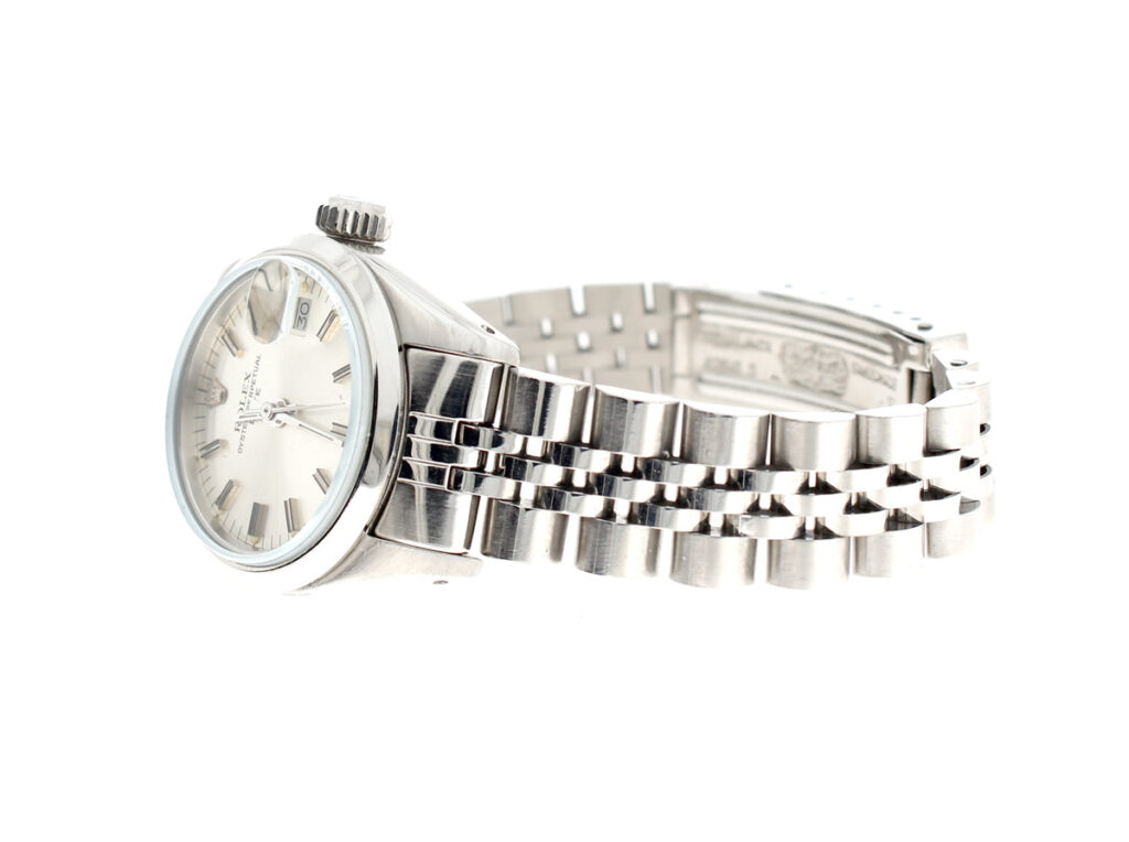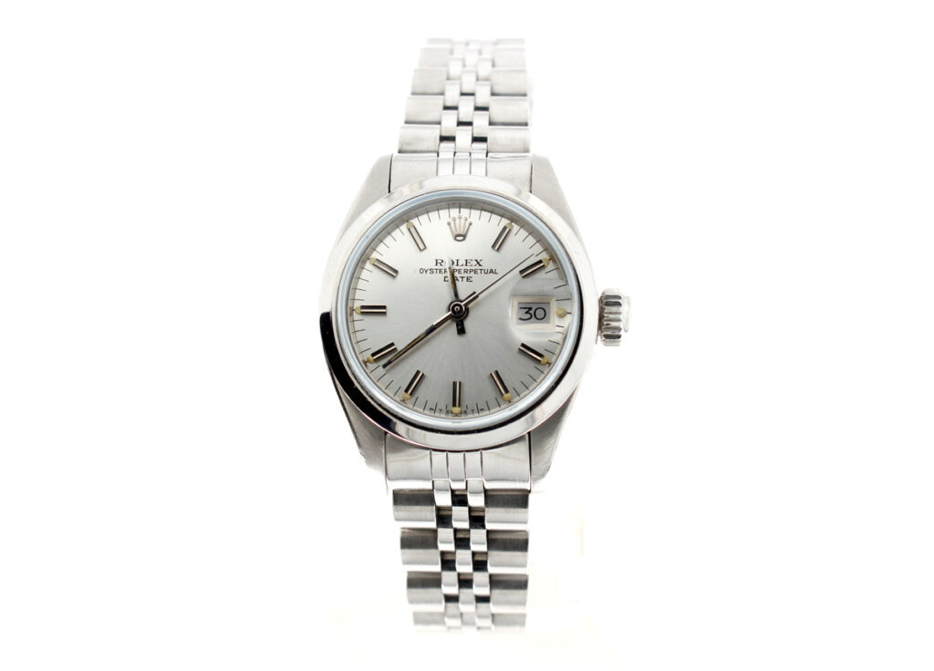 ROLEX Oyster Perpetual Date Damenuhr mit Edelstahlgehäuse, Rolex-Automatikwerk, Schraubkrone und Datumslupe.