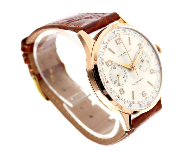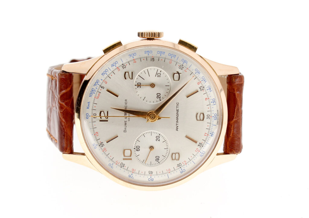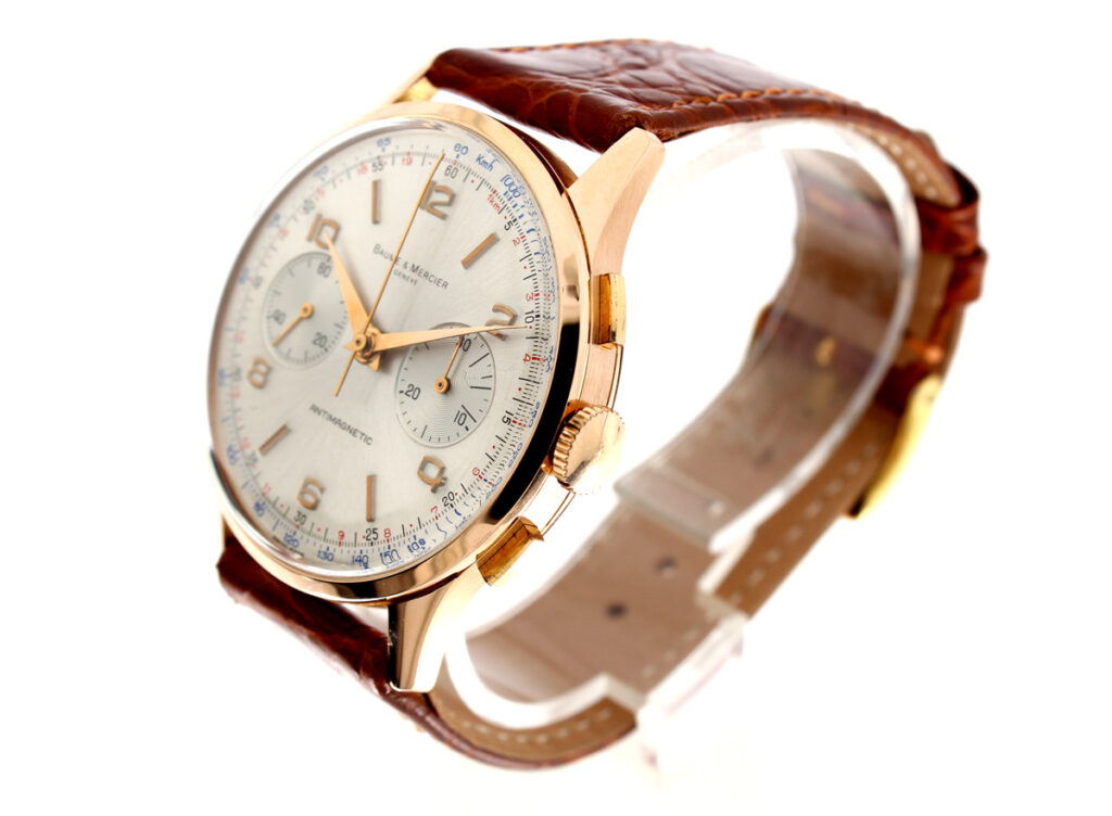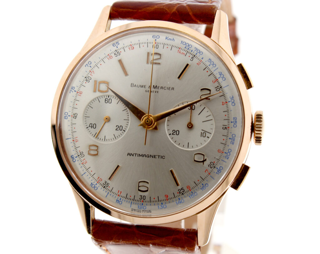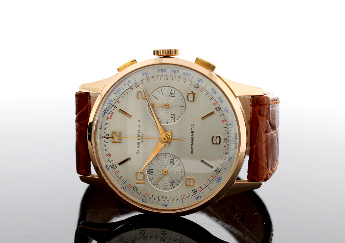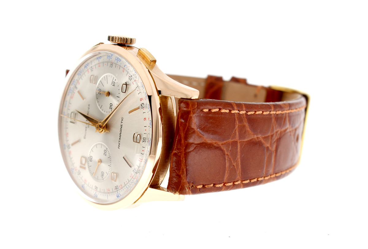 BAUME MERCIER Chronograph Herrenuhr mit 18-Karat-Goldgehäuse, Handaufzugswerk und 30-Minuten-Zähler.