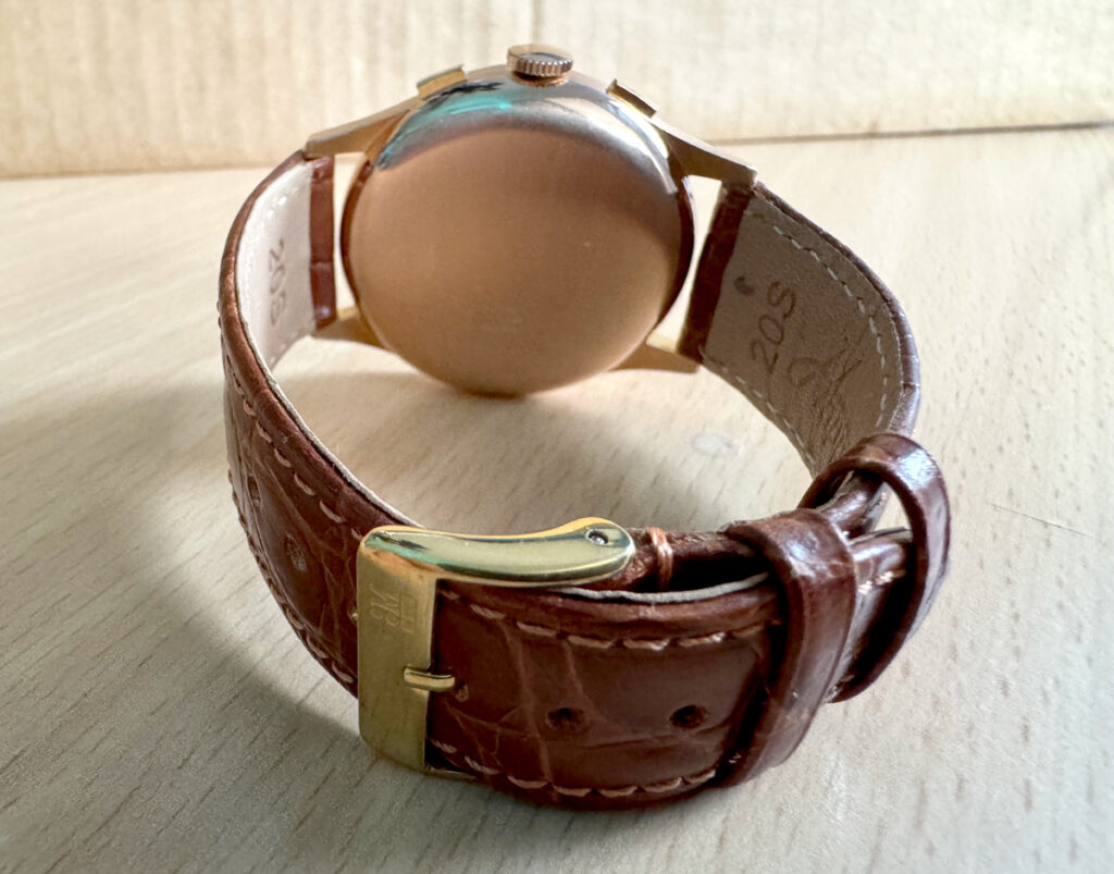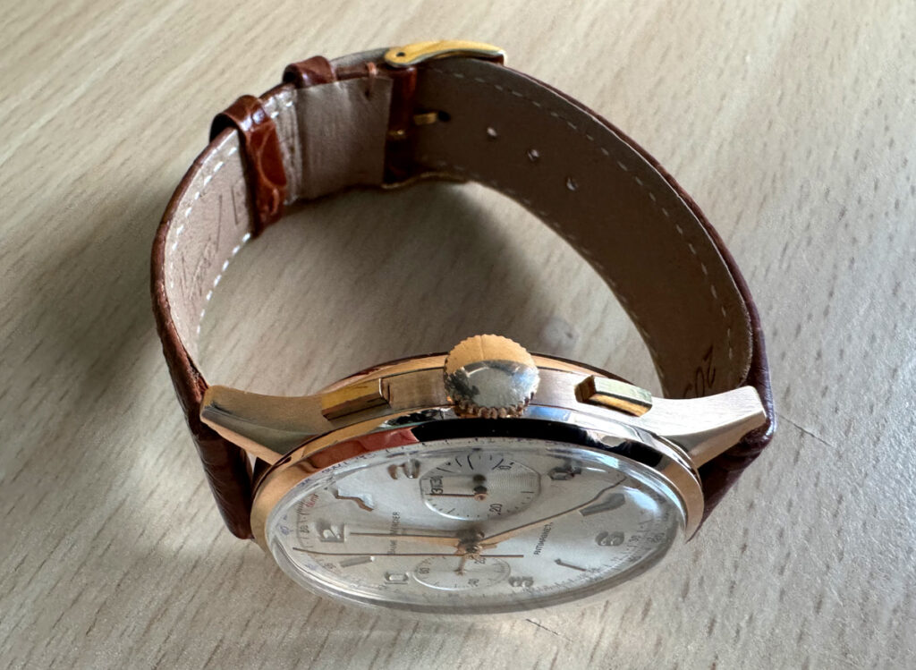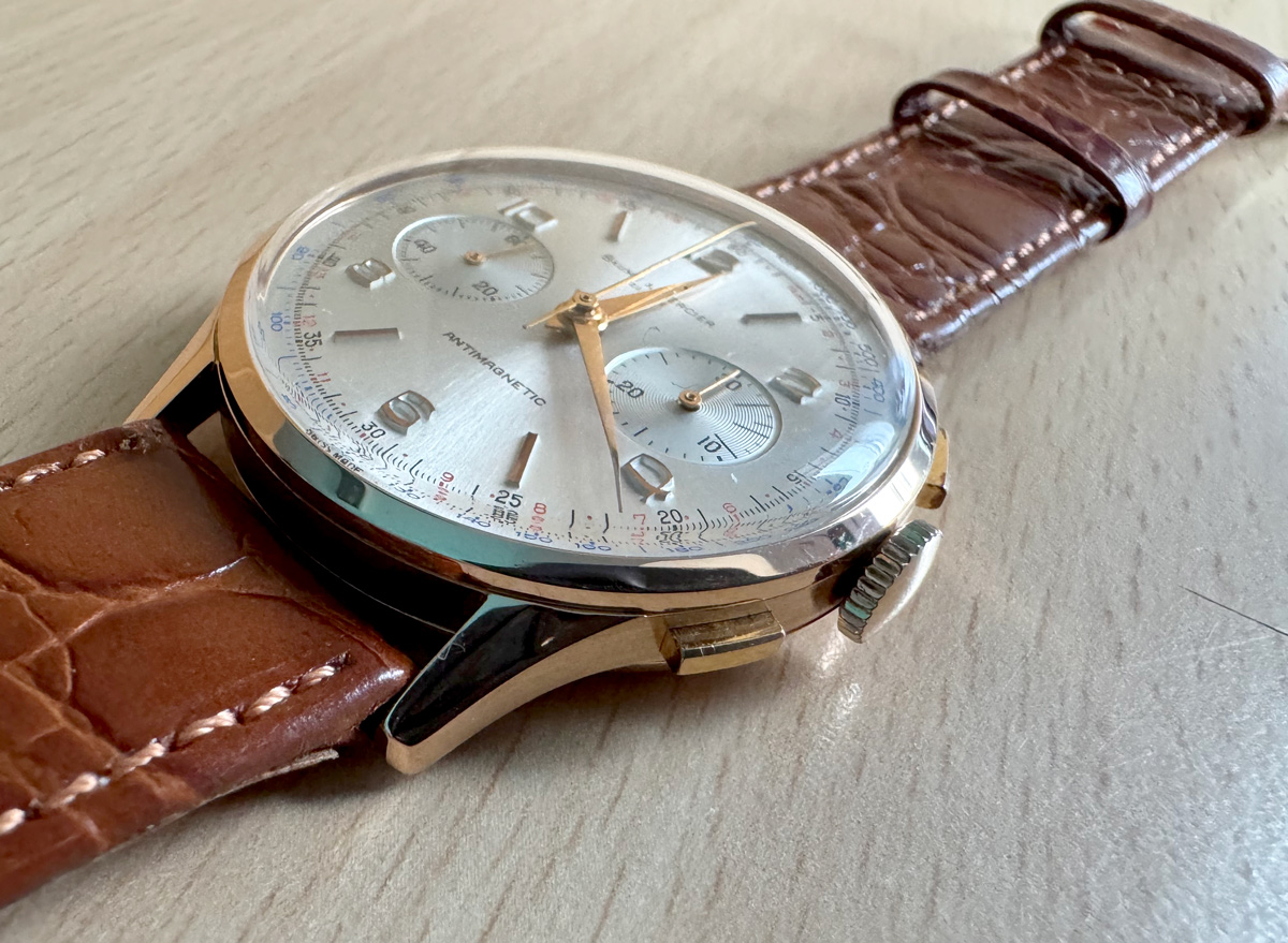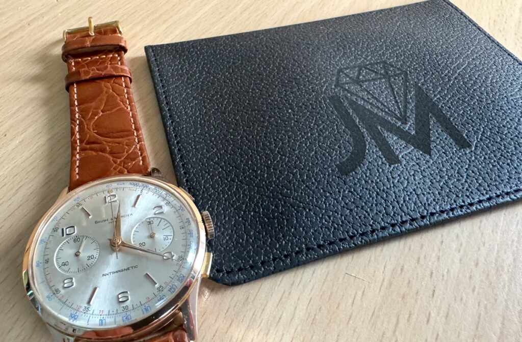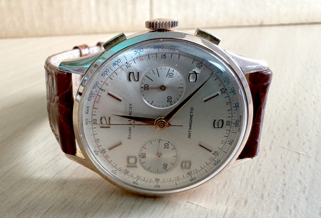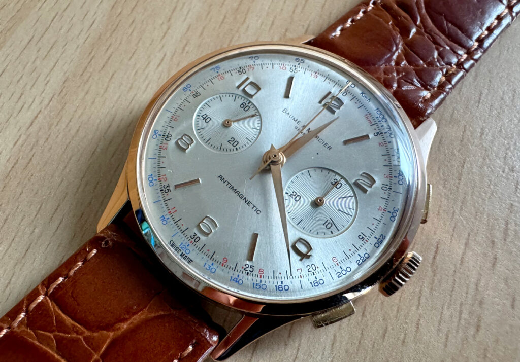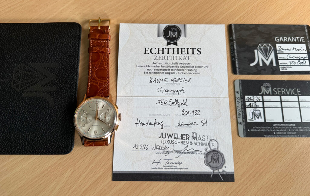 BAUME MERCIER Chronograph Herrenuhr mit 18-Karat-Goldgehäuse, Handaufzugswerk und 30-Minuten-Zähler.