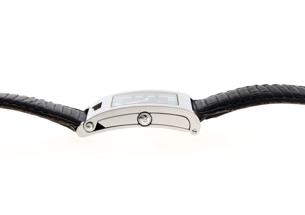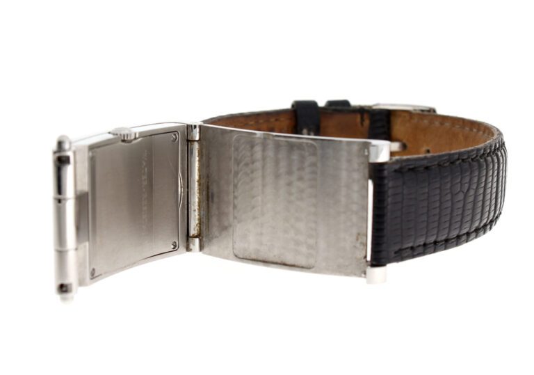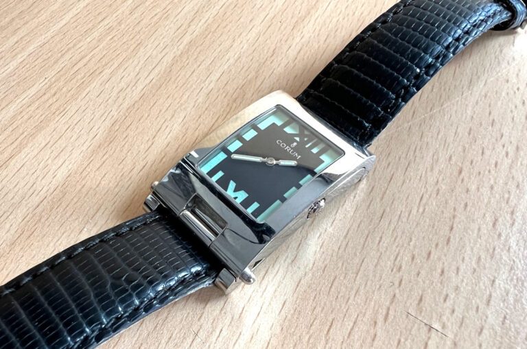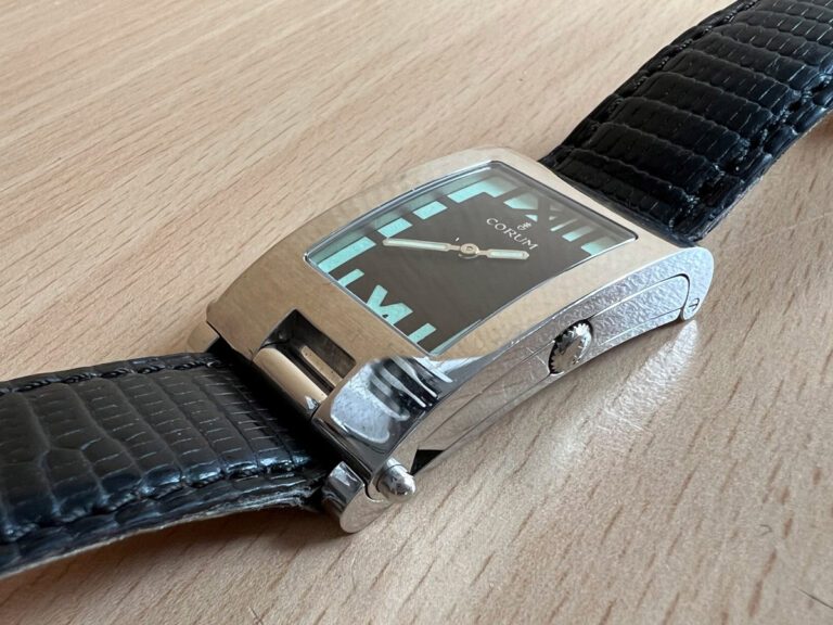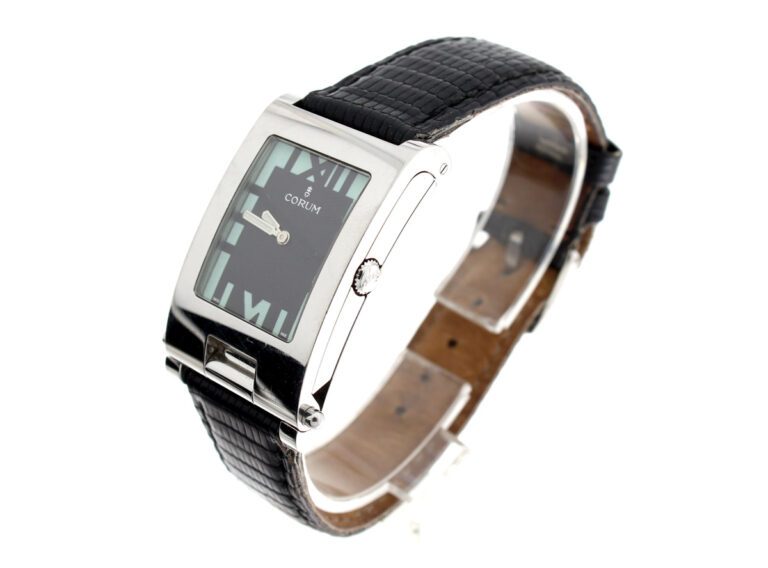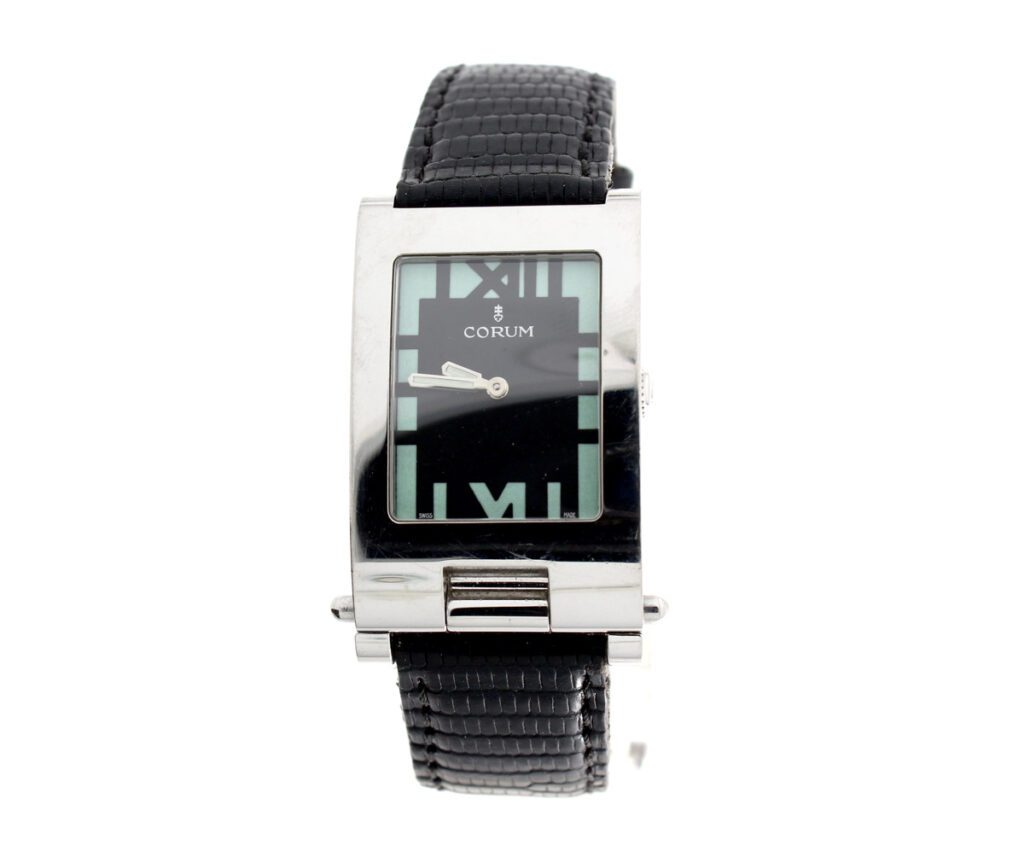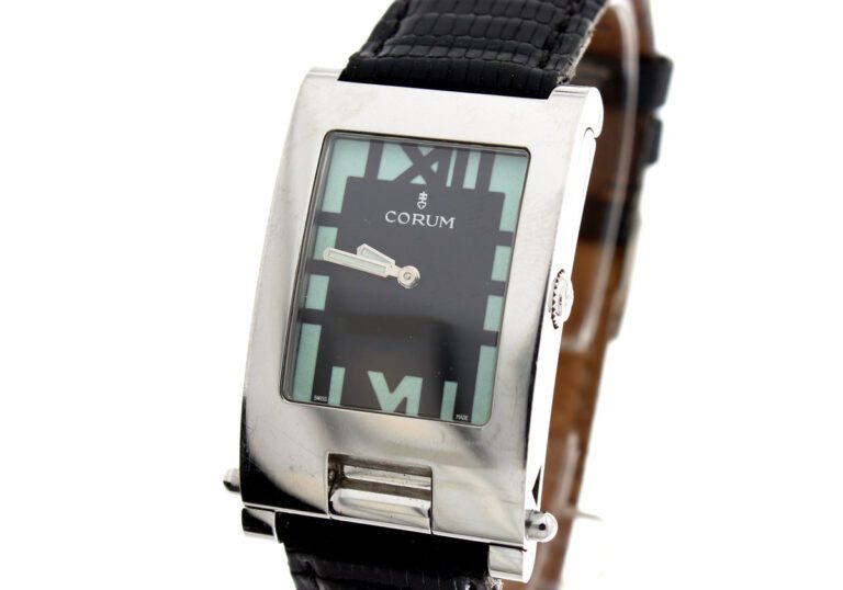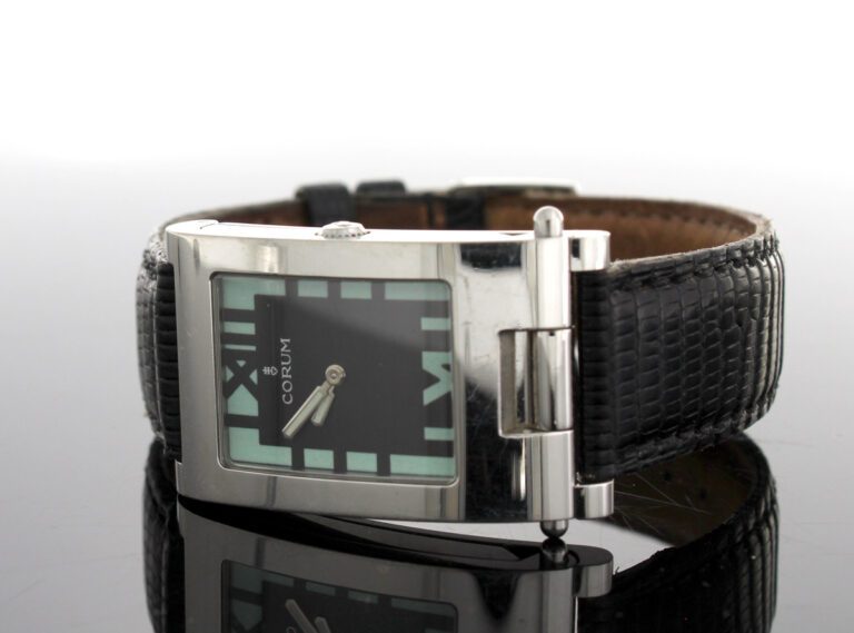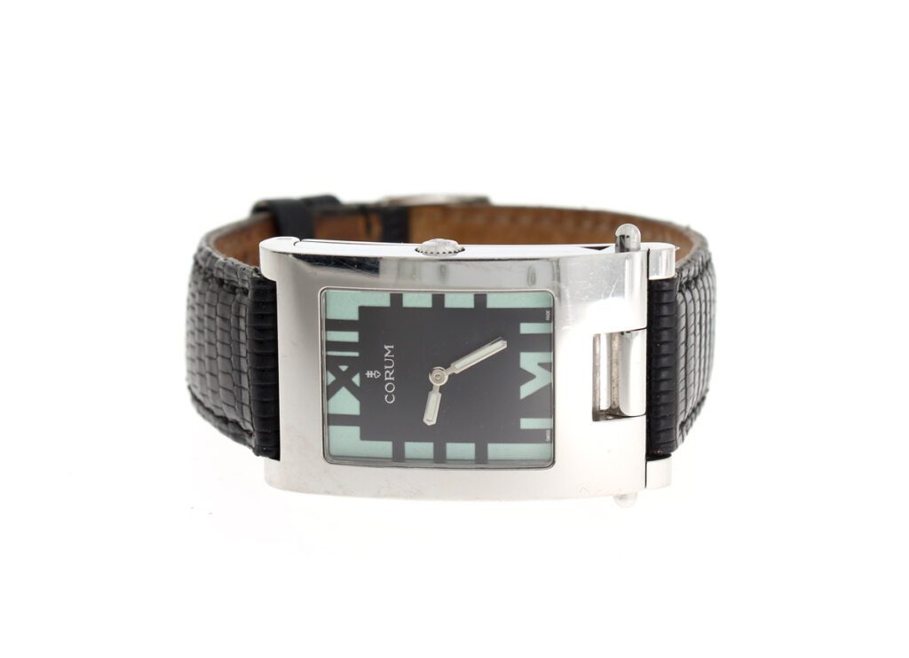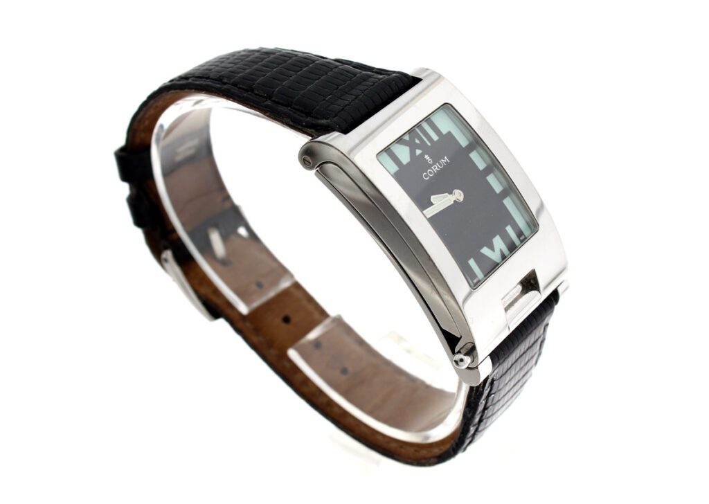 CORUM Tabogan Herrenuhr mit aufklappbaren Edelstahlgehäuse, Quartzwerk und Leuchtzeiger.