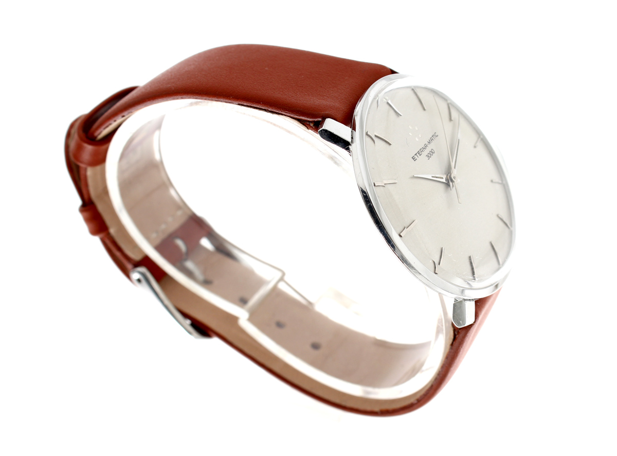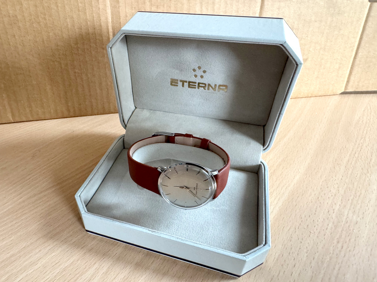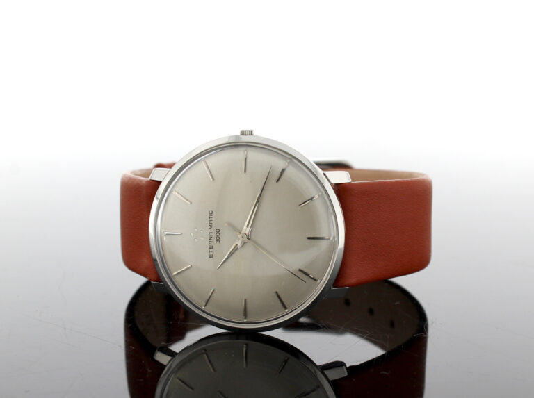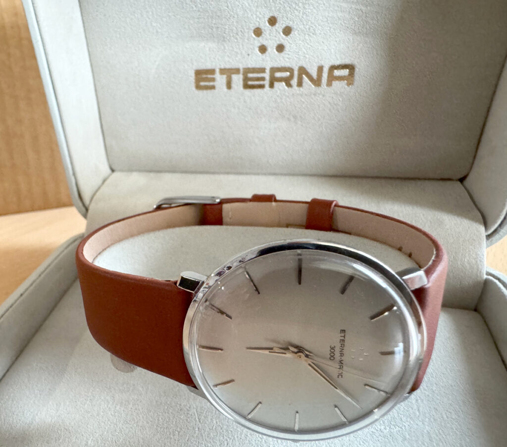 ETERNA MATIC 3000 Herrenuhr mit Edelstahlgehäuse, Eterna-Automatikwerk, Lederband, Zentralsekunde und Originalbox.