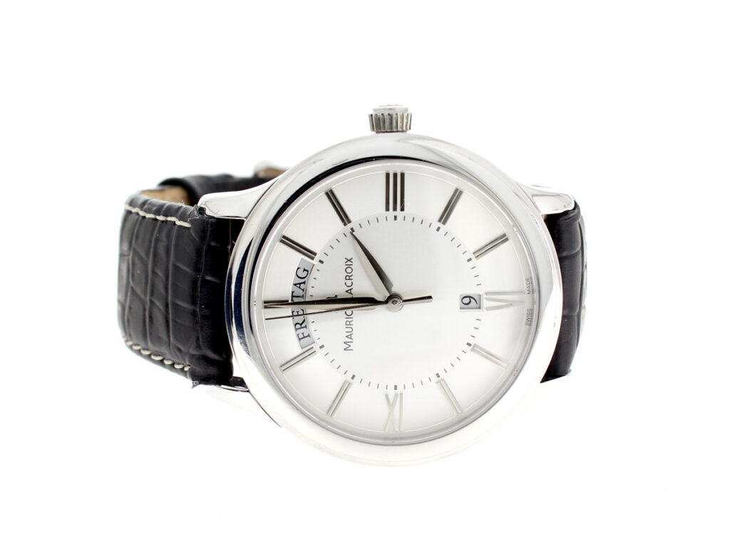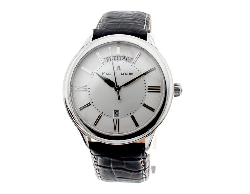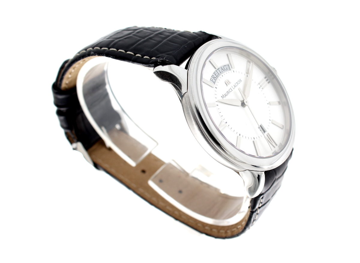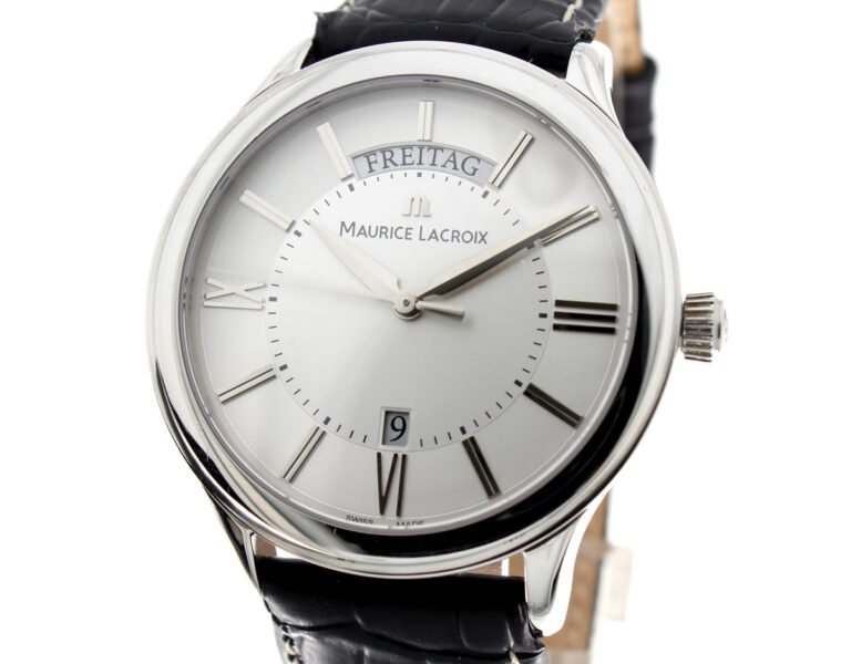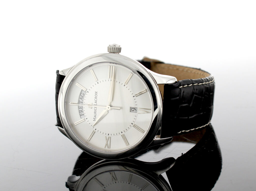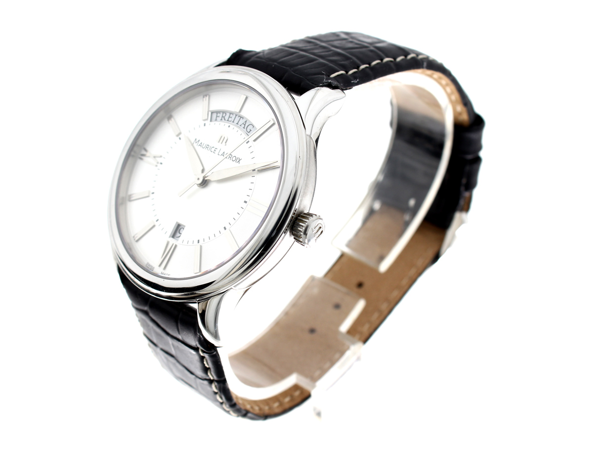MAURICE LACROIX Herrenuhr mit Edelstahlgehäuse, ETA-Quartzwerk, Lederband, DayDate und Originalbox.