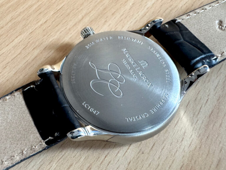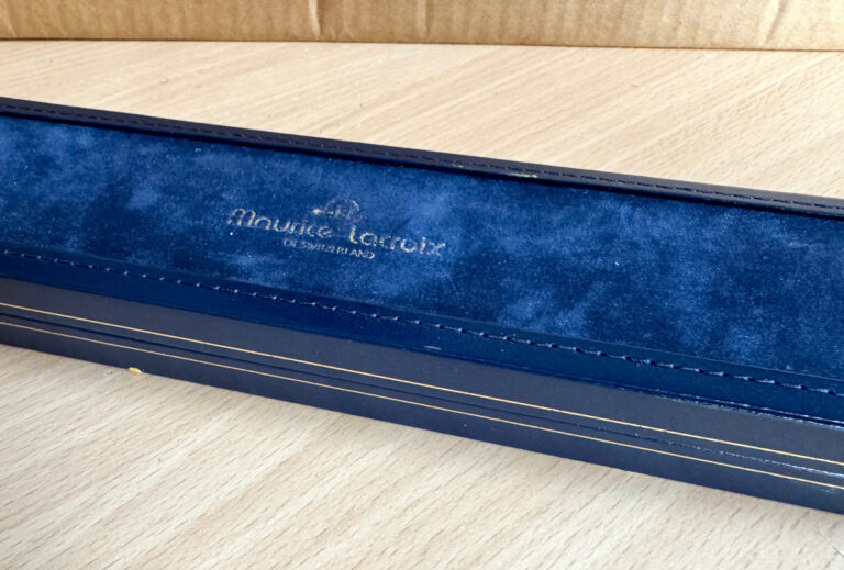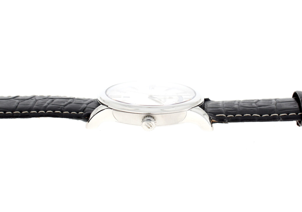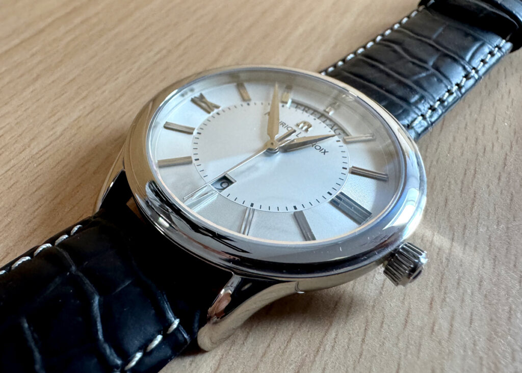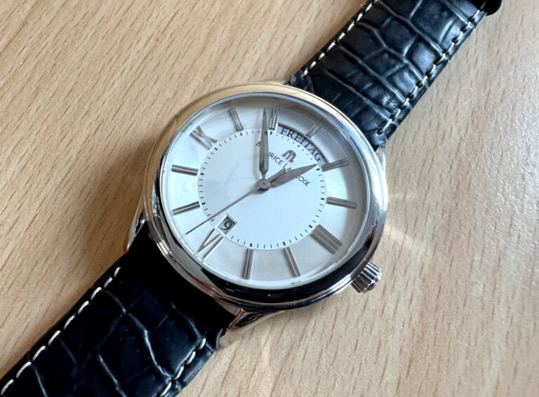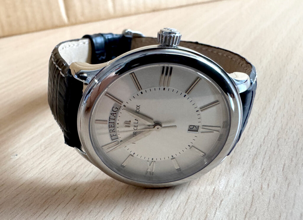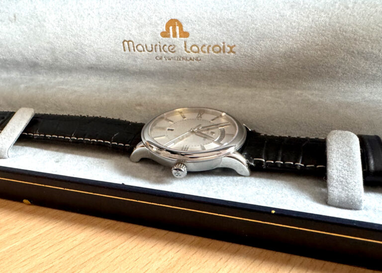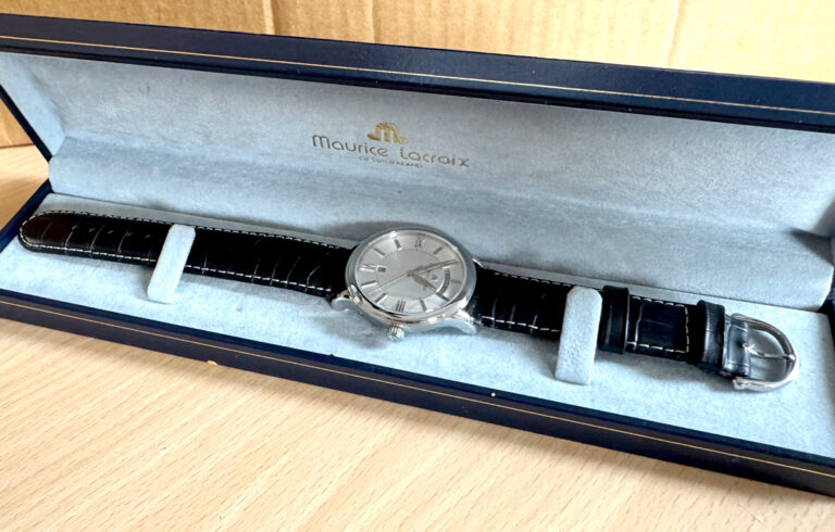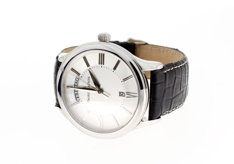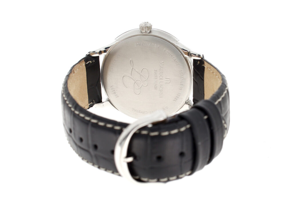 MAURICE LACROIX Herrenuhr mit Edelstahlgehäuse, ETA-Quartzwerk, Lederband, DayDate und Originalbox.