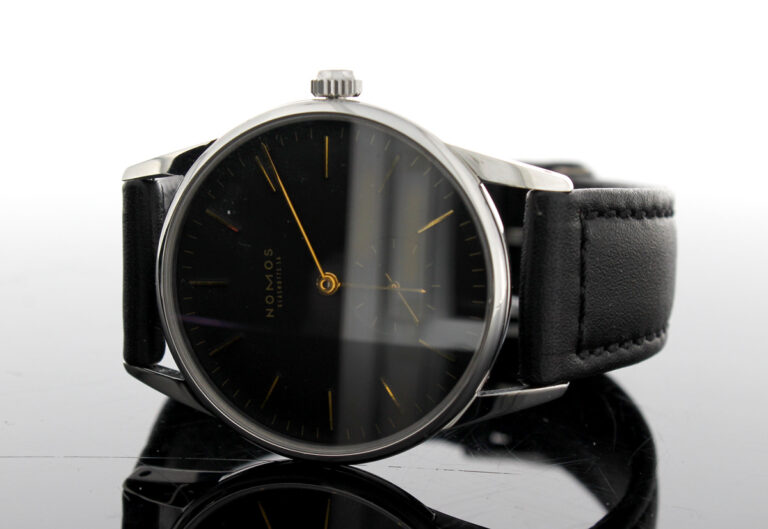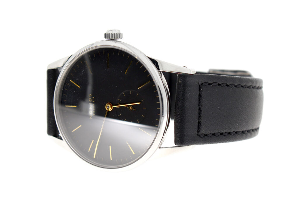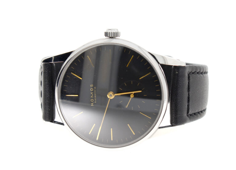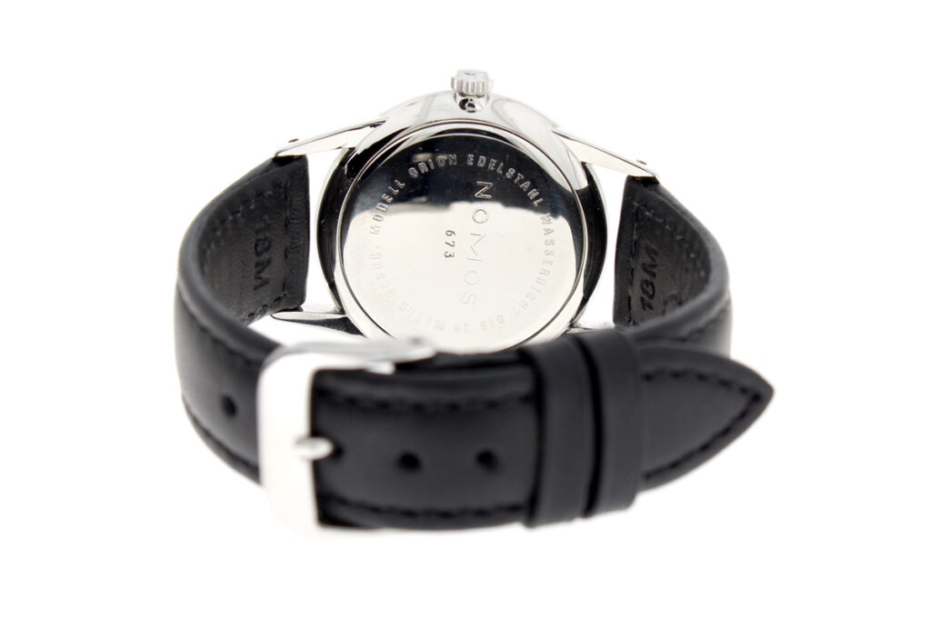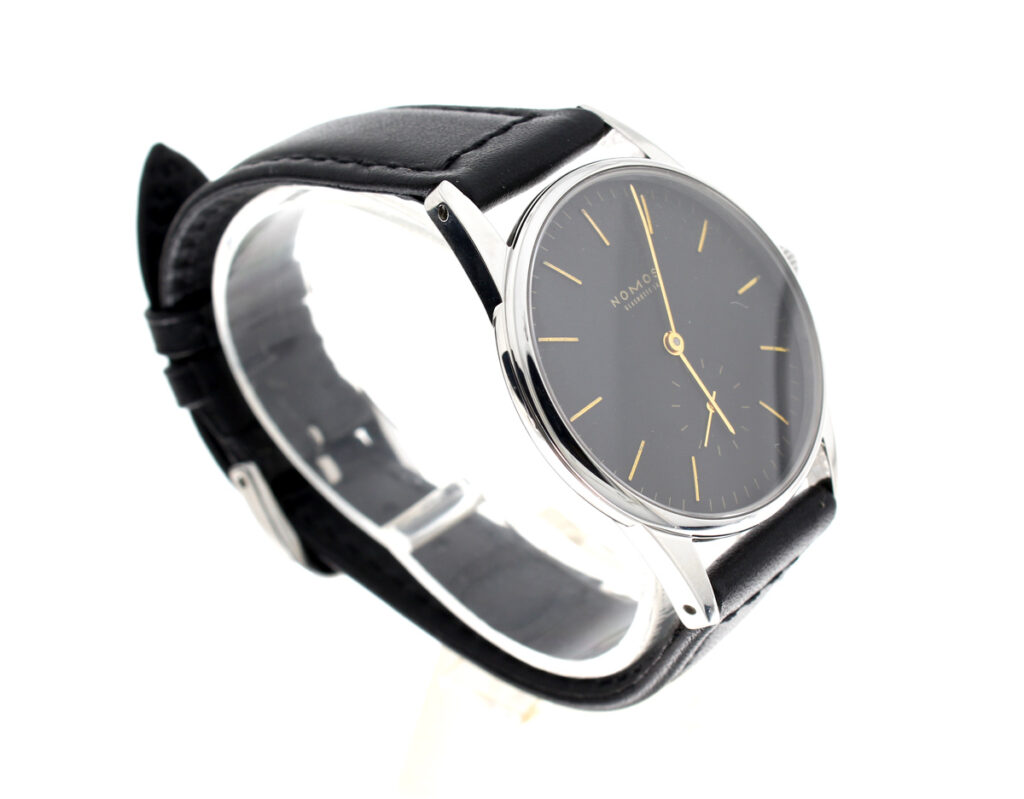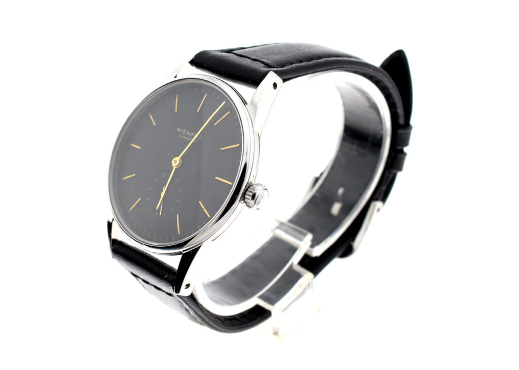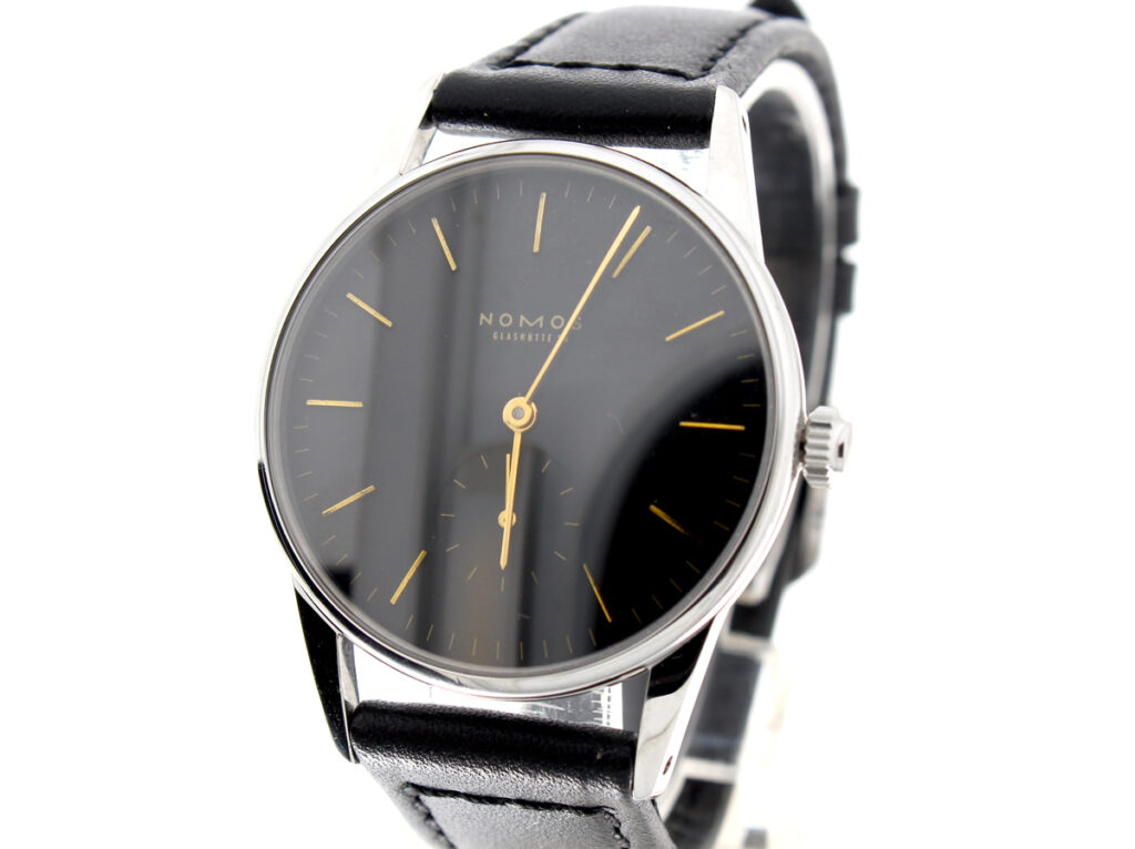 NOMOS Glashütte Orion Herrenuhr in Edelstahlgehäuse, Handaufzugswerk, Kleine Sekunde, Lederband und Original-Box.