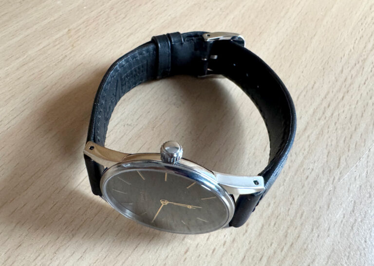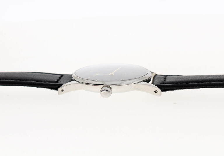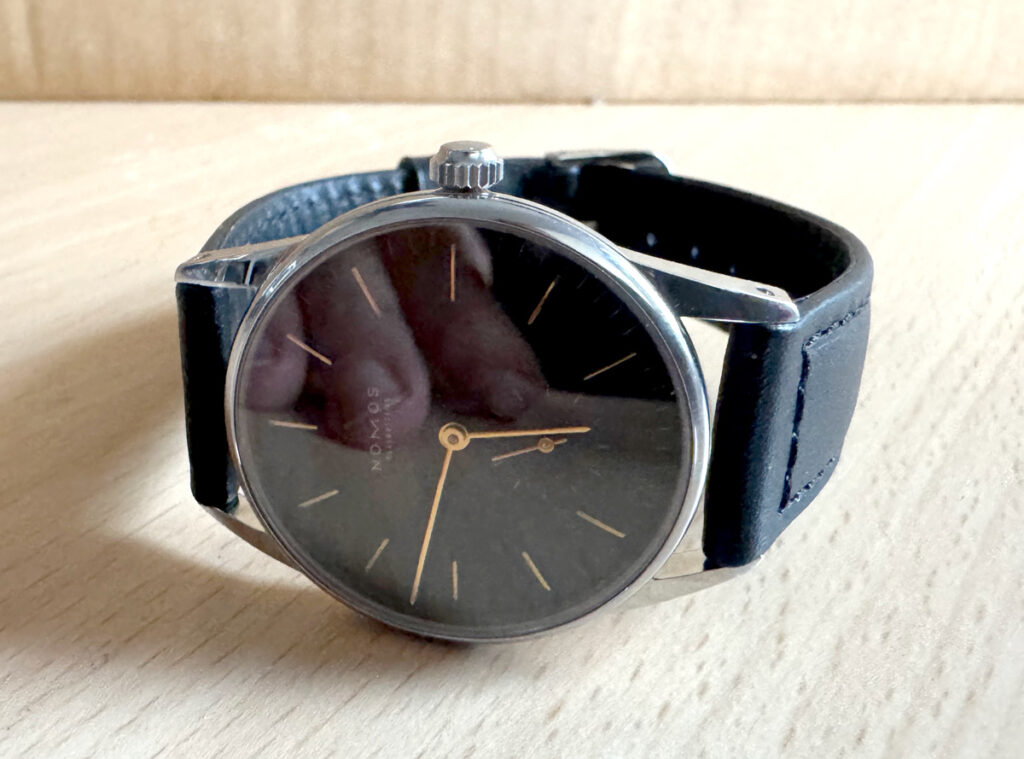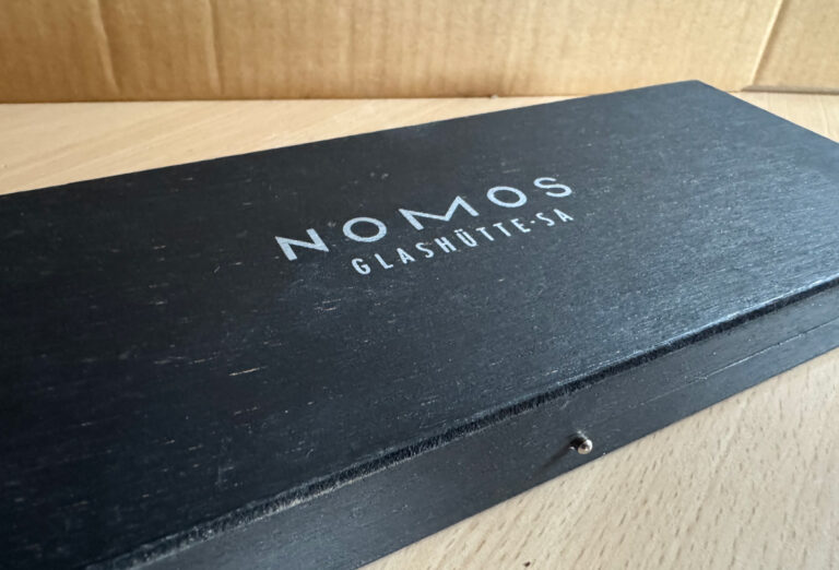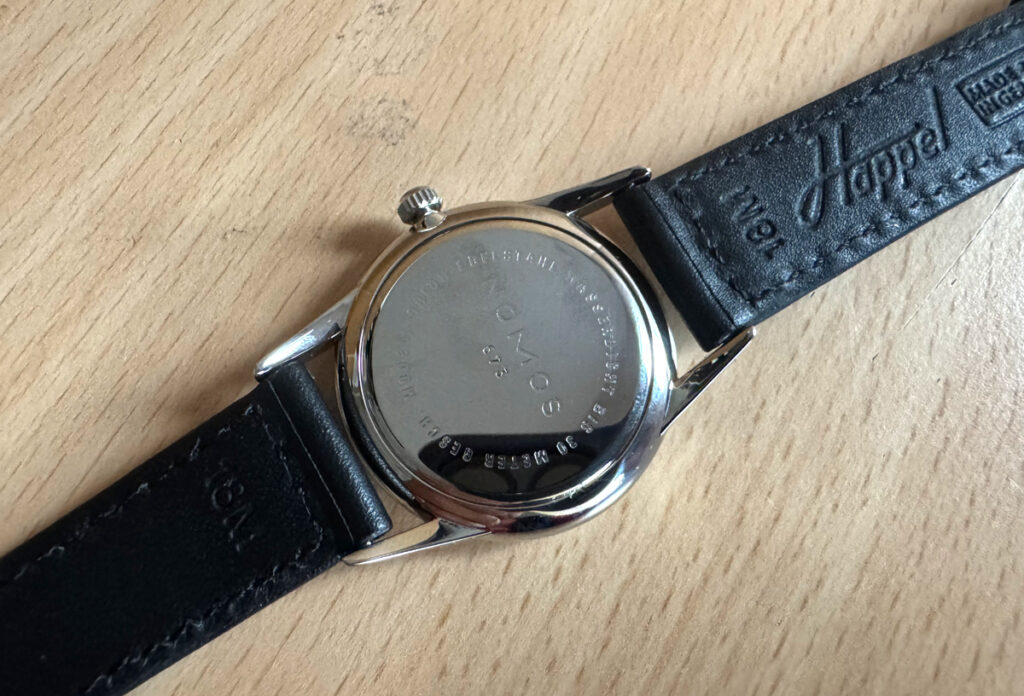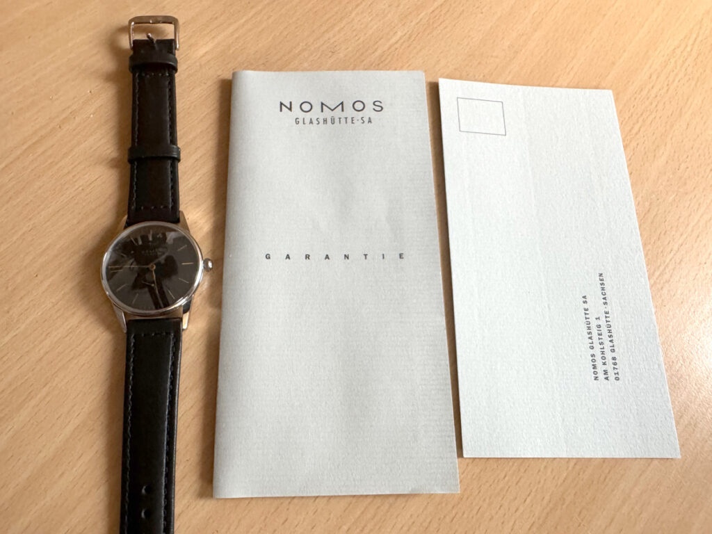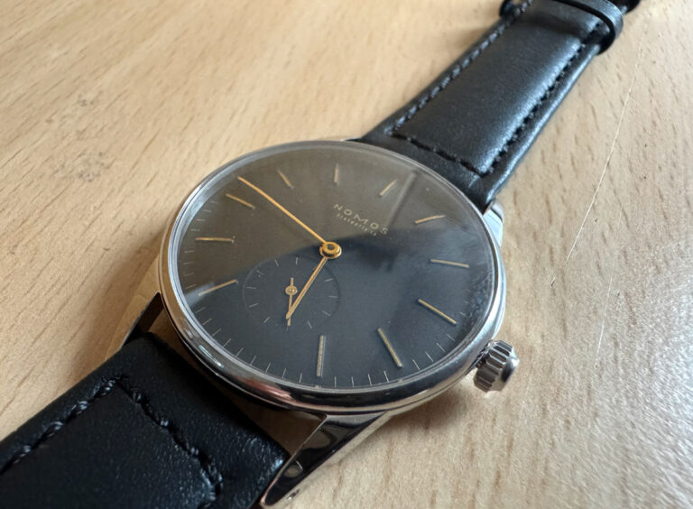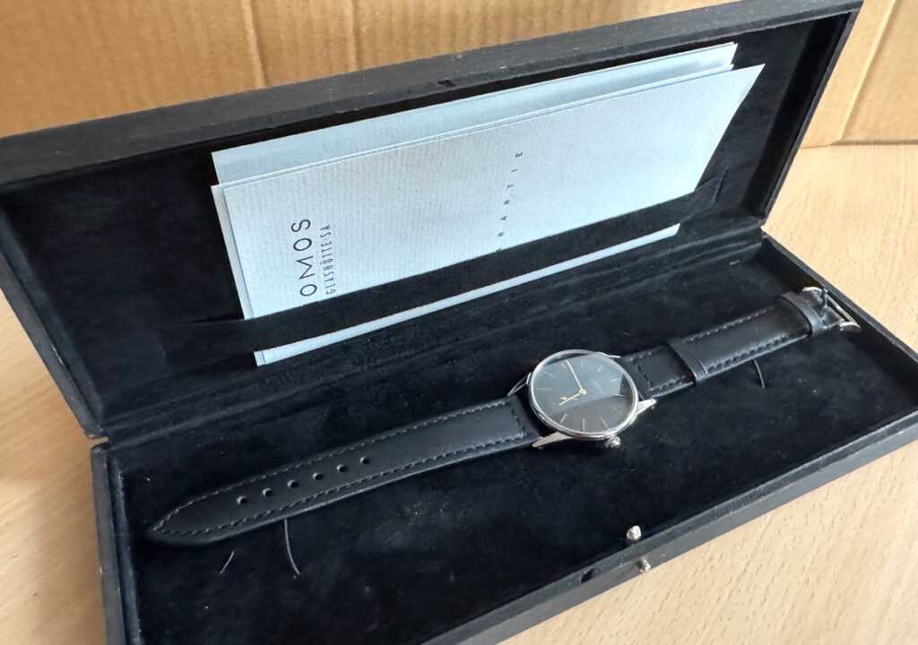 NOMOS Glashütte Orion Herrenuhr in Edelstahlgehäuse, Handaufzugswerk, Kleine Sekunde, Lederband und Original-Box.