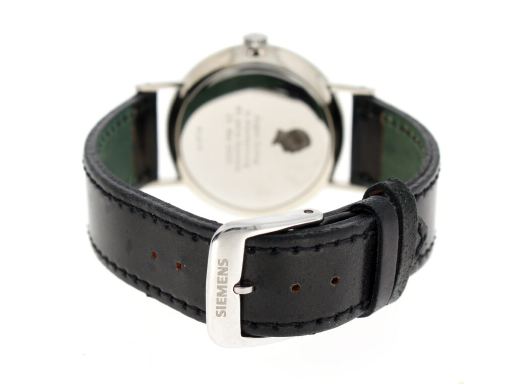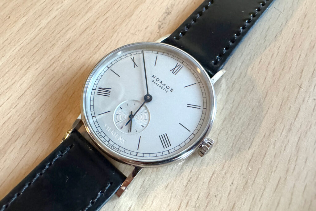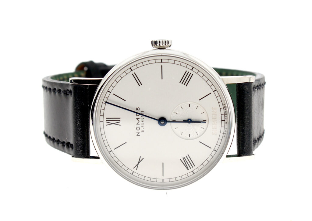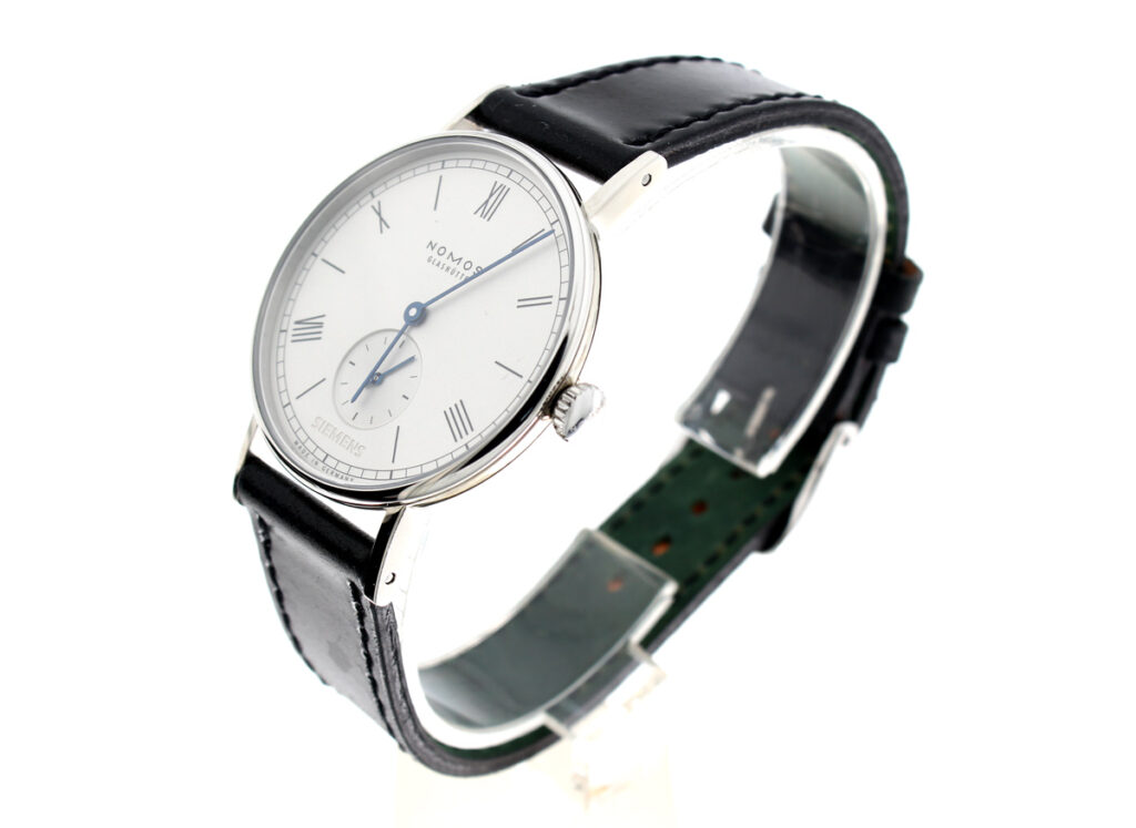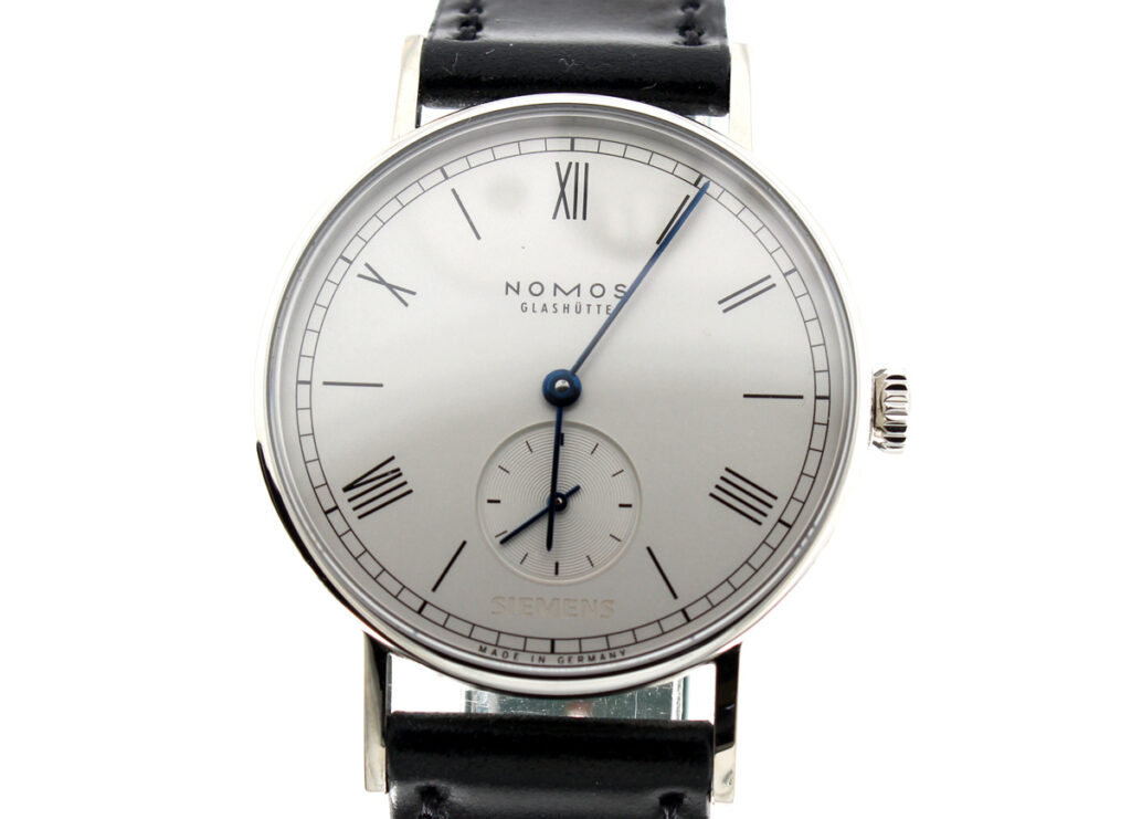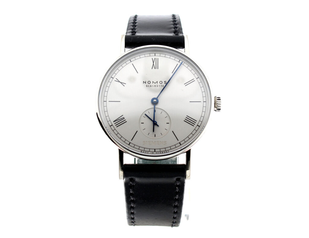 NOMOS GLASHÜTTE Sonderedition Siemens Ungetragene Herrenuhr in Edelstahlgehäuse, Handaufzug, Original-Lederband und Original-Dornschließe.