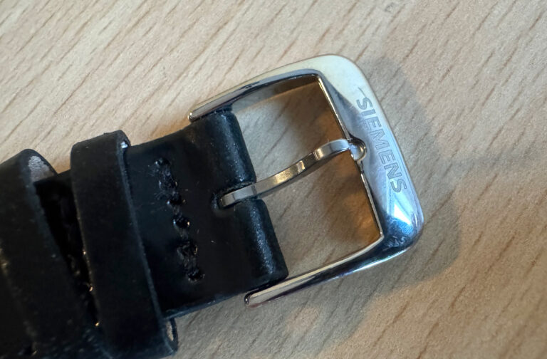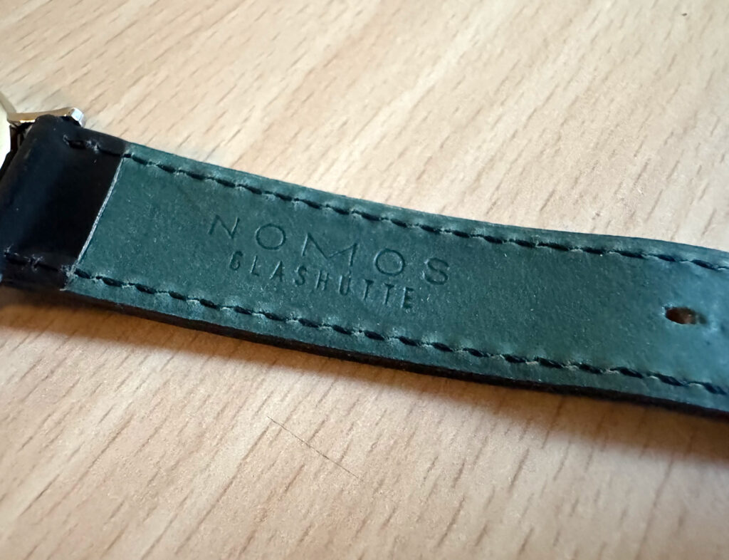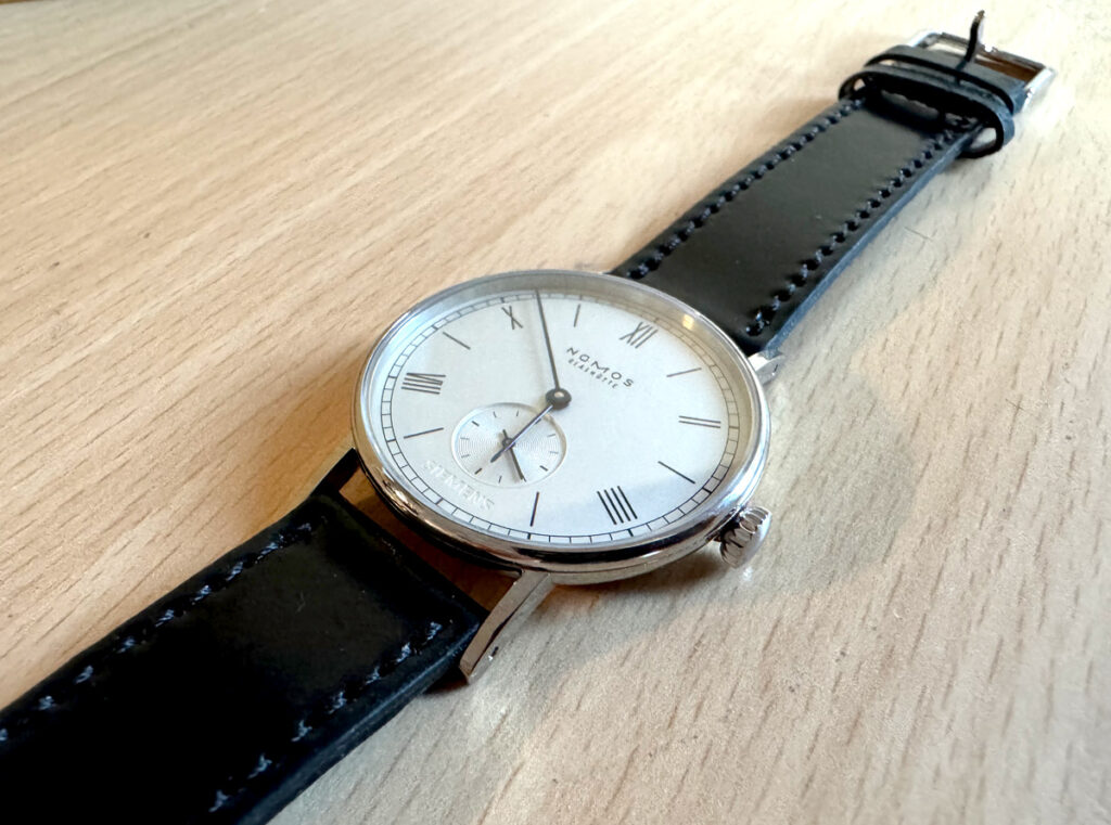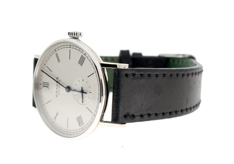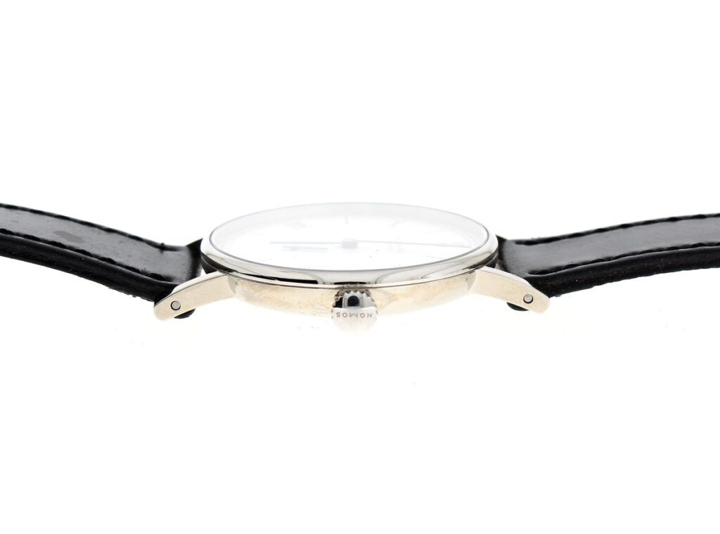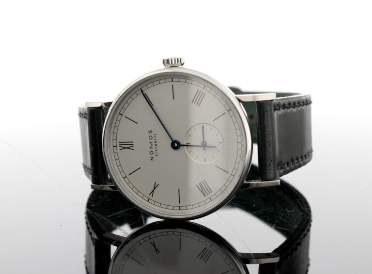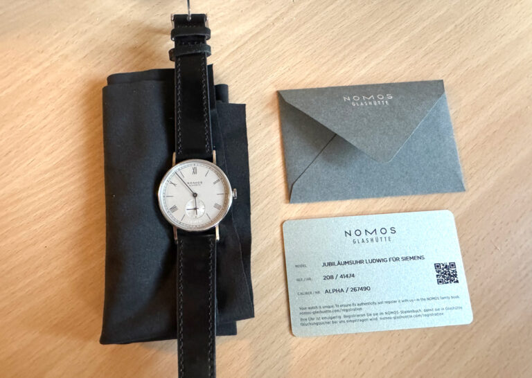 NOMOS GLASHÜTTE Sonderedition Siemens Ungetragene Herrenuhr in Edelstahlgehäuse, Handaufzug, Original-Lederband und Original-Dornschließe.