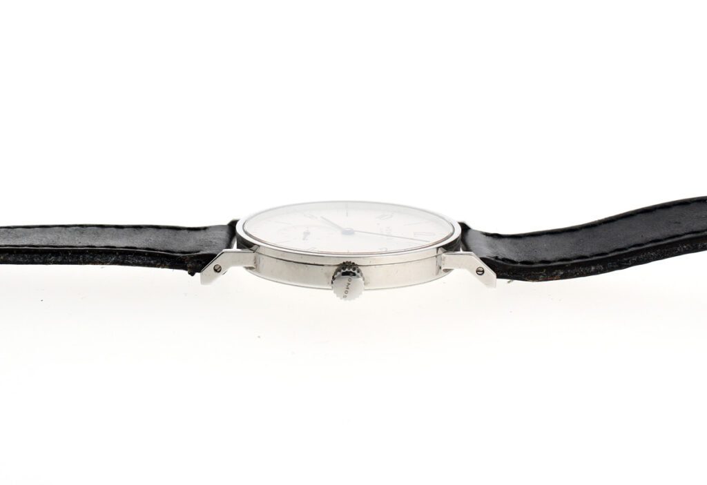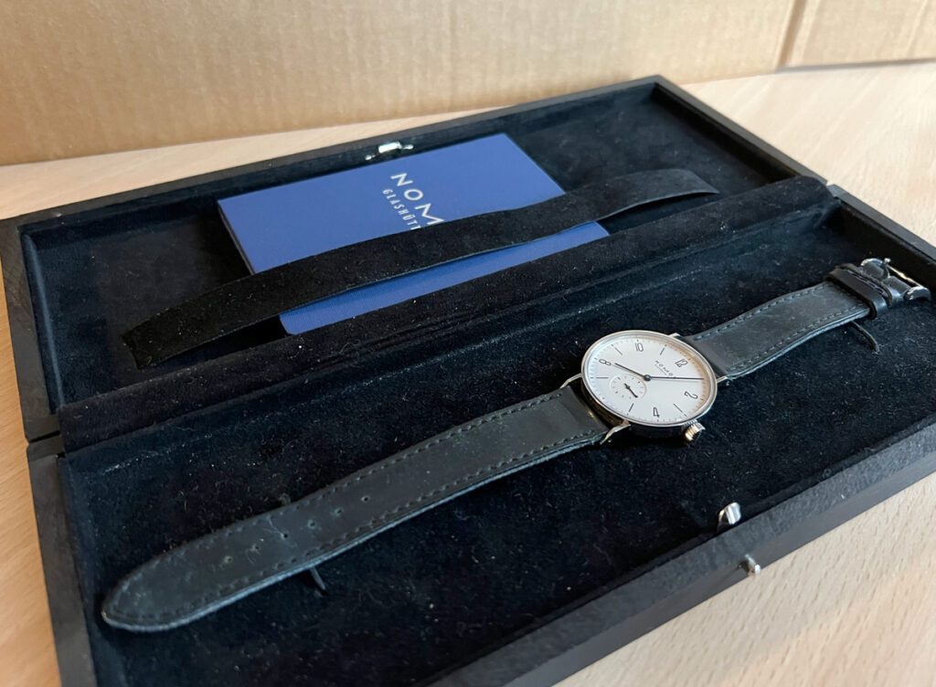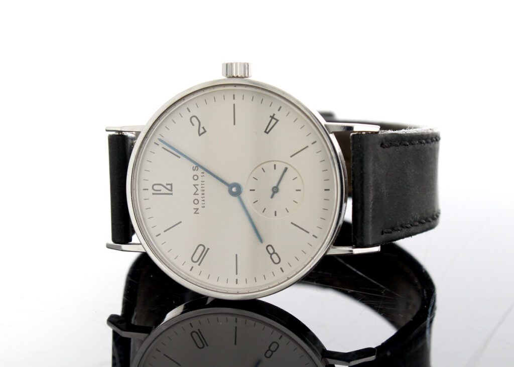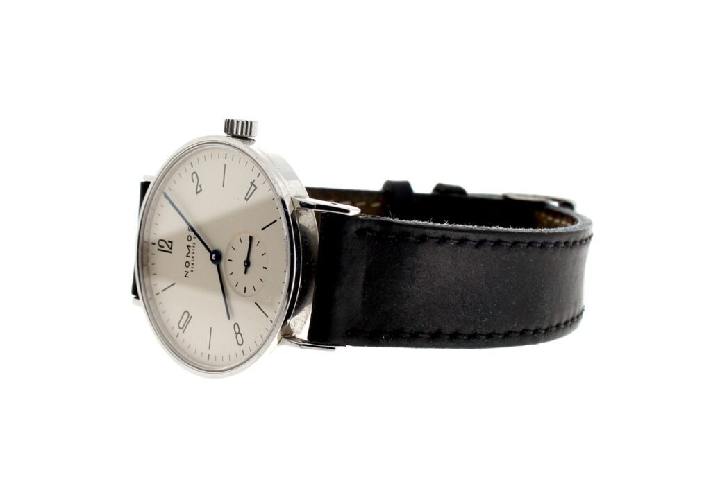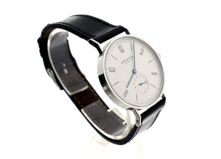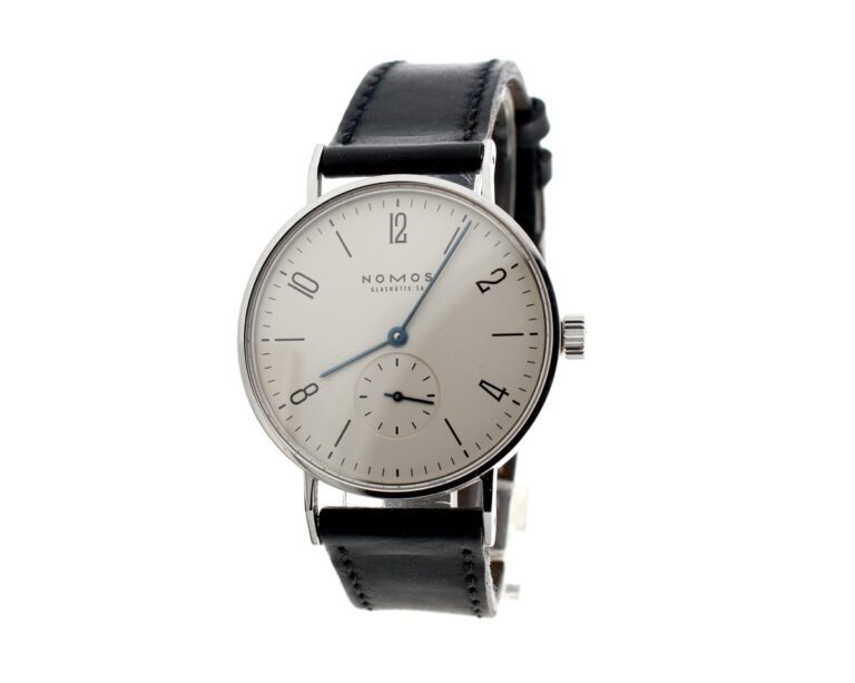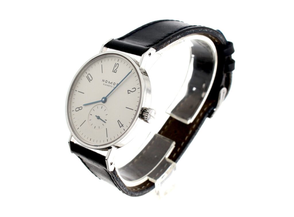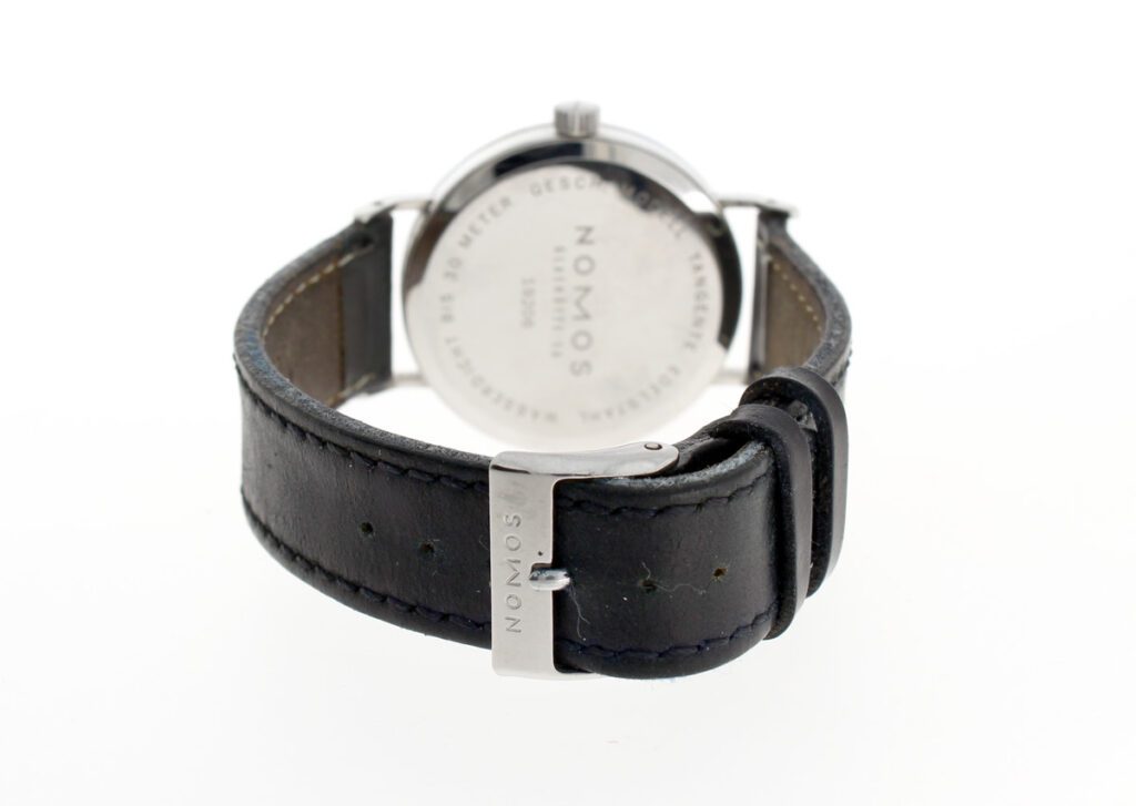 NOMOS GLASHÜTTE Tangente Herrenuhr mit Edelstahlgehäuse, Quartzwerk, Lederband und Original-Holzbox.