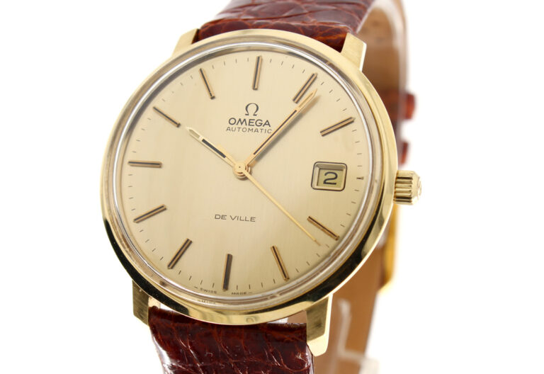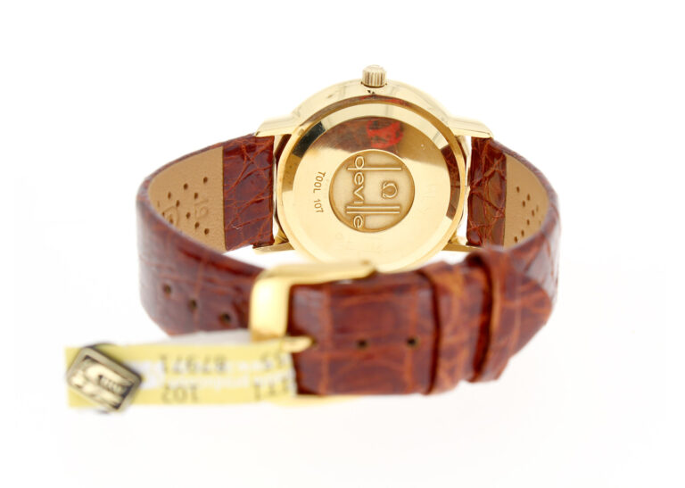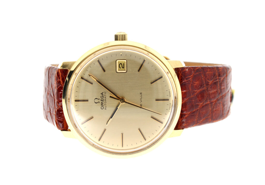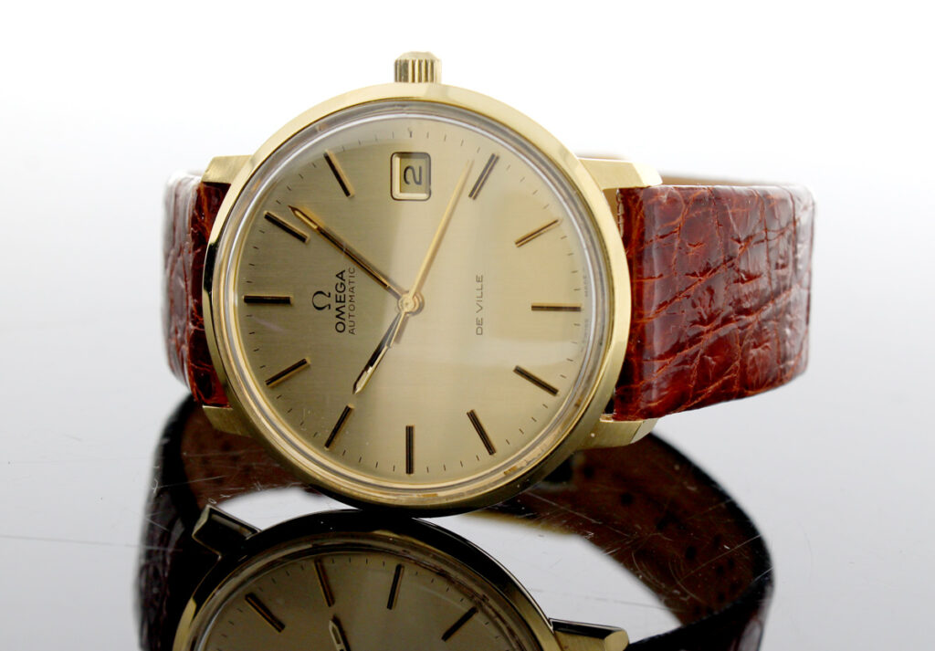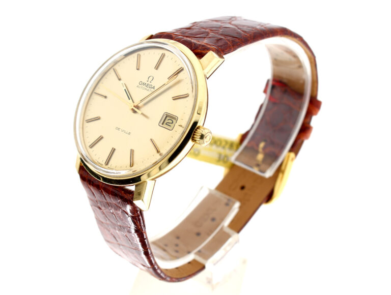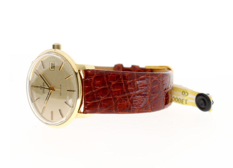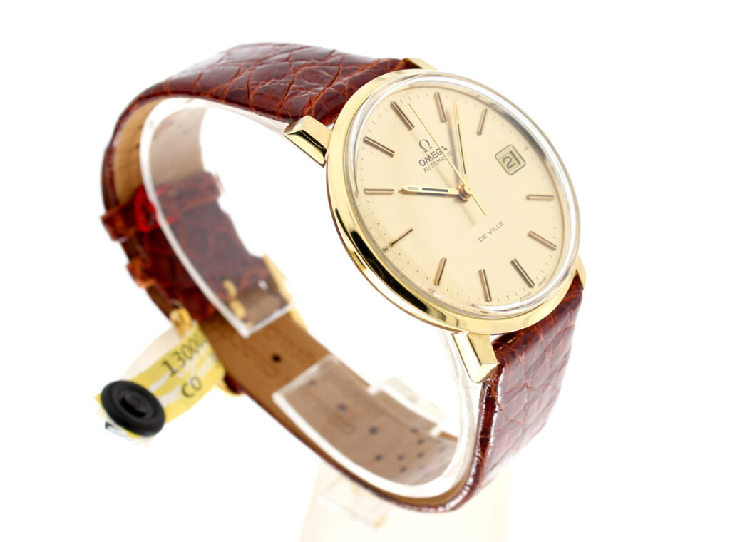 OMEGA DeVille Herrenuhr in 18-Karat-Goldgehäuse, Automatikwerk, Kroko-Lederband und Dornschließe.