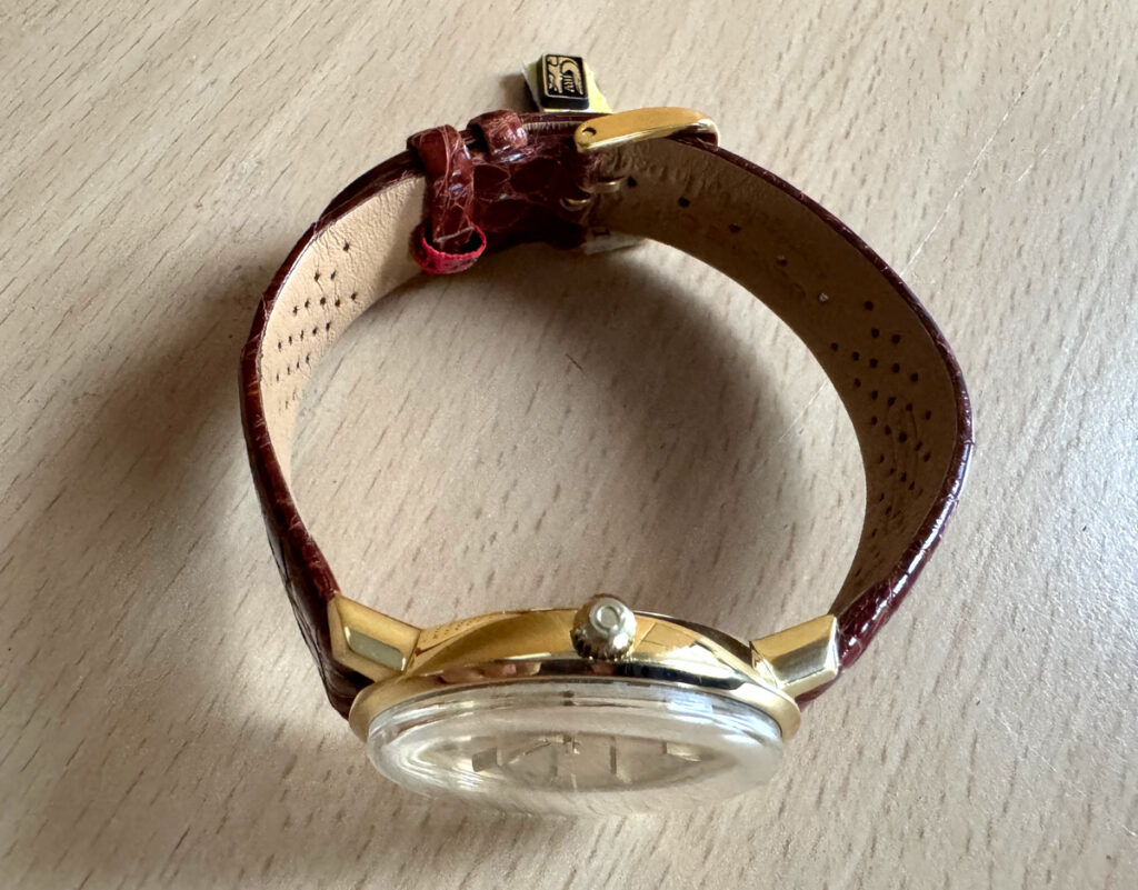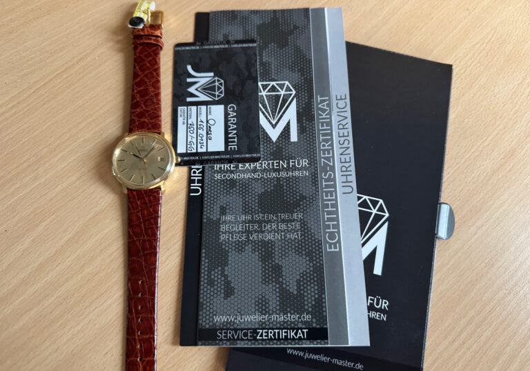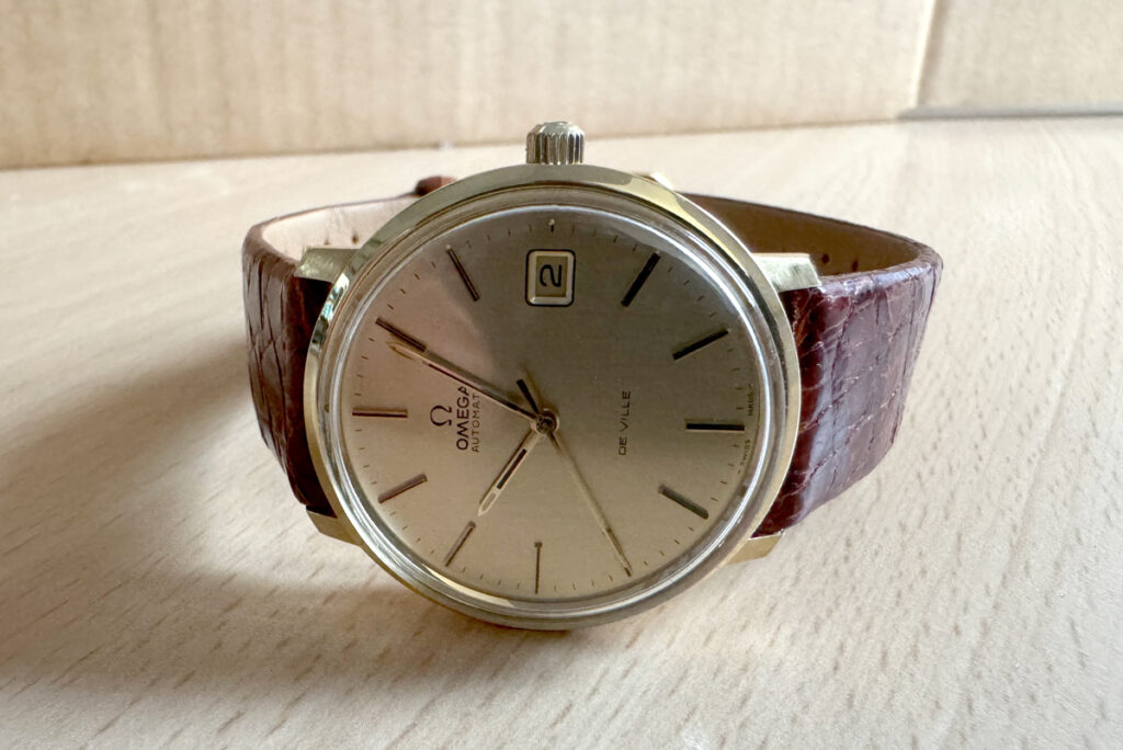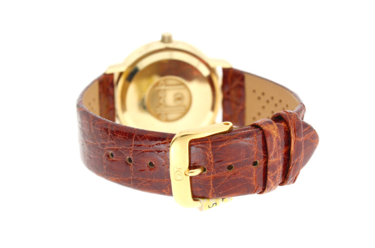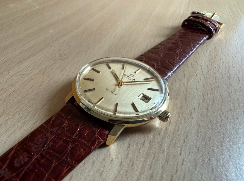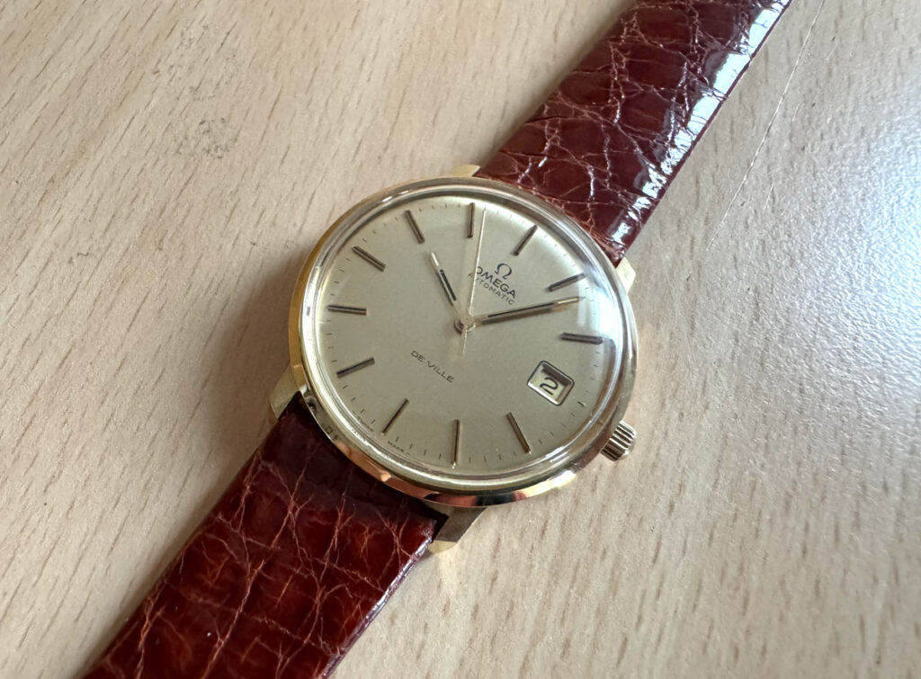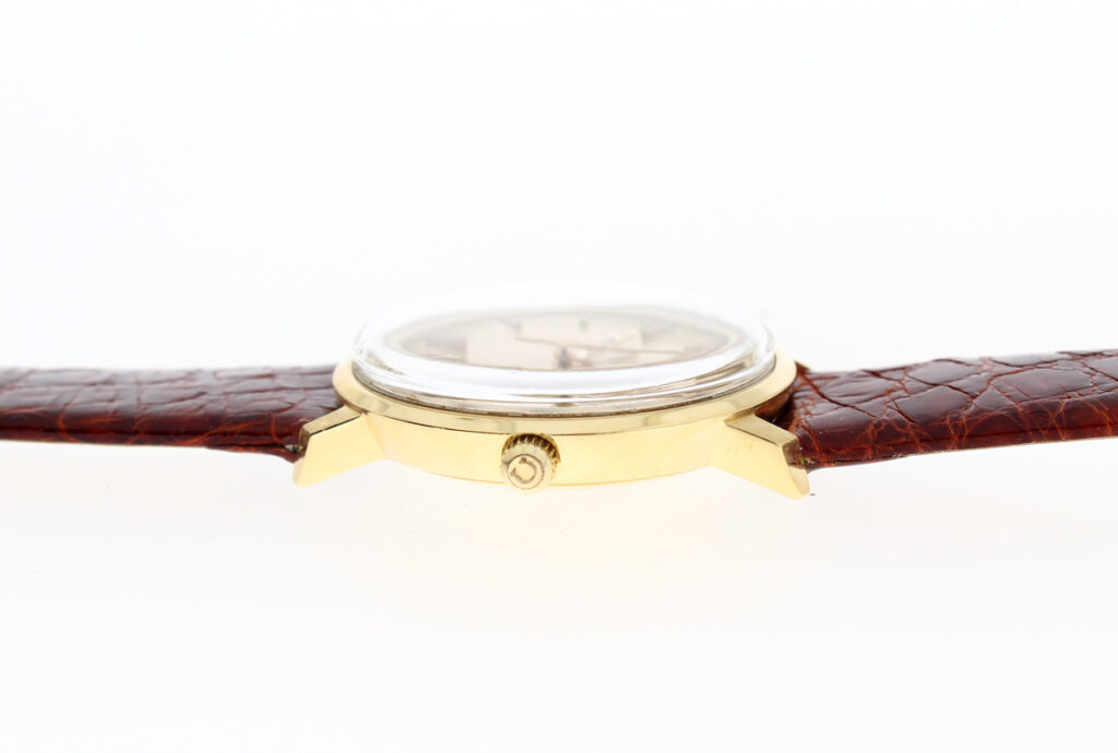 OMEGA DeVille Herrenuhr in 18-Karat-Goldgehäuse, Automatikwerk, Kroko-Lederband und Dornschließe.