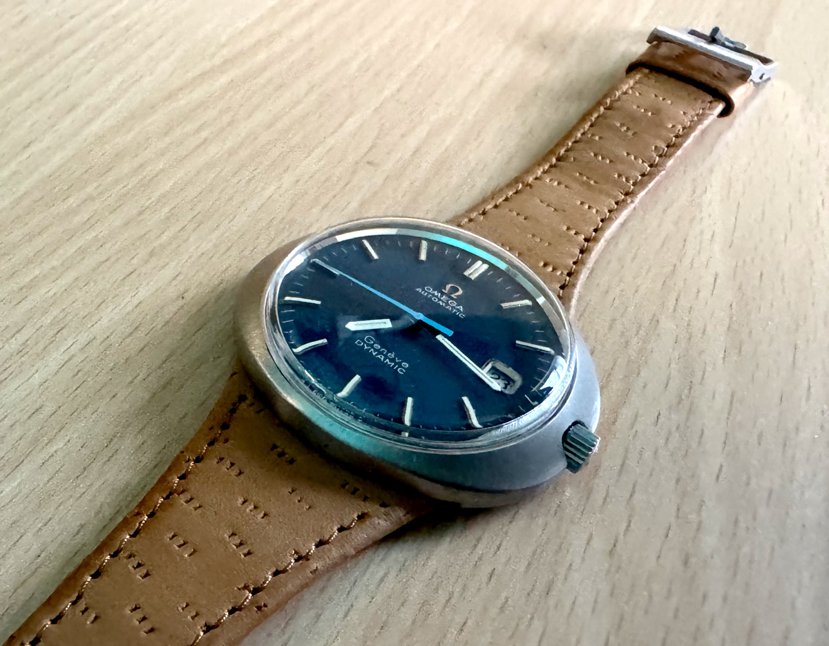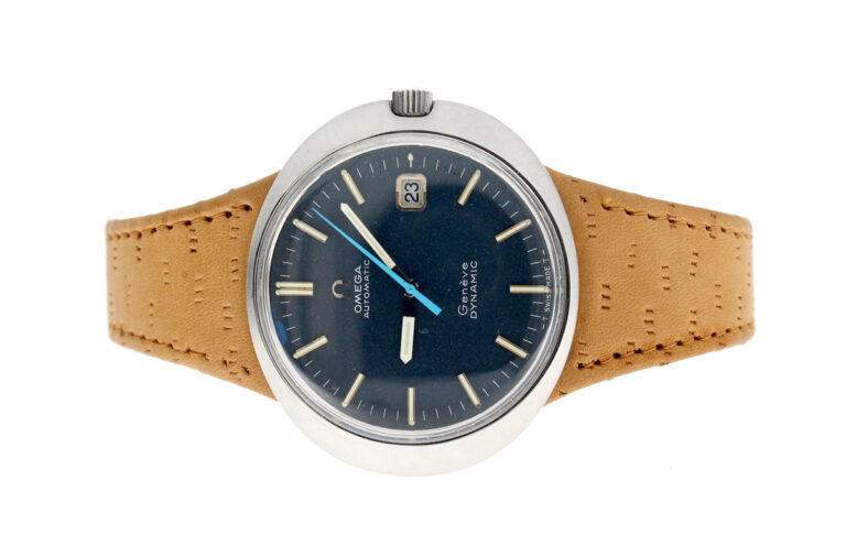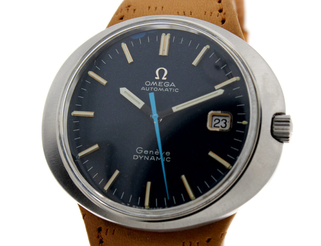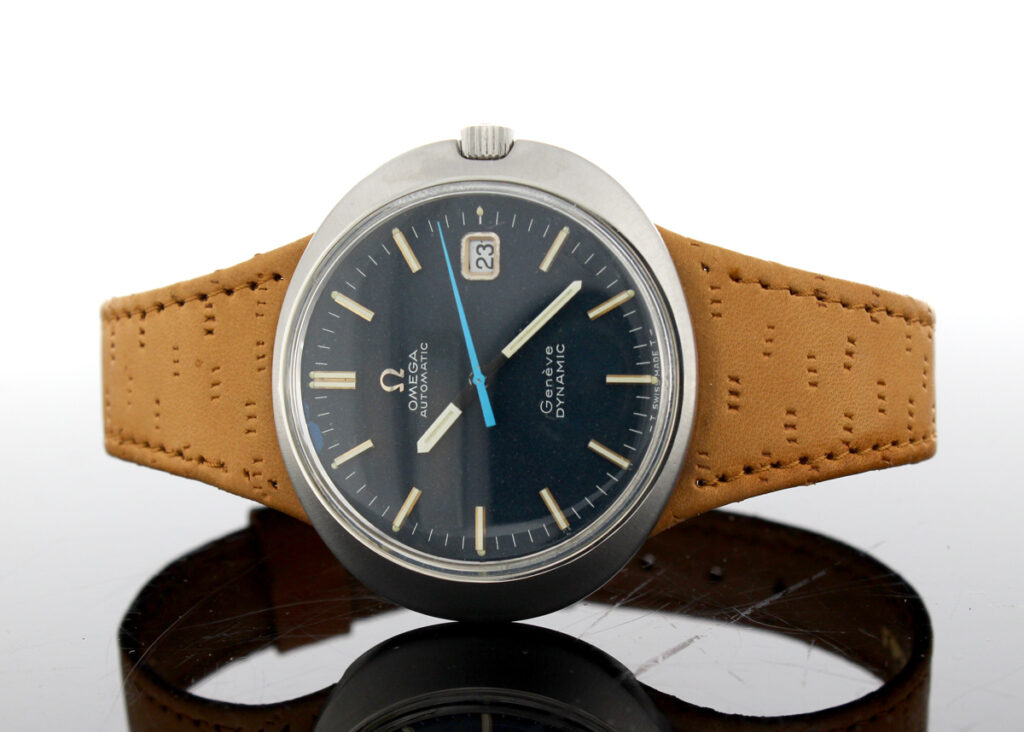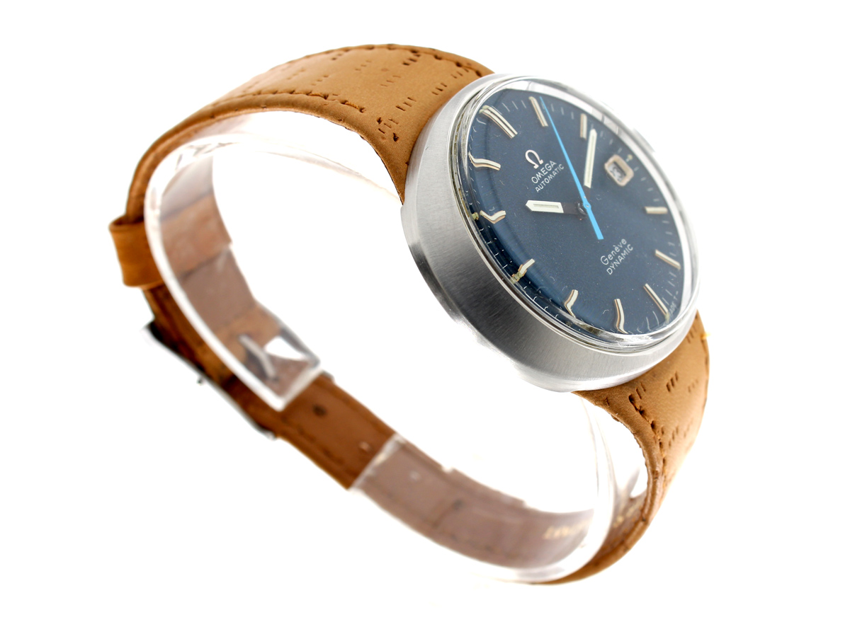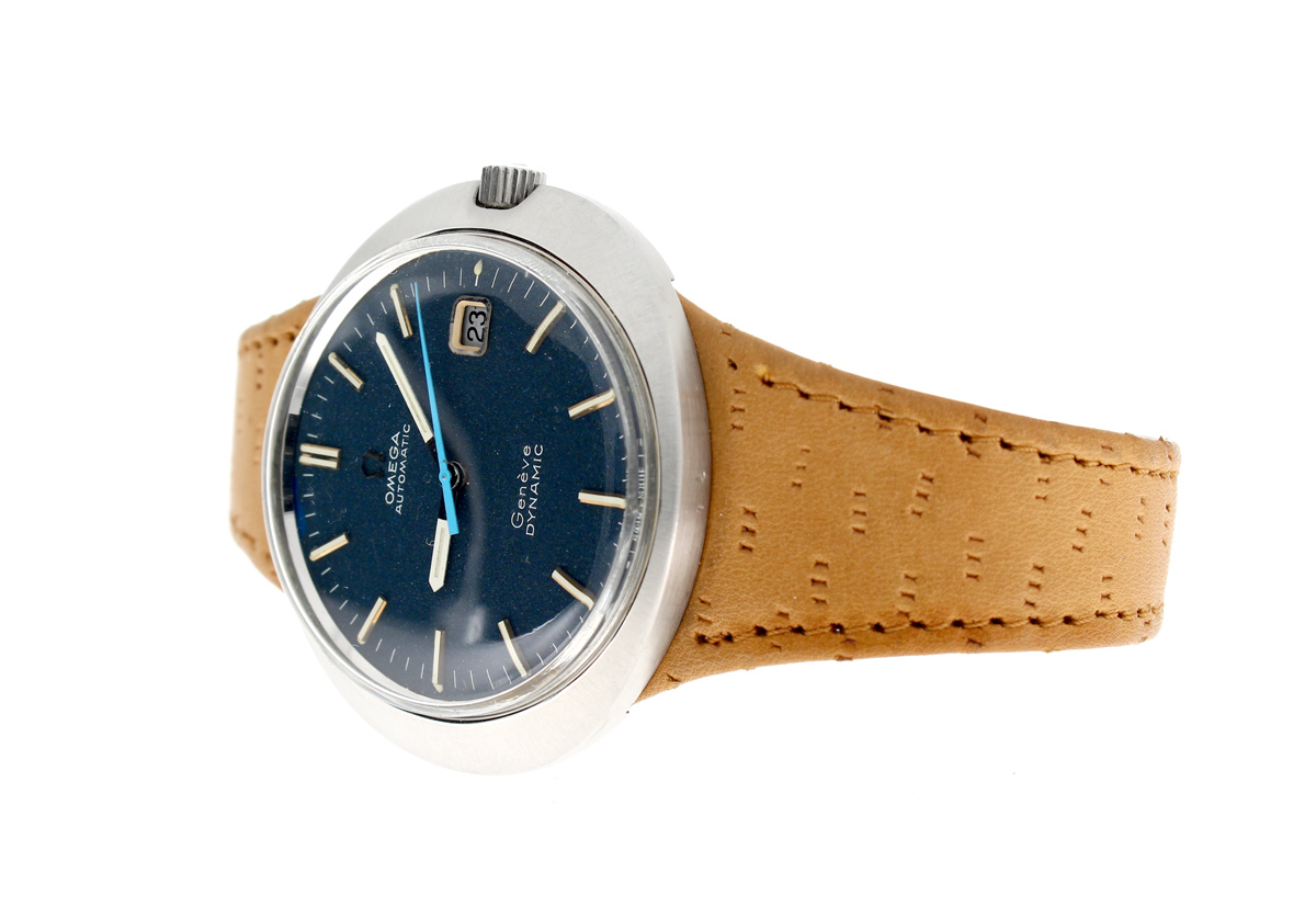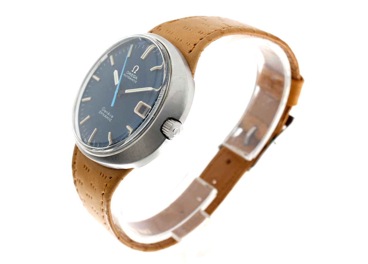 OMEGA Geneve Dynamie Herrenuhr mit Edelstahlgehäuse, Omega-Automatikwerk, Lederband und Original-Dornschließe.