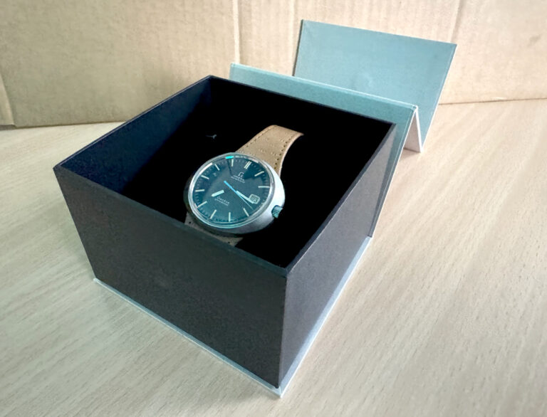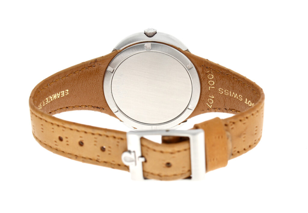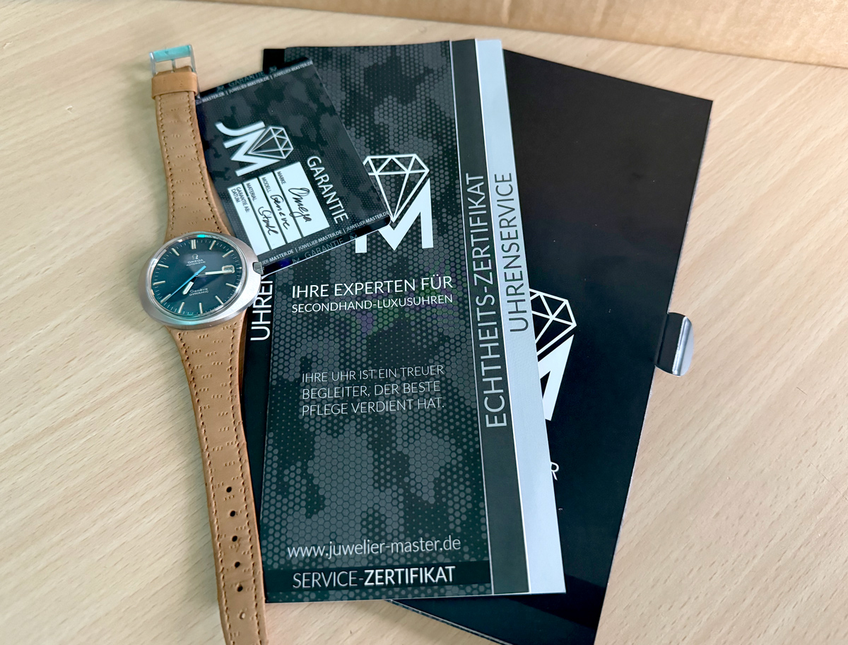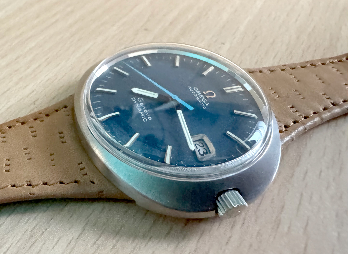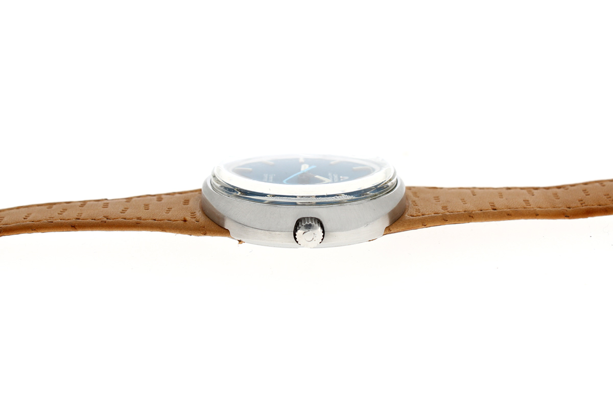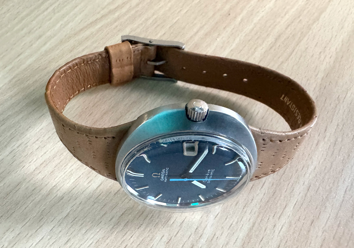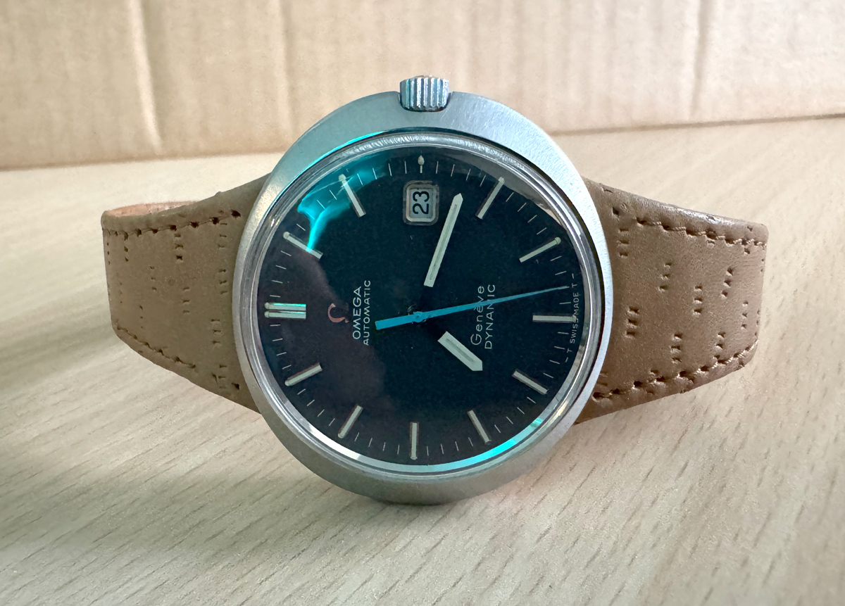 OMEGA Geneve Dynamie Herrenuhr mit Edelstahlgehäuse, Omega-Automatikwerk, Lederband und Original-Dornschließe.