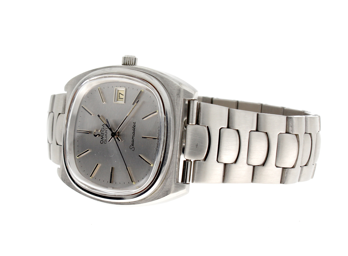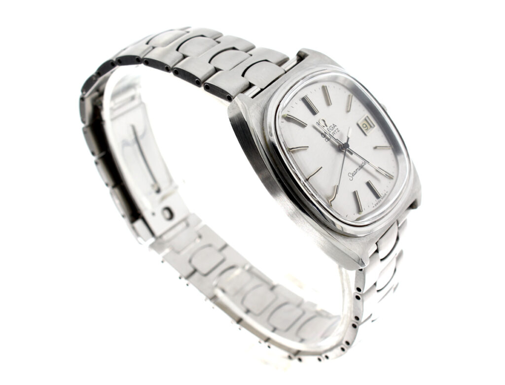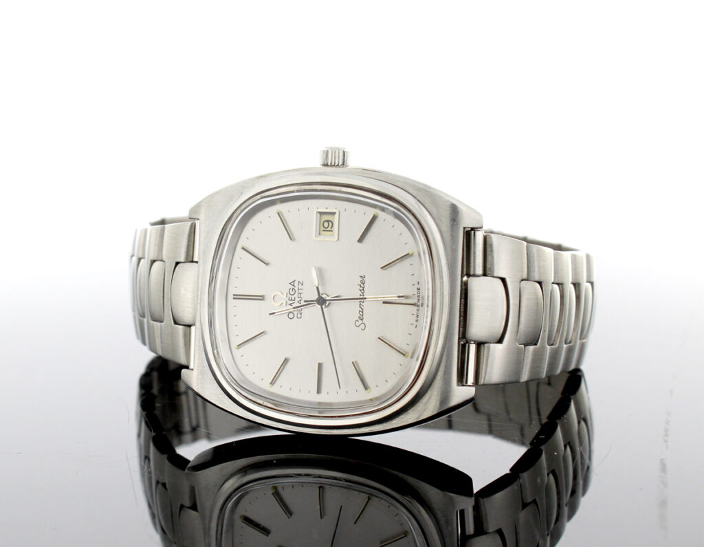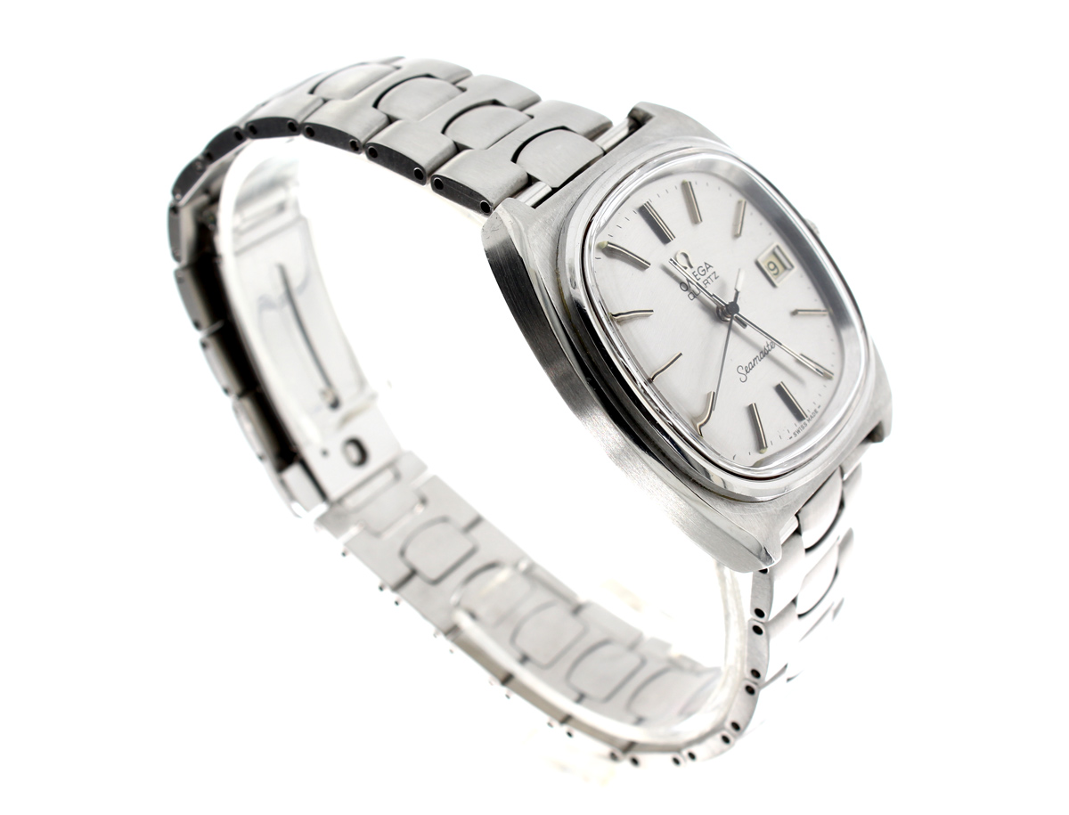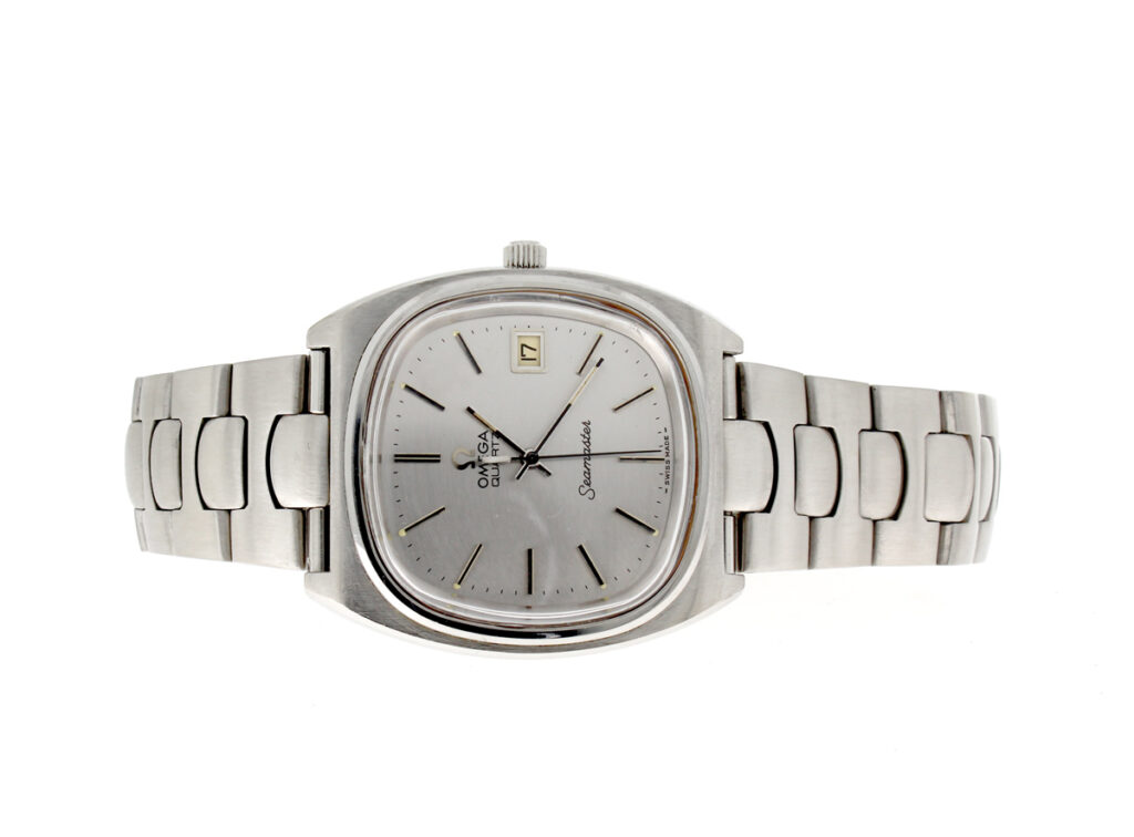 OMEGA Seamaster Herrenuhr mit Stahlgehäuse, Omega-Quartzwerk, Stahlband und Datum.