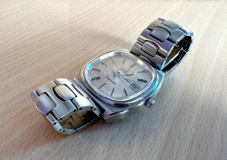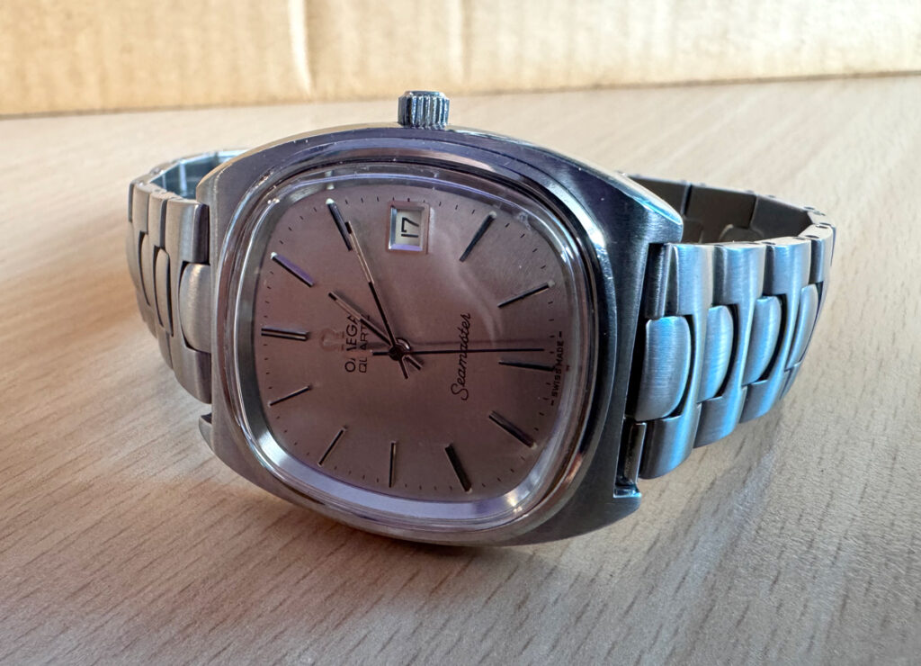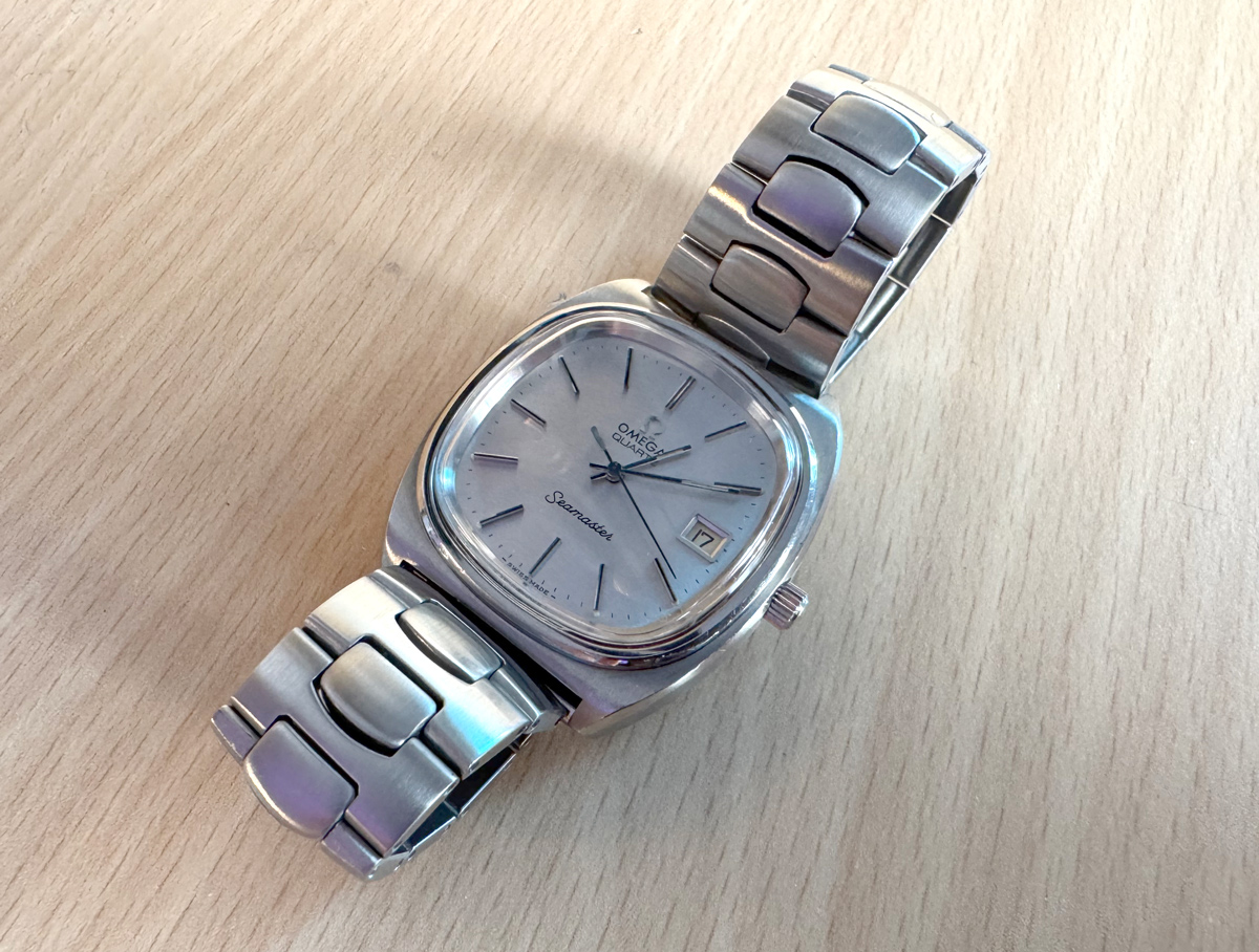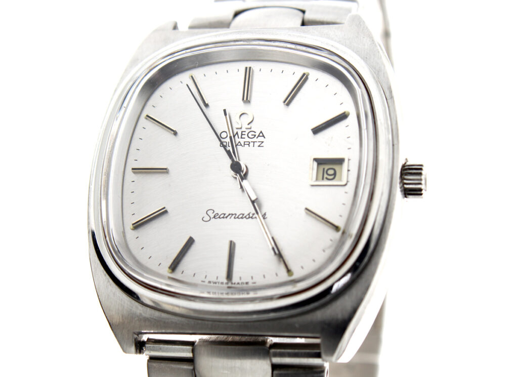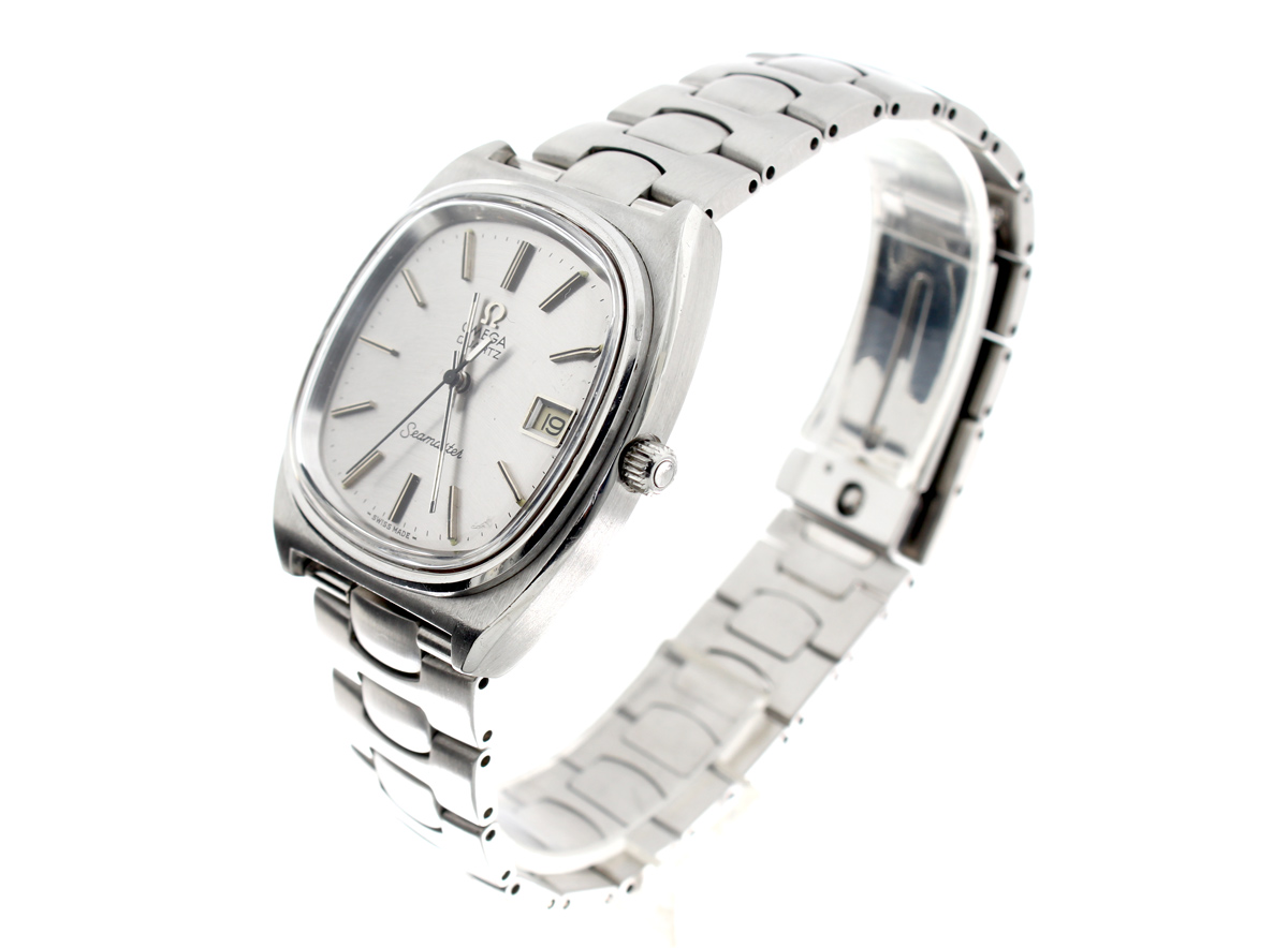 OMEGA Seamaster Herrenuhr mit Stahlgehäuse, Omega-Quartzwerk, Stahlband und Datum.