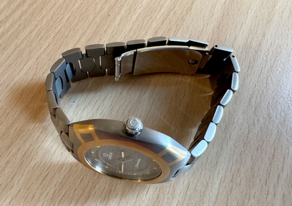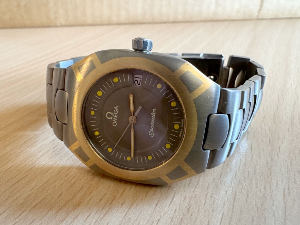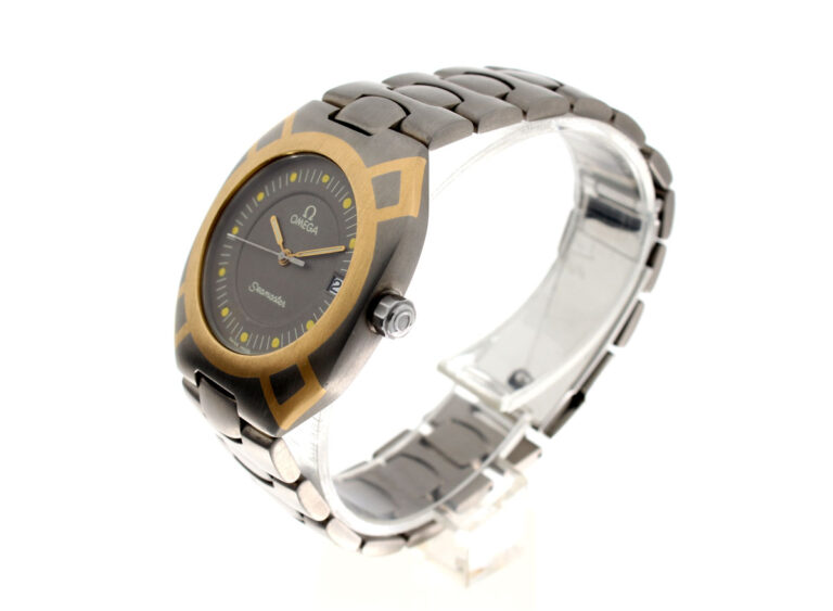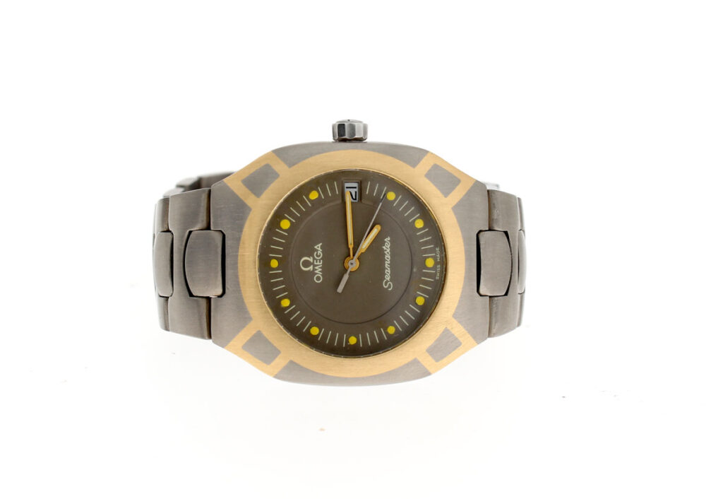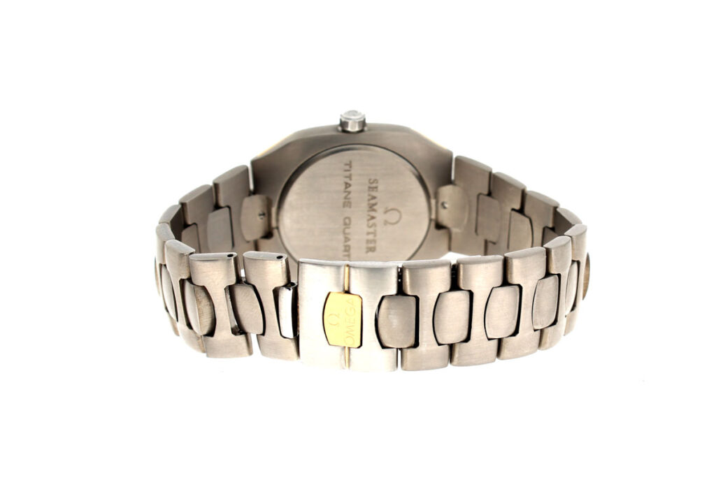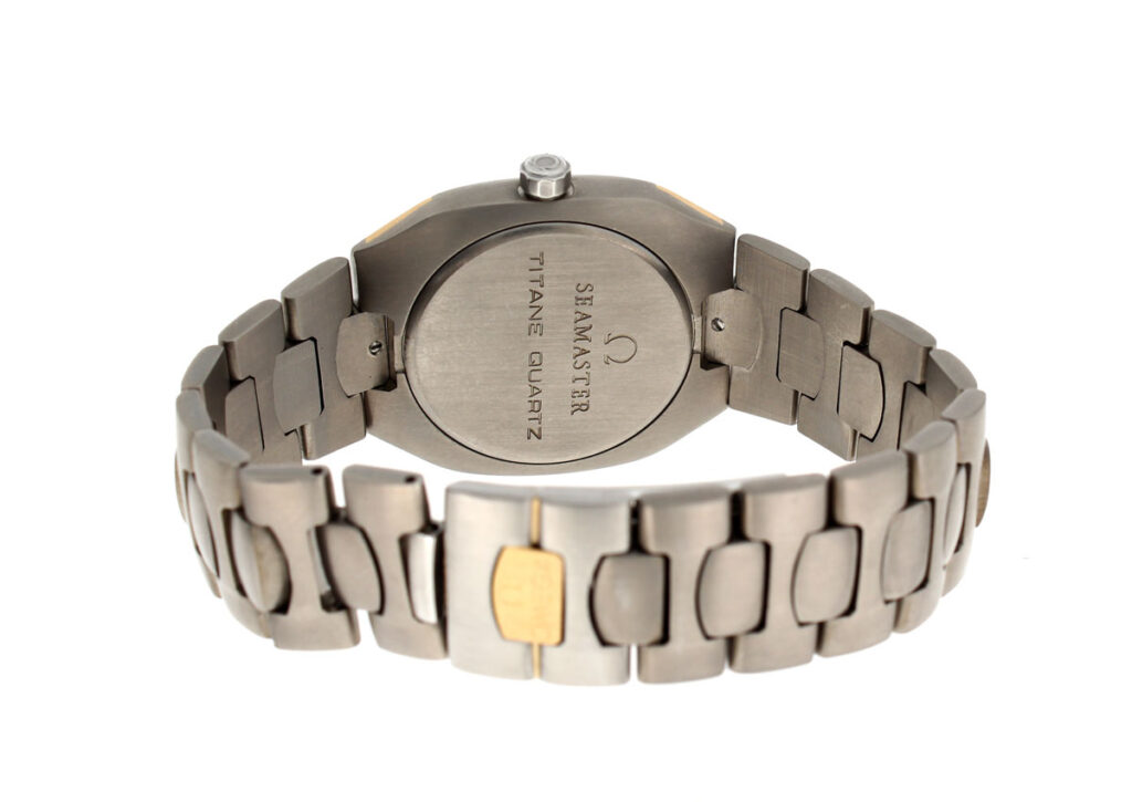 OMEGA Seamaster Polaris Armbanduhr mit Titan-/ Goldgehäuse, Quartzwerk, Saphirglas und verschraubter Krone.