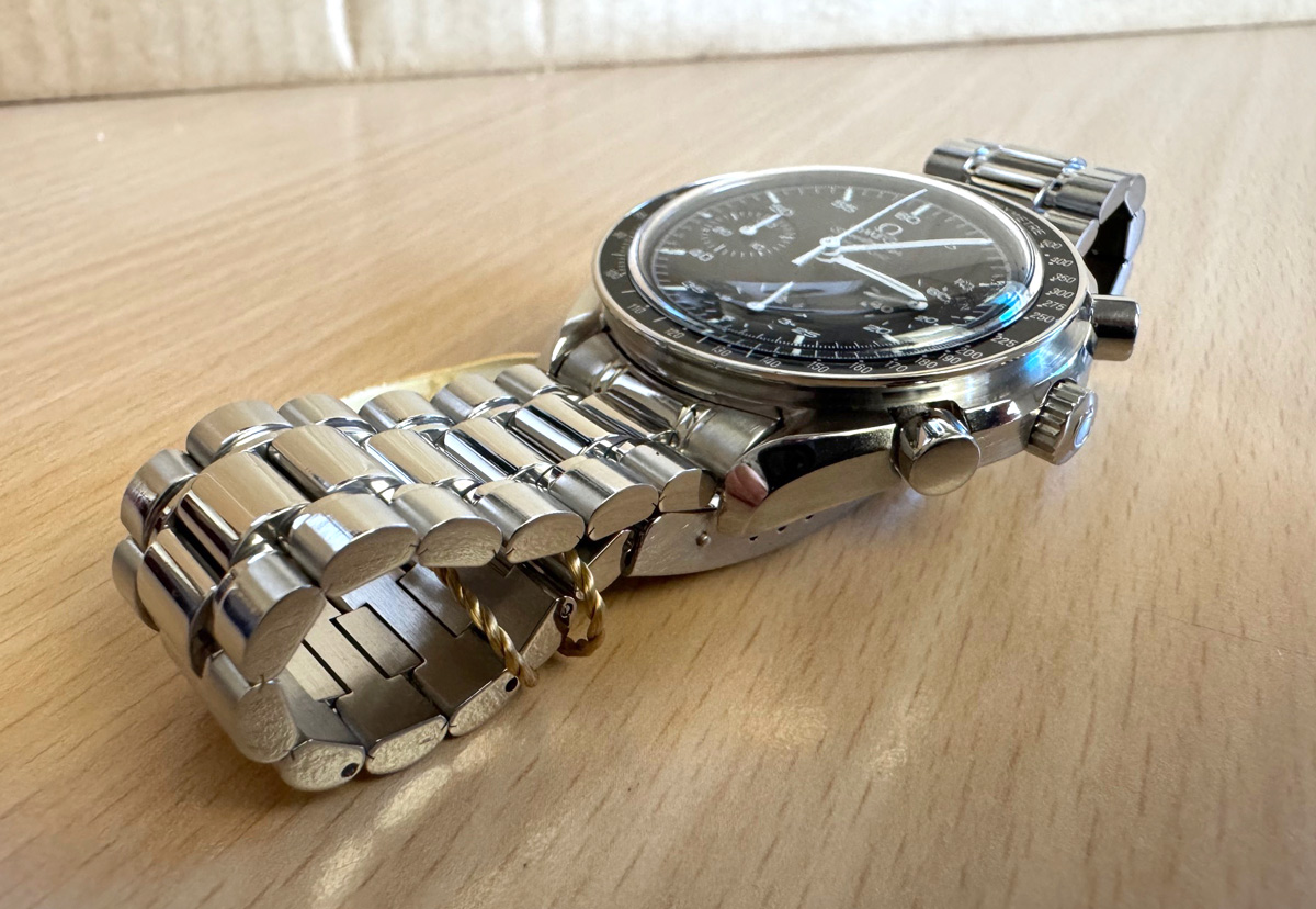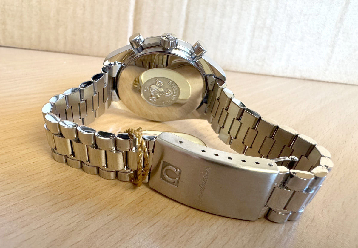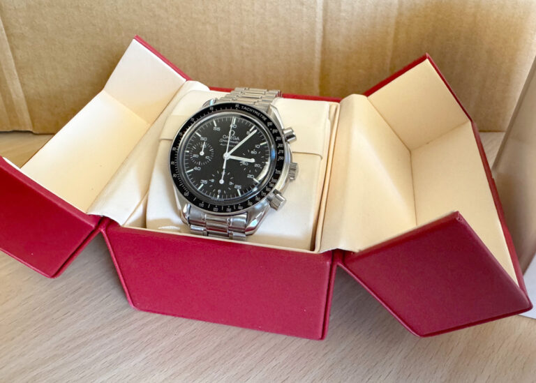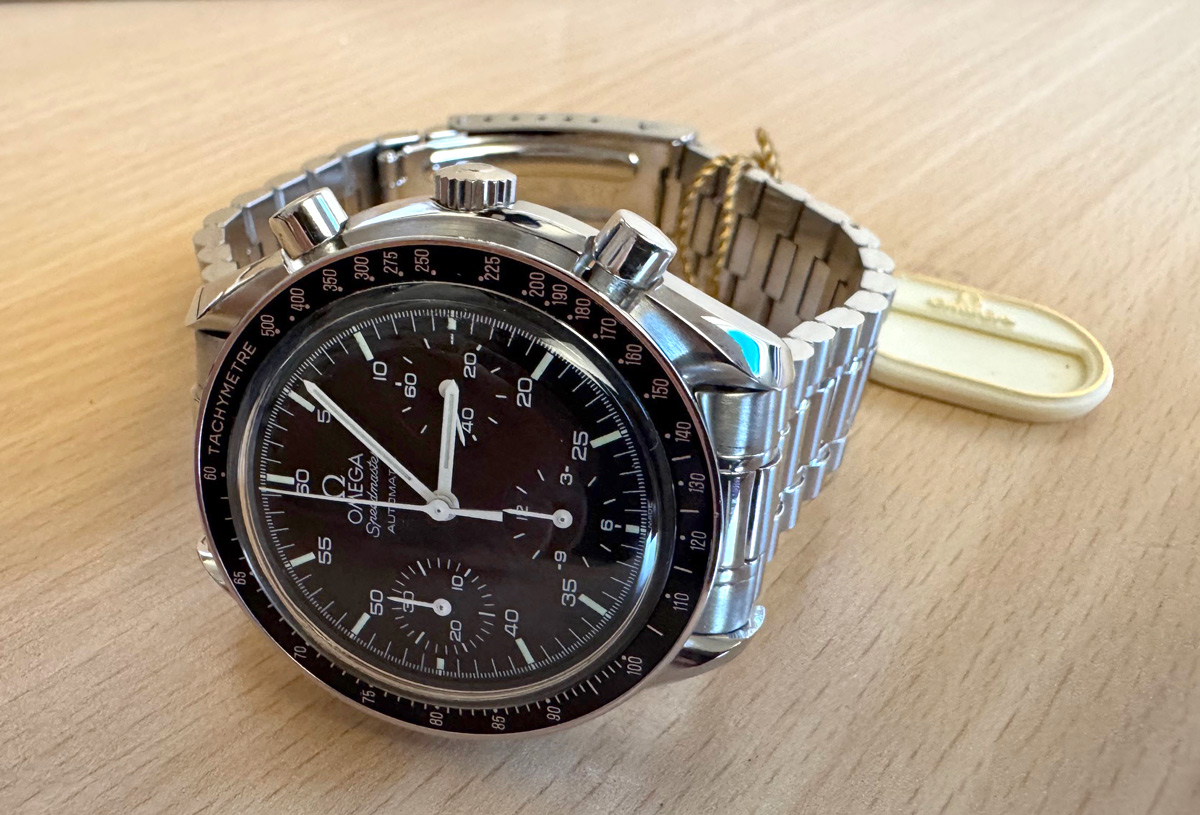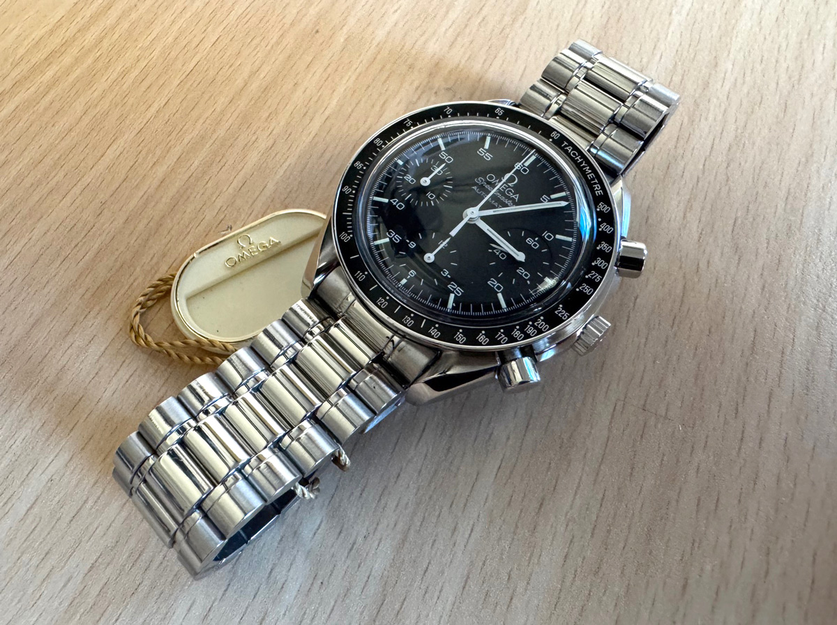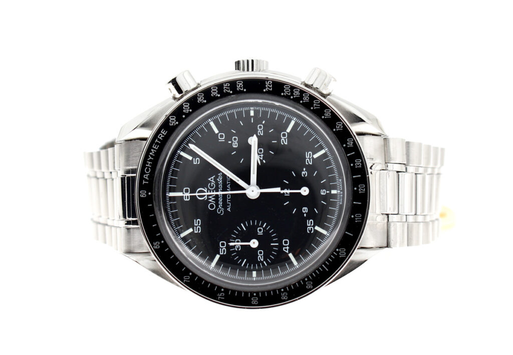 OMEGA Speedmaster (Reduced) Herren-Armbanduhr mit Edelstahlgehäuse, Automatikwerk, Stahlband mit Original Box.