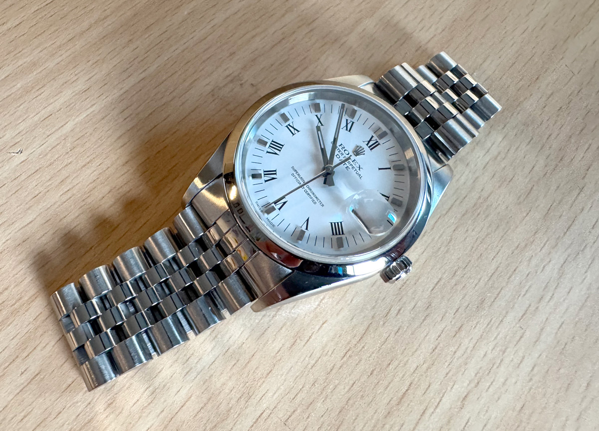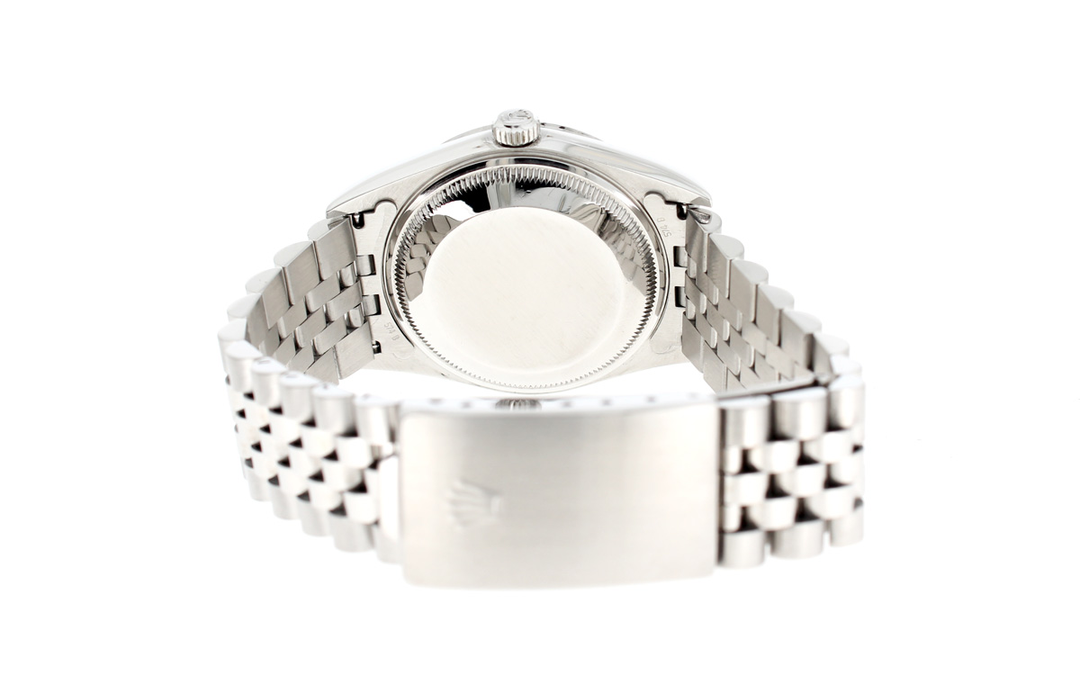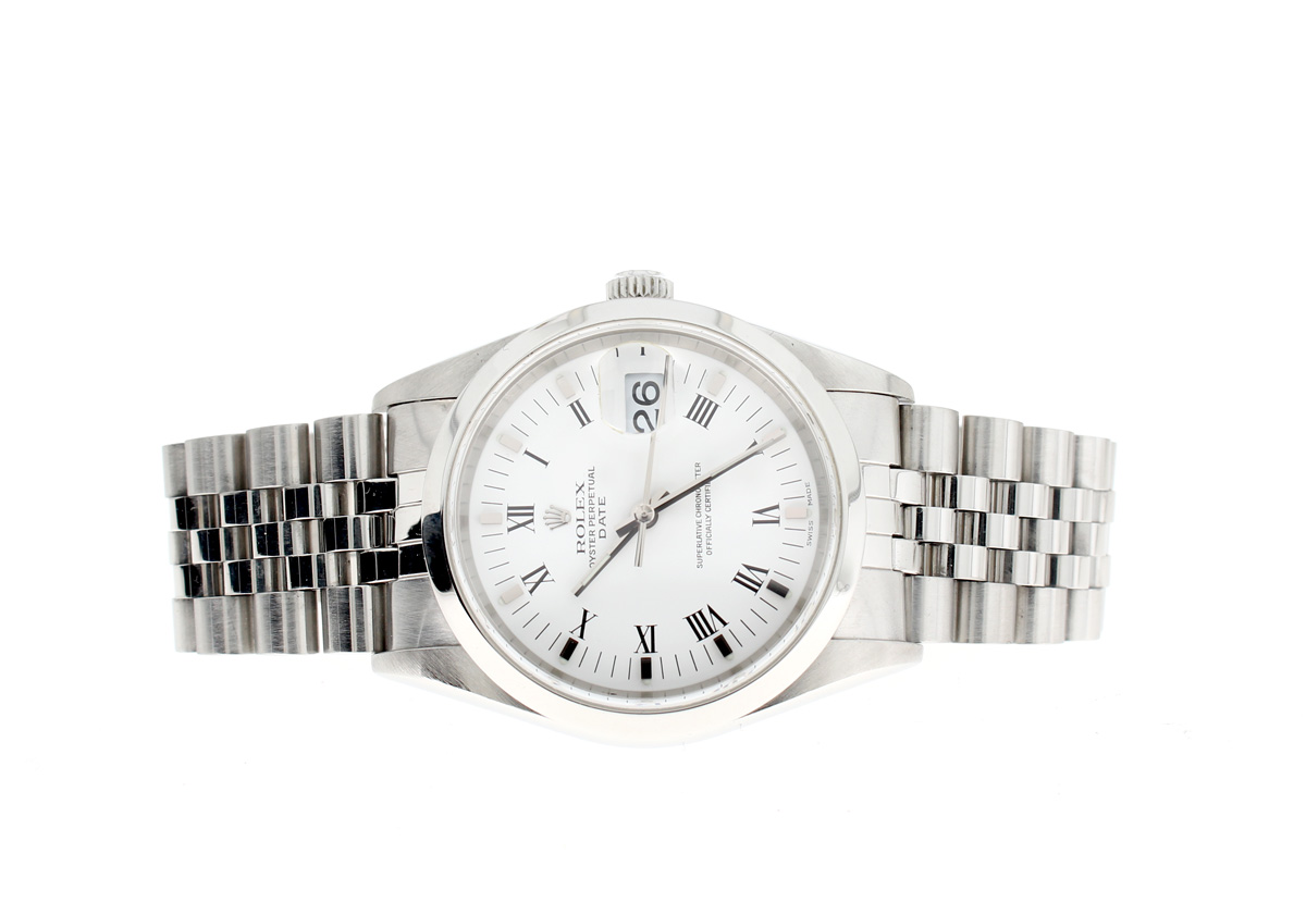 ROLEX Oyster Perpetual Date Herren-Armbanduhr mit Edelstahlgehäuse, Rolex-Automatikwerk, Schraubkrone und Datumslupe.