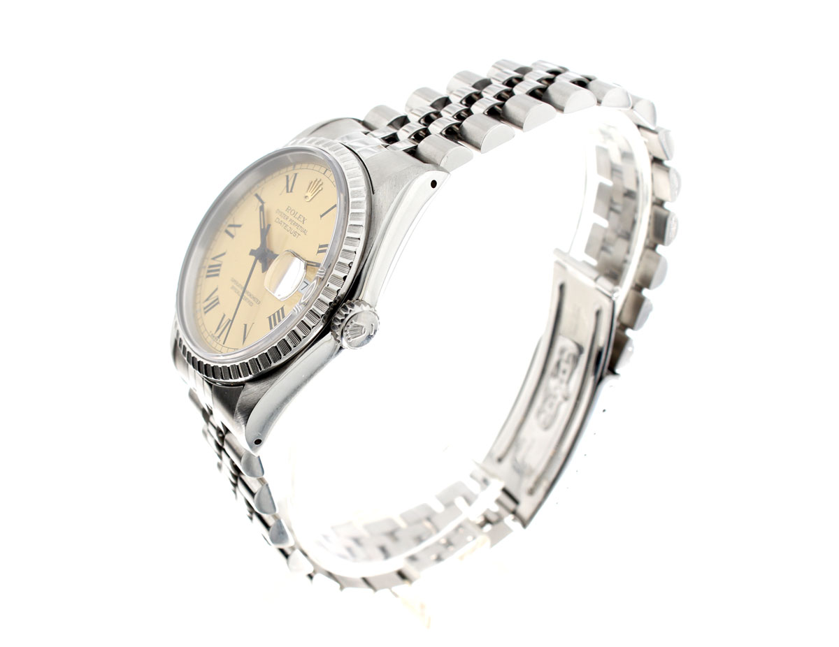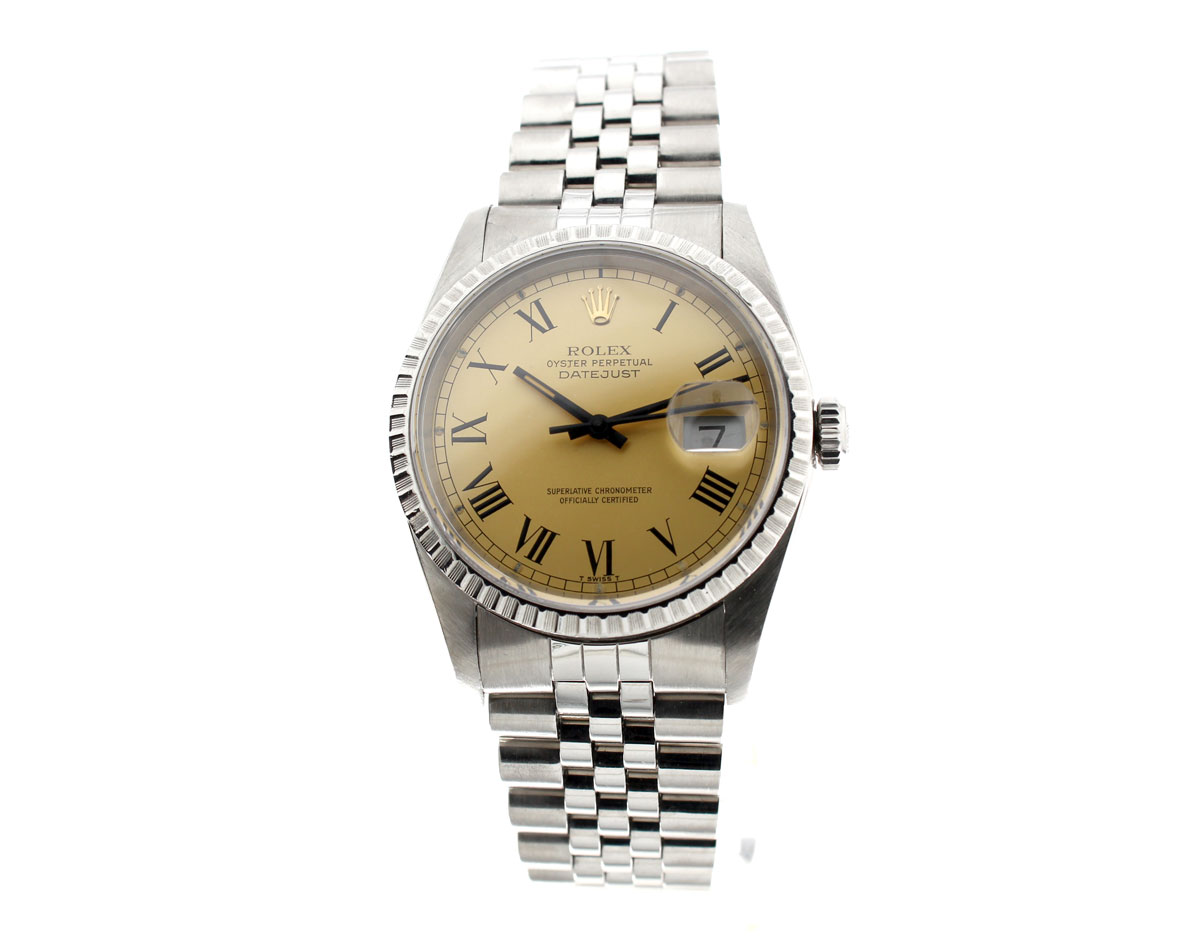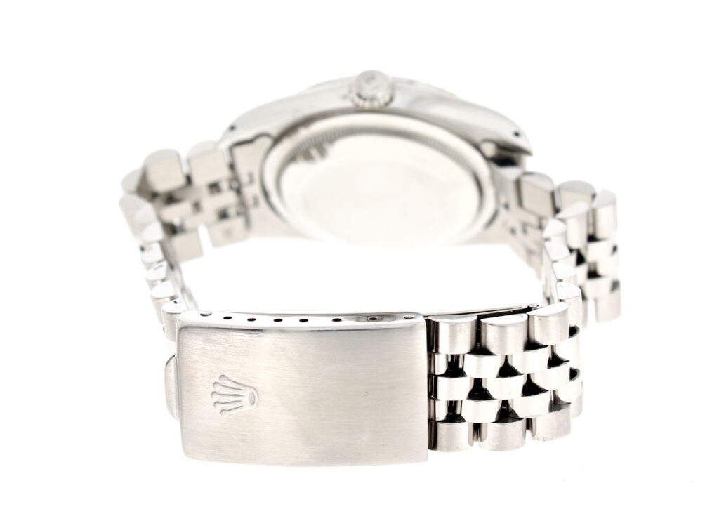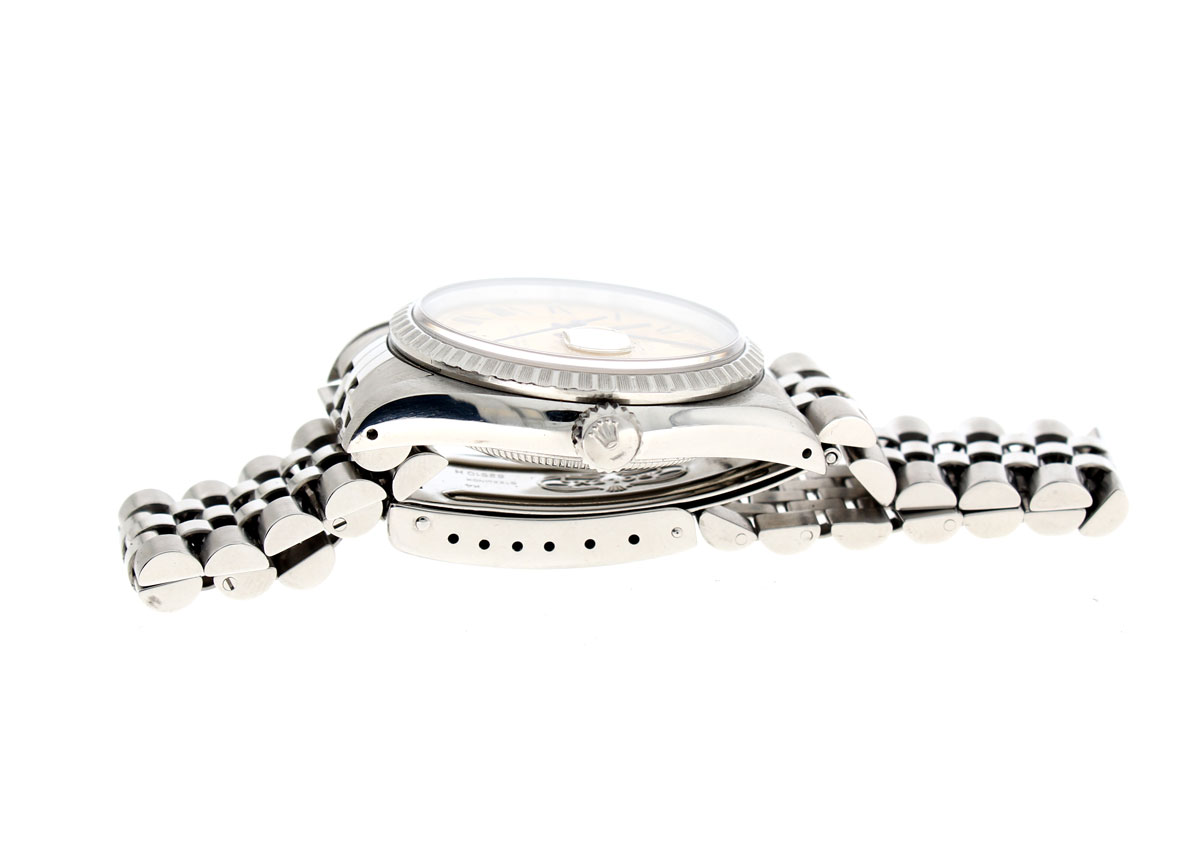 ROLEX Oyster Perpetual Datejust Herrenuhr mit Edelstahlgehäuse, Rolex-Automatikwerk, Schraubkrone und Datumslupe.