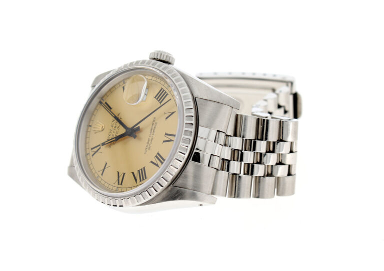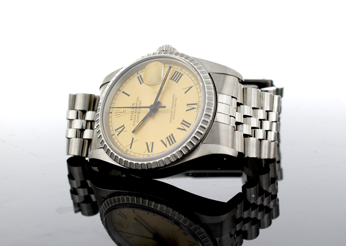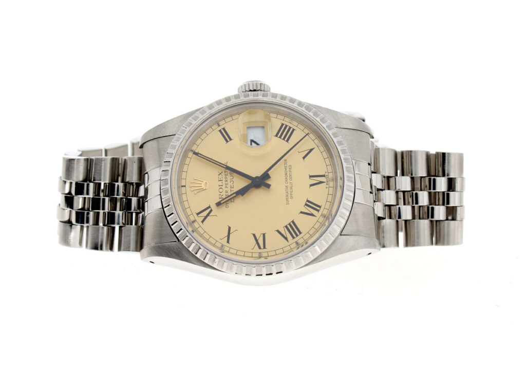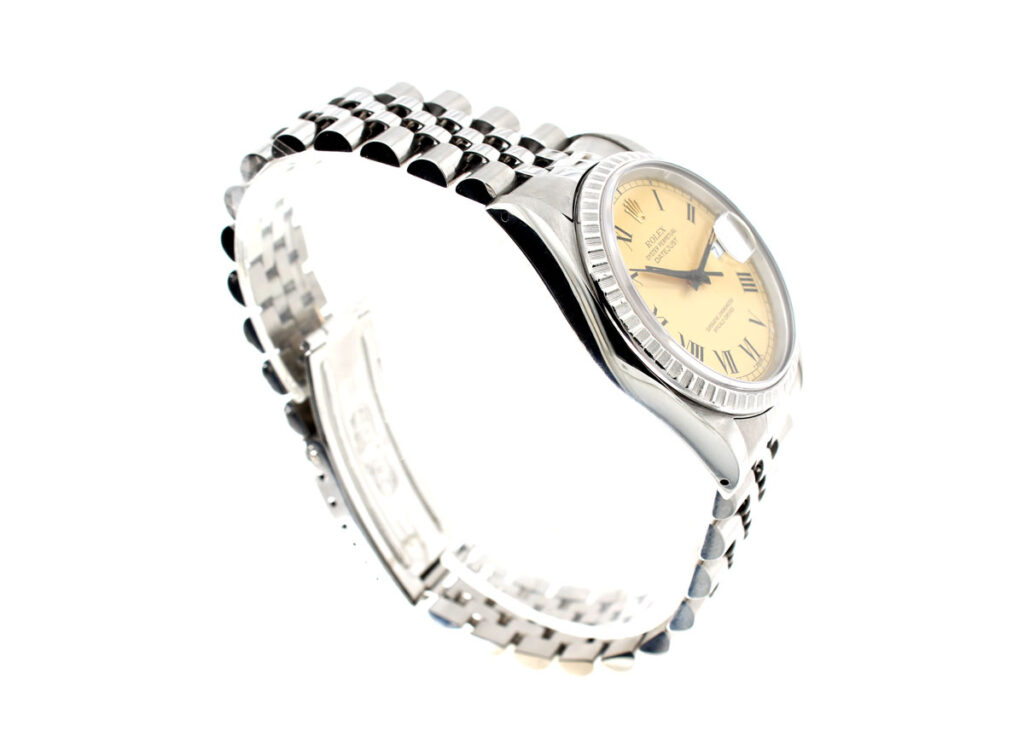 ROLEX Oyster Perpetual Datejust Herrenuhr mit Edelstahlgehäuse, Rolex-Automatikwerk, Schraubkrone und Datumslupe.
