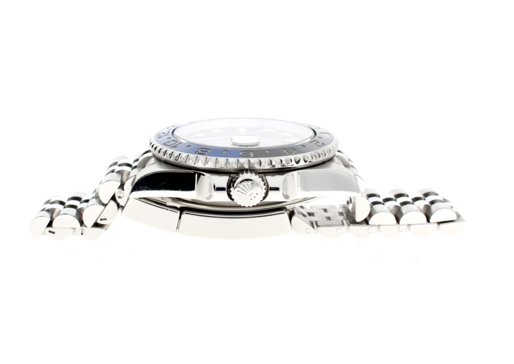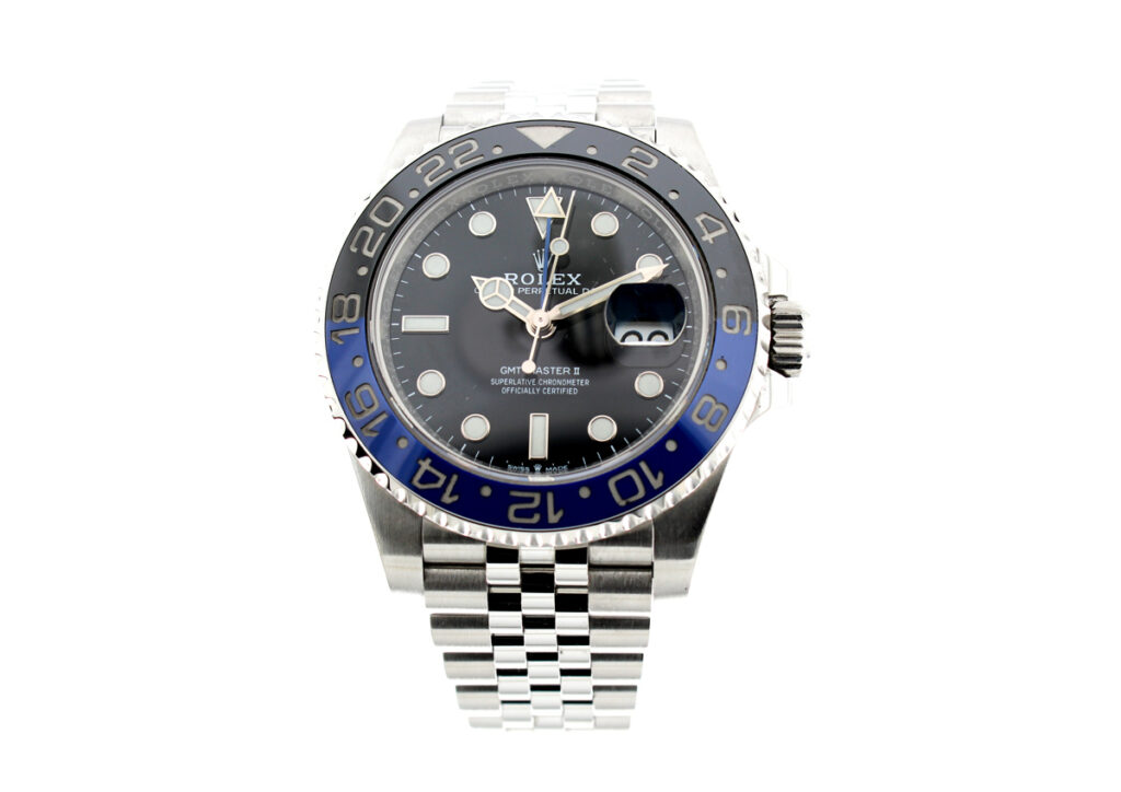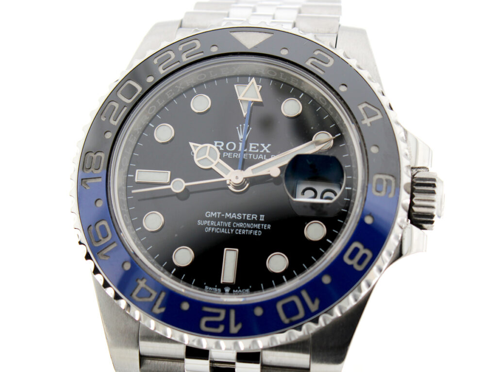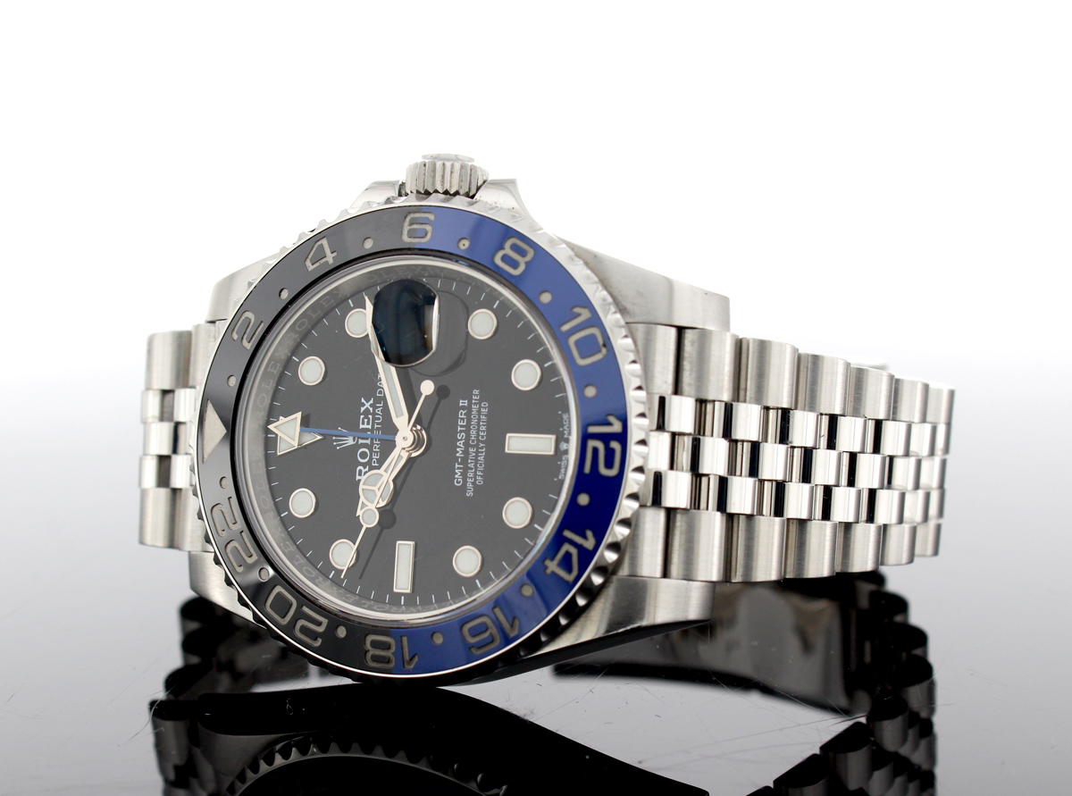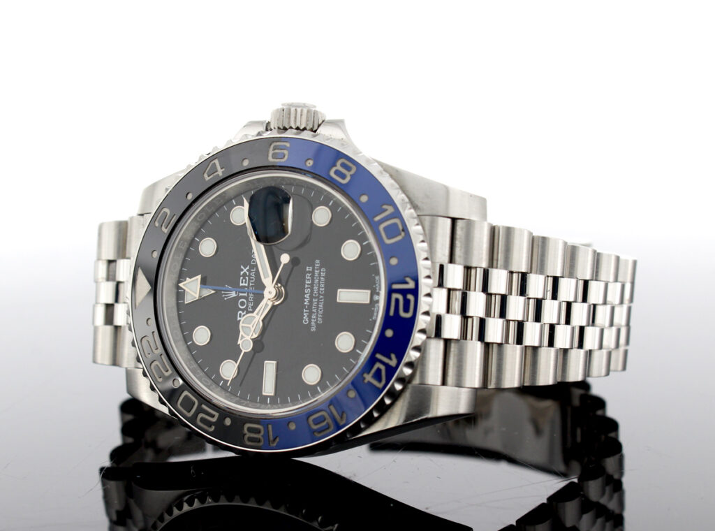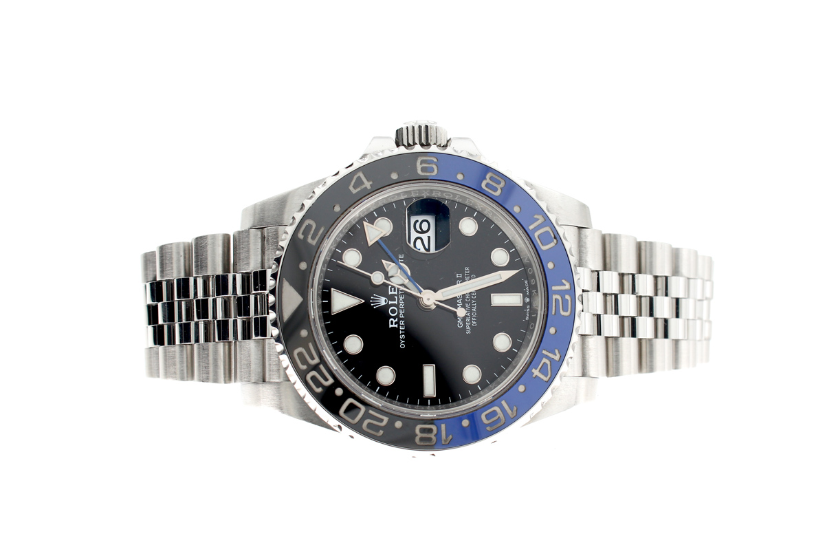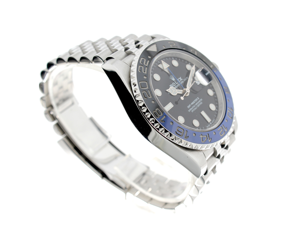 ROLEX Oyster Perpetual GMT Master II Herrenuhr mit Edelstahlgehäuse, Automatikwerk, blau-schwarzer Lünette, Triplock-Aufzugskrone im Full-Set.
