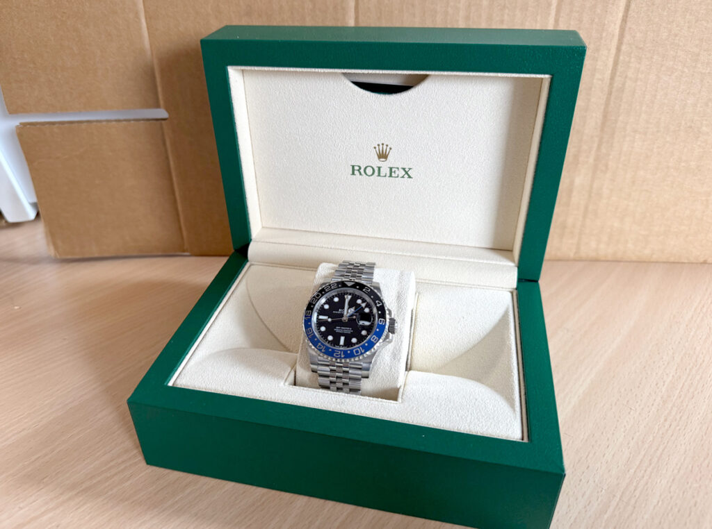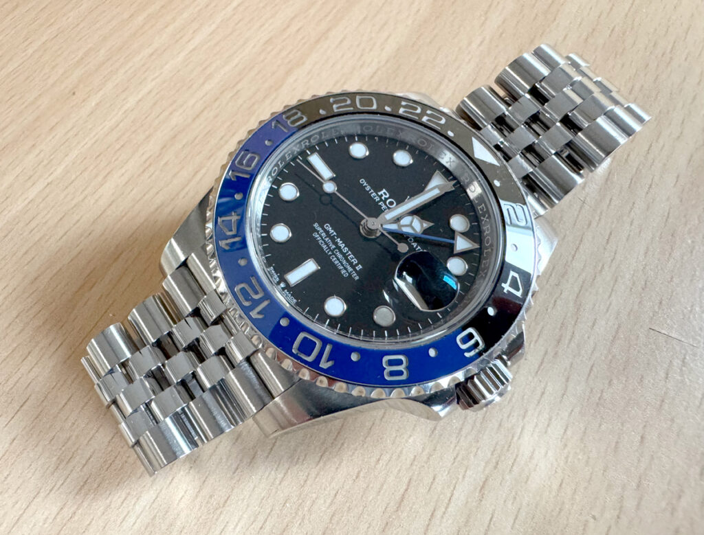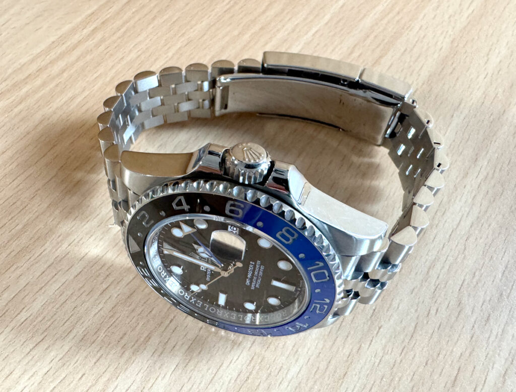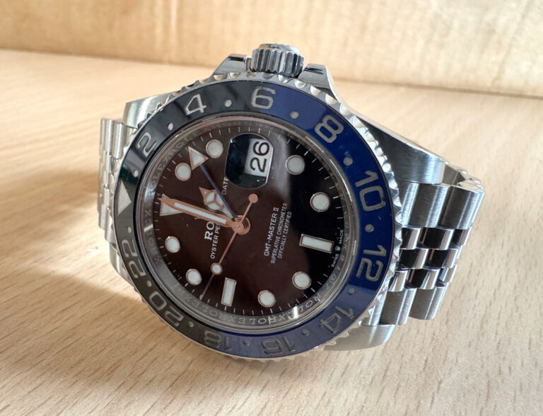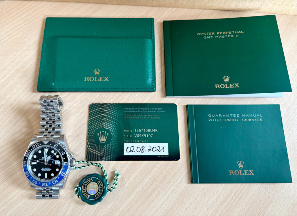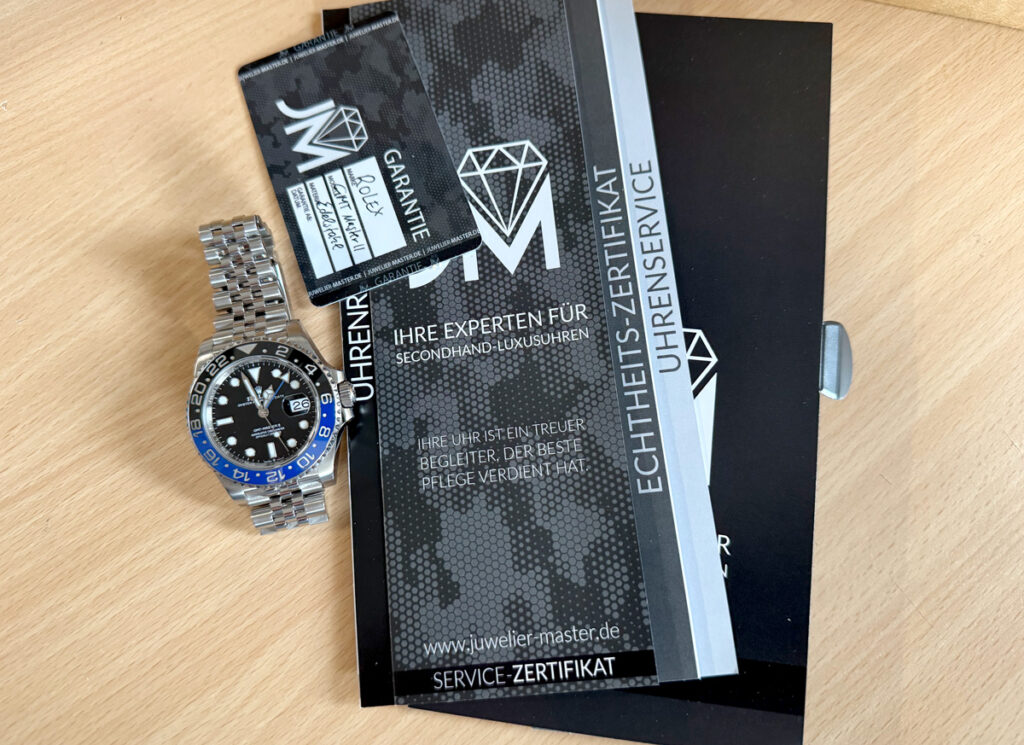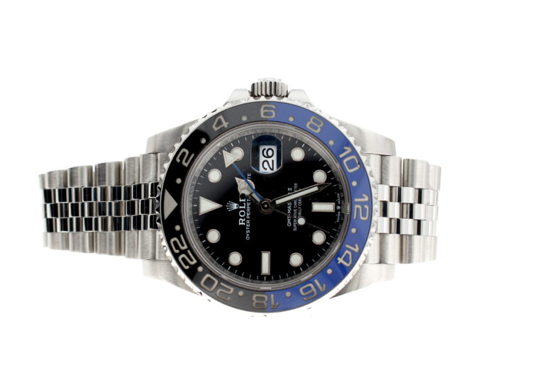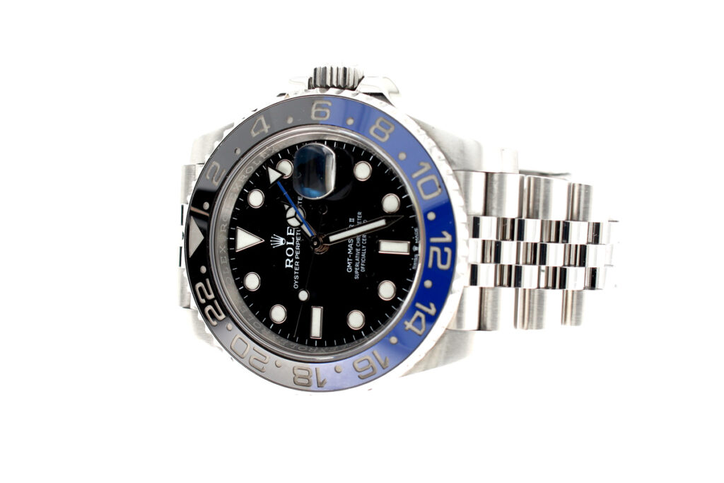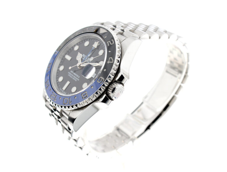 ROLEX Oyster Perpetual GMT Master II Herrenuhr mit Edelstahlgehäuse, Automatikwerk, blau-schwarzer Lünette, Triplock-Aufzugskrone im Full-Set.