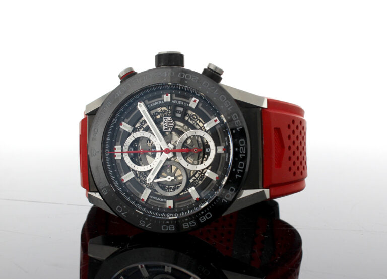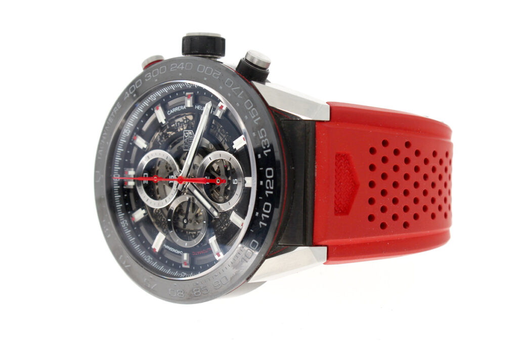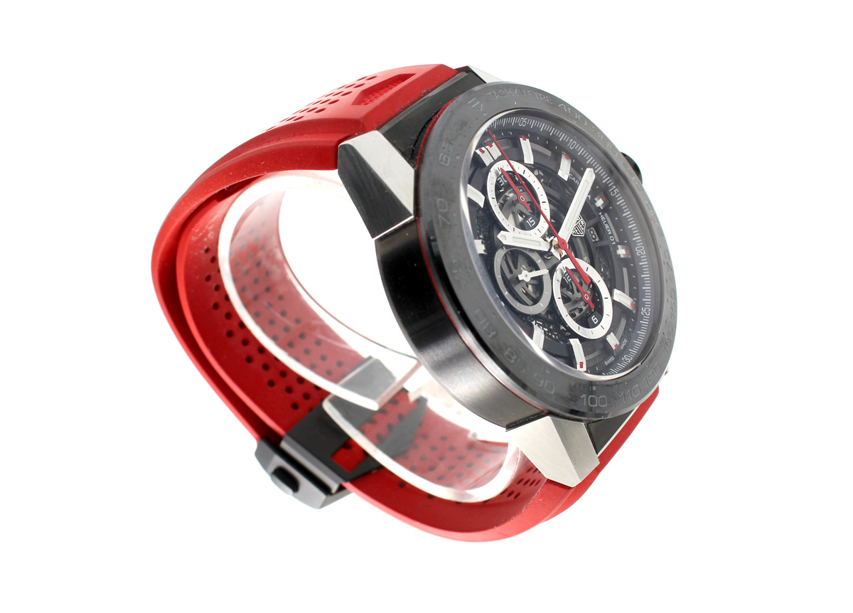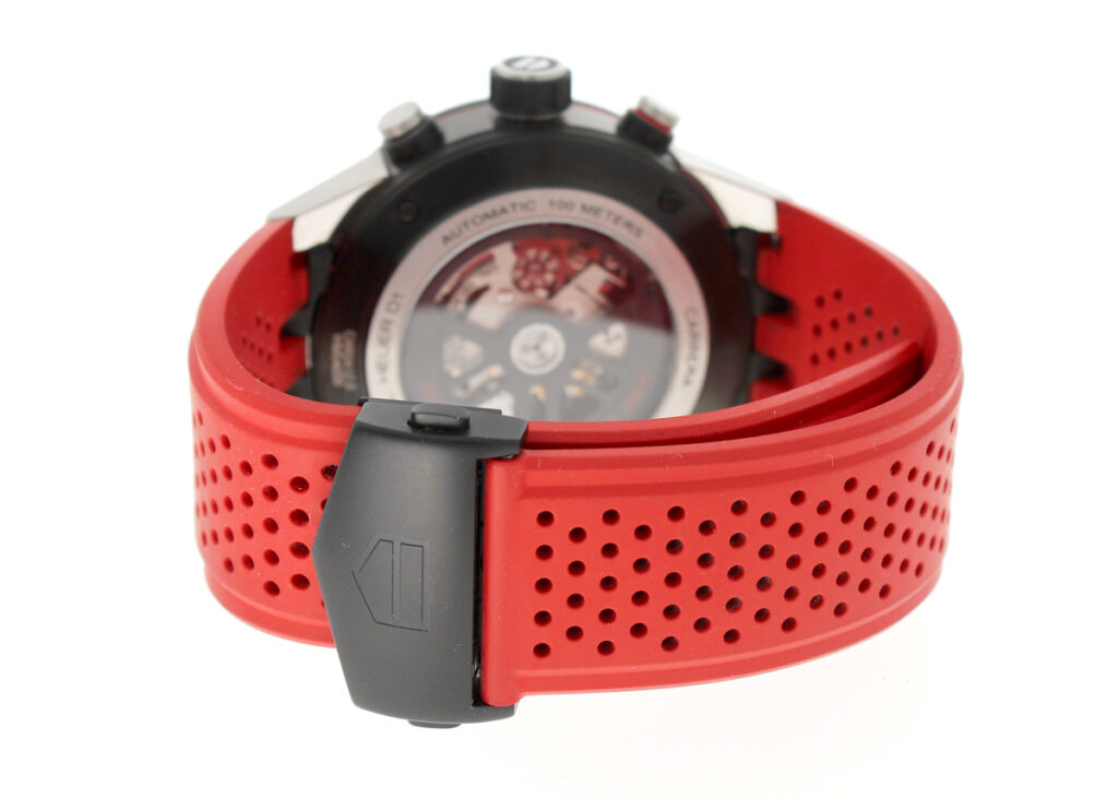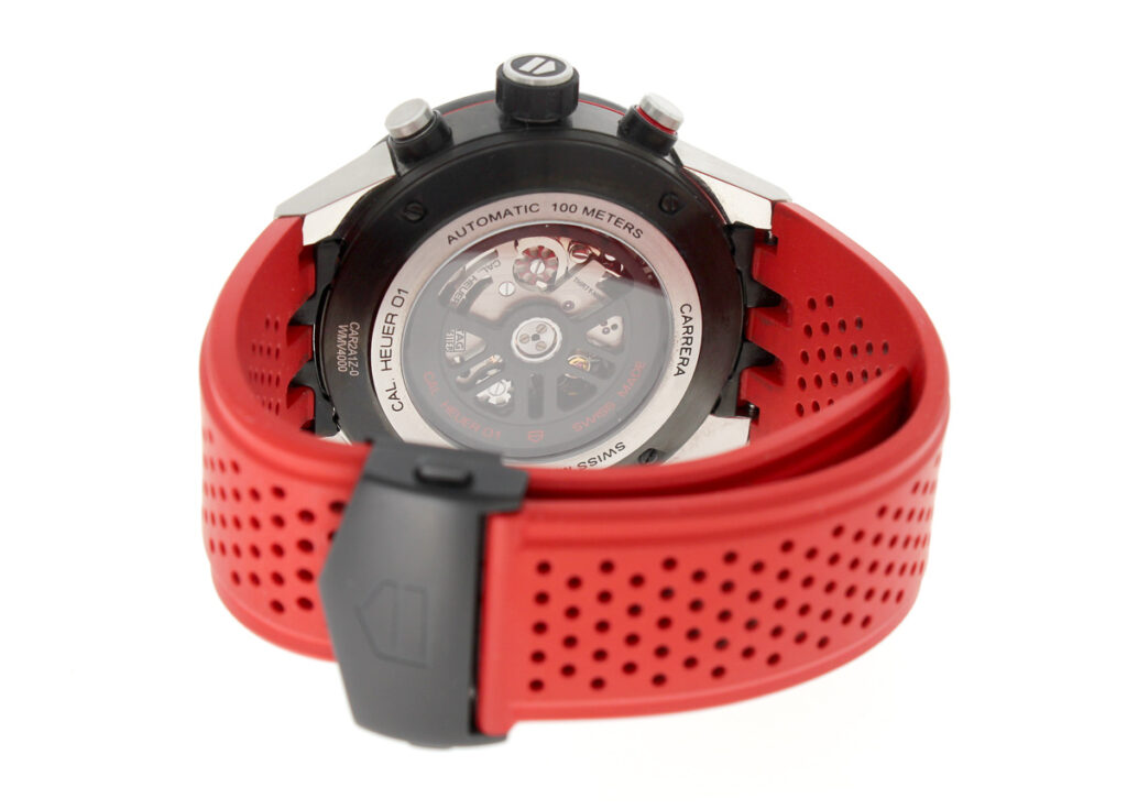 TAG HEUER Carrera 01 Herrenuhr mit Keramikgehäuse, Automatikwerk, Kautschukband und Glasboden.