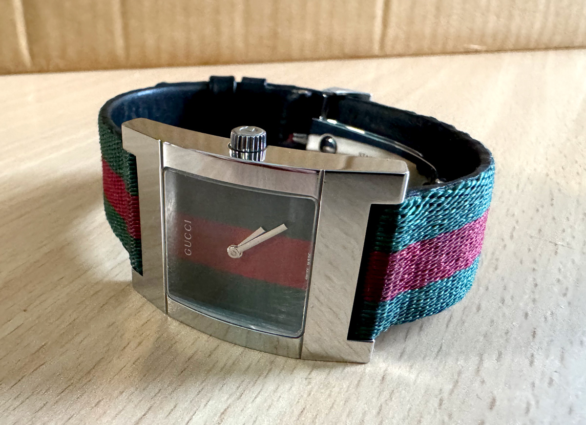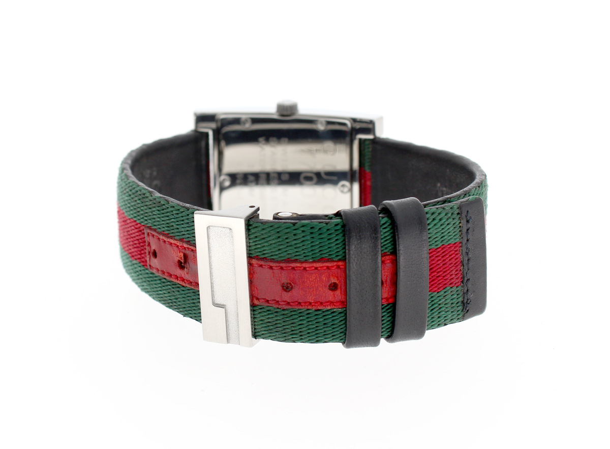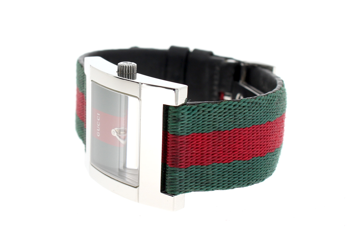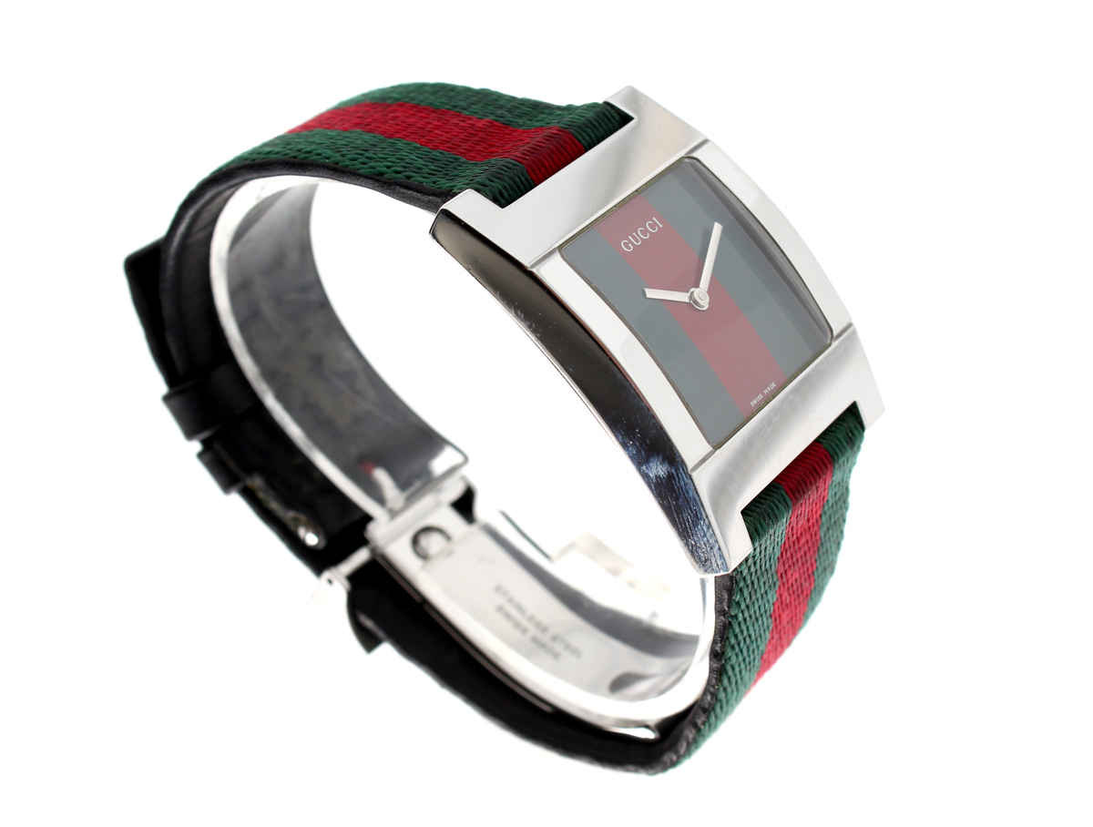 GUCCI Armbanduhr mit Edelstahlgehäuse, ETA-Quarzwerk, original Gucci-Faltschließe und Gucci-Textilband.