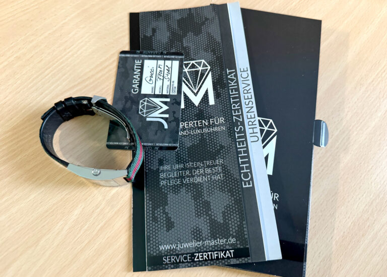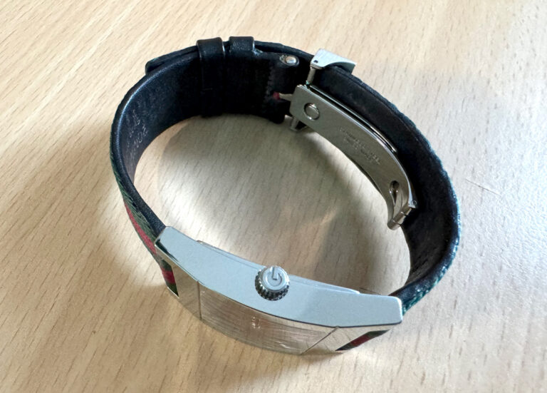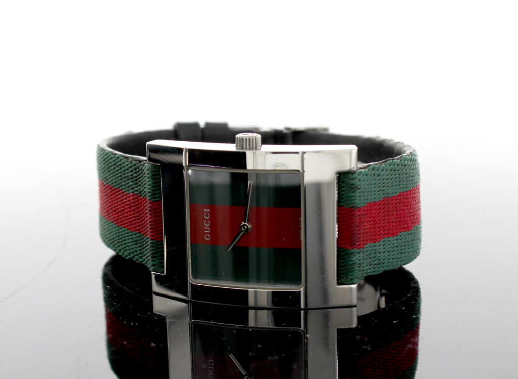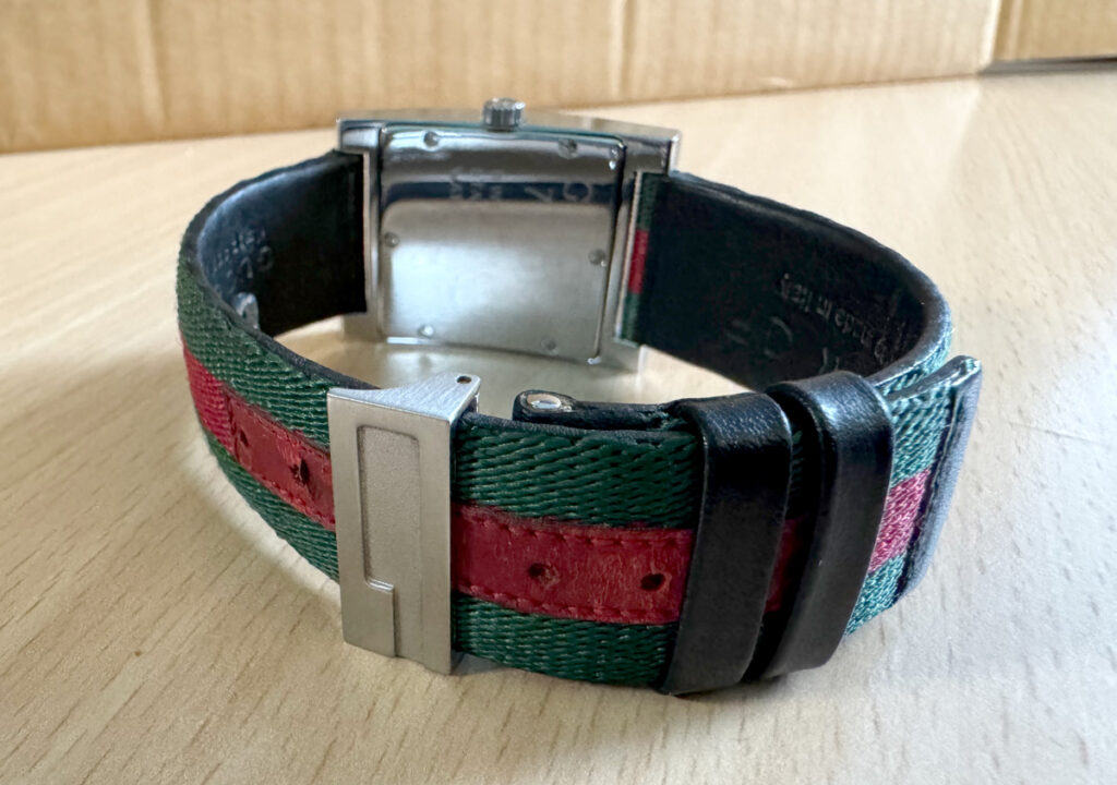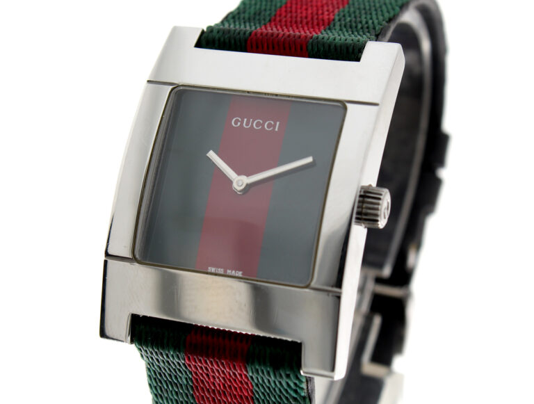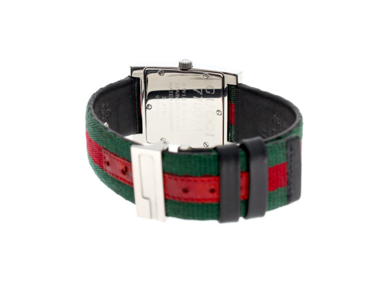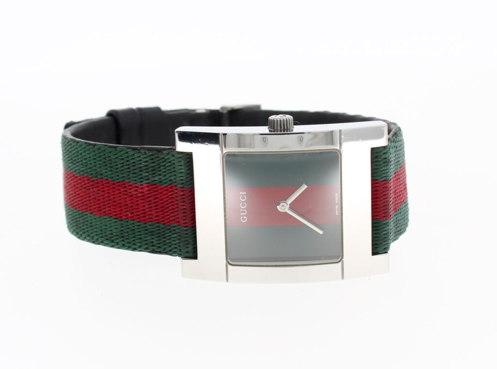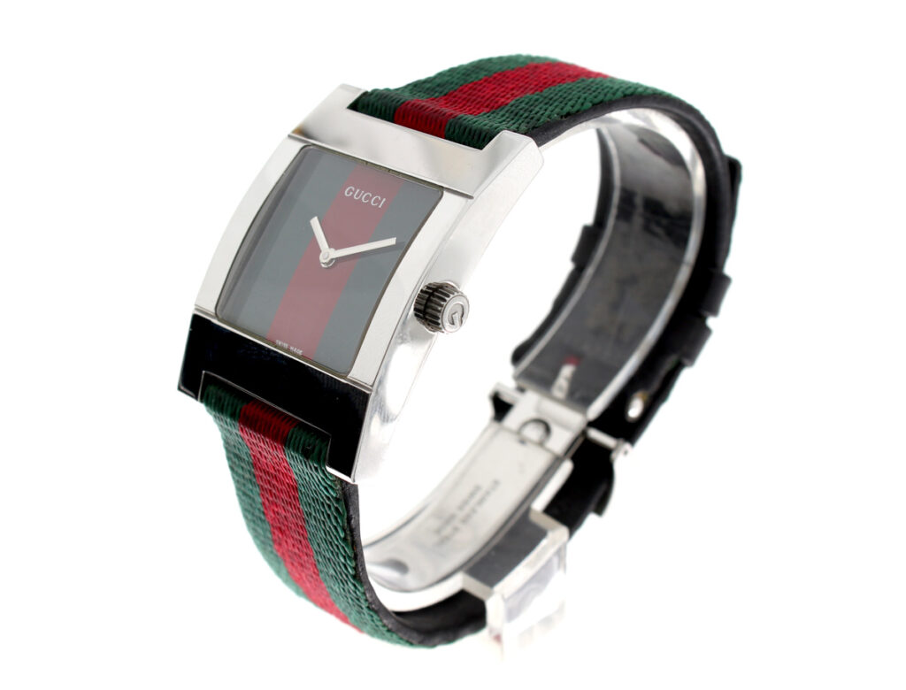 GUCCI Armbanduhr mit Edelstahlgehäuse, ETA-Quarzwerk, original Gucci-Faltschließe und Gucci-Textilband.