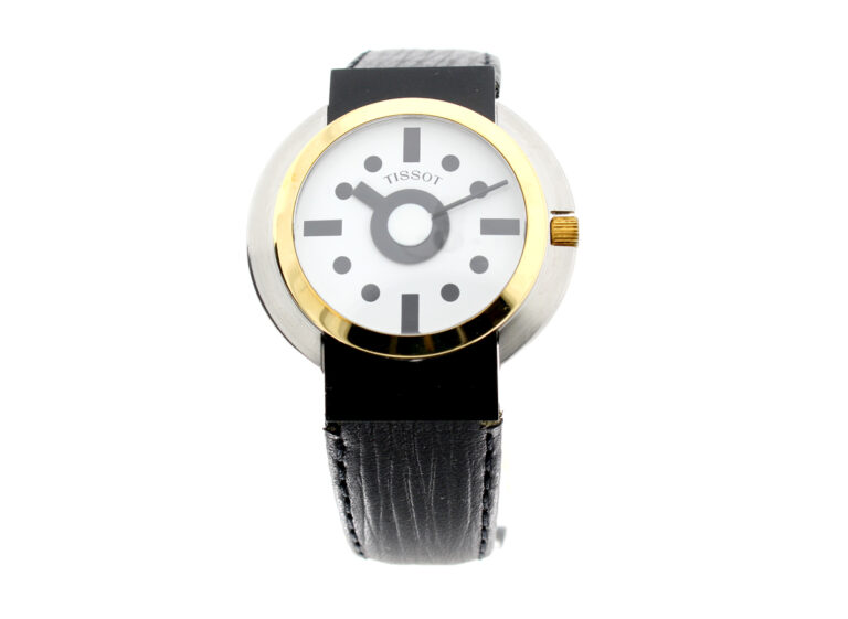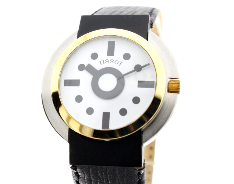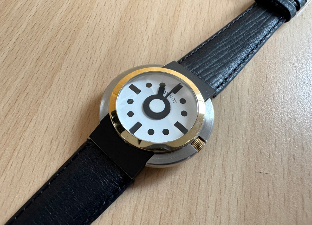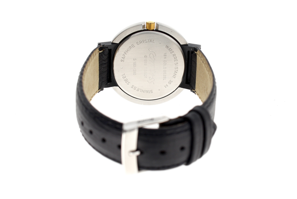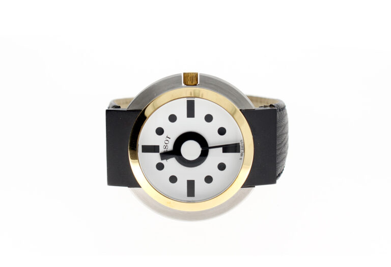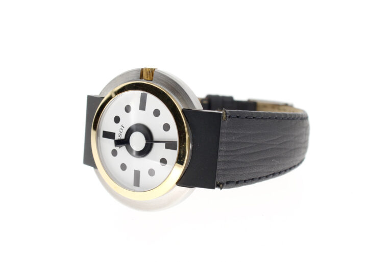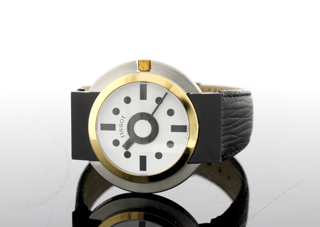 TISSOT Sottsass Armbanduhr, Edelstahlgehäuse mit goldener Lünette, ETA-Quartzwerk und originaler Dornschließe.