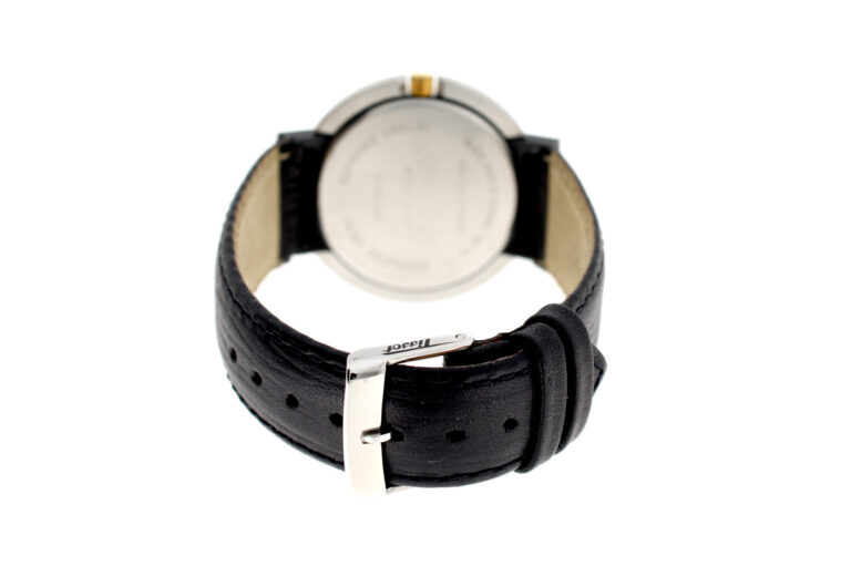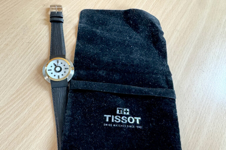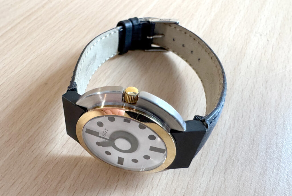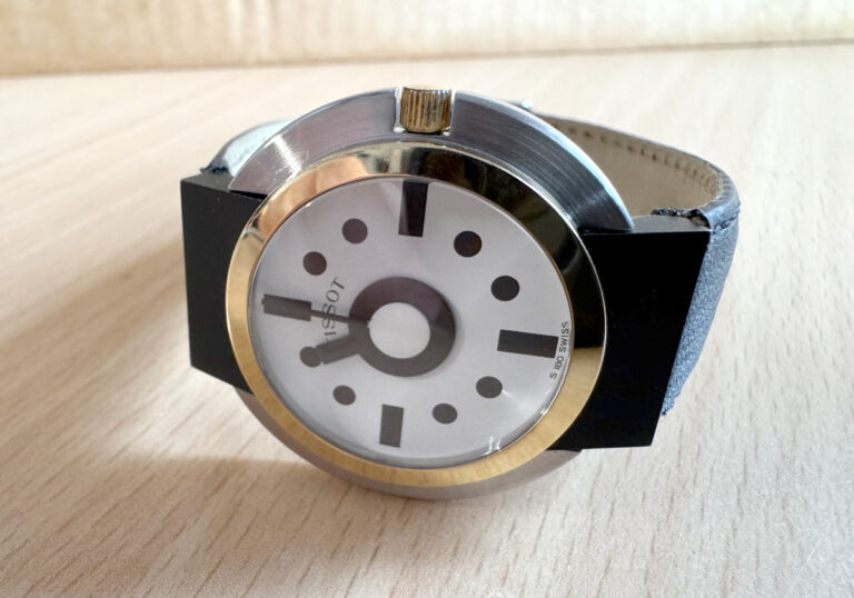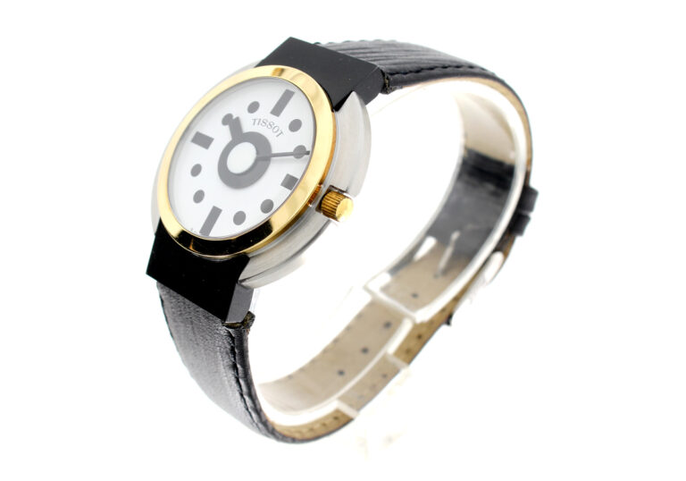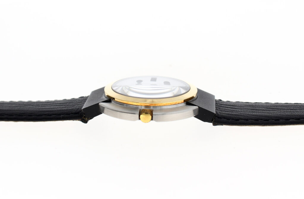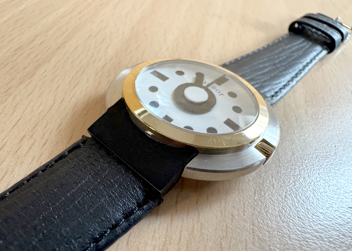 TISSOT Sottsass Armbanduhr, Edelstahlgehäuse mit goldener Lünette, ETA-Quartzwerk und originaler Dornschließe.